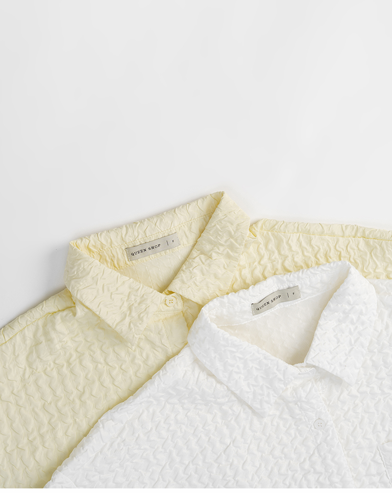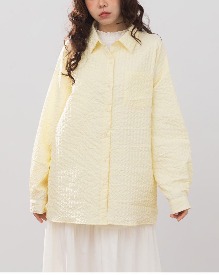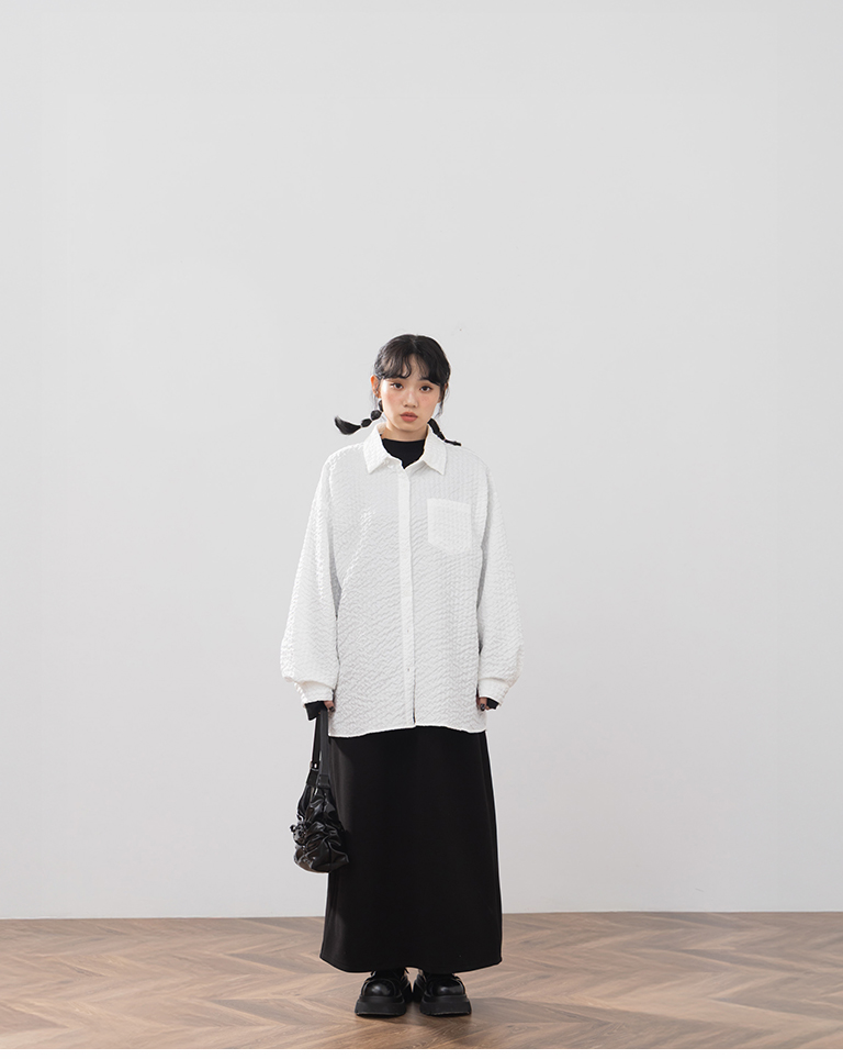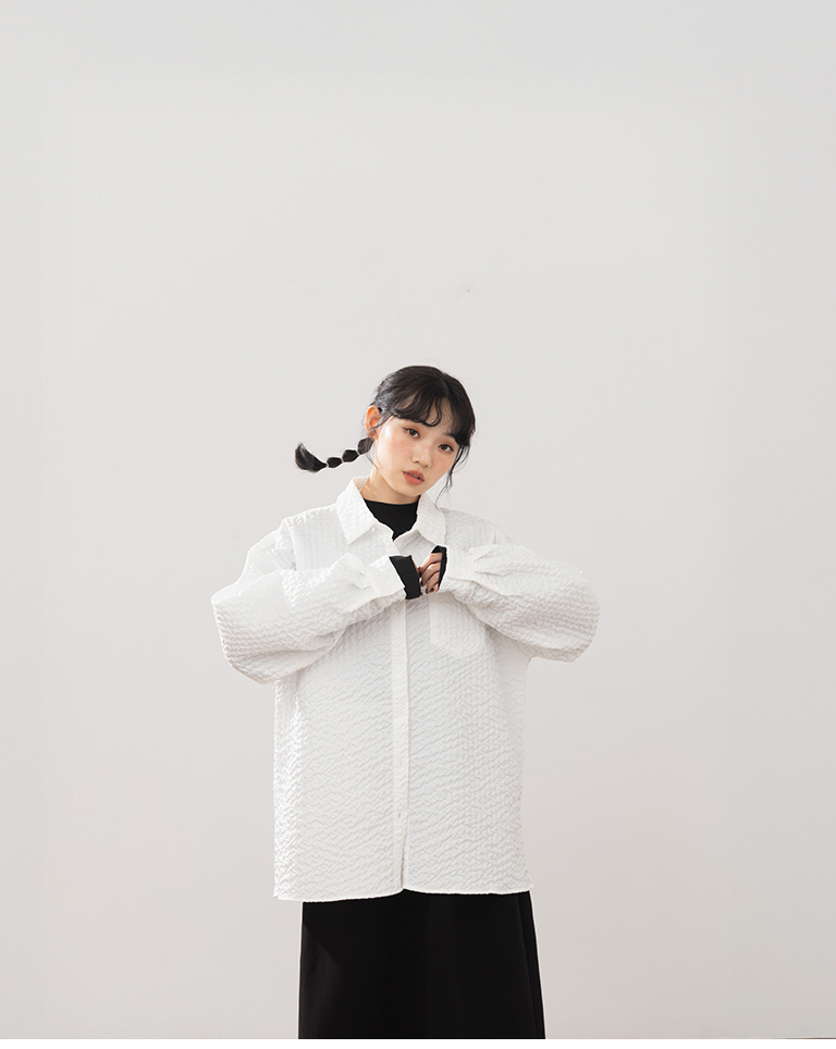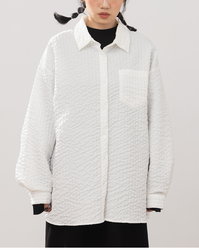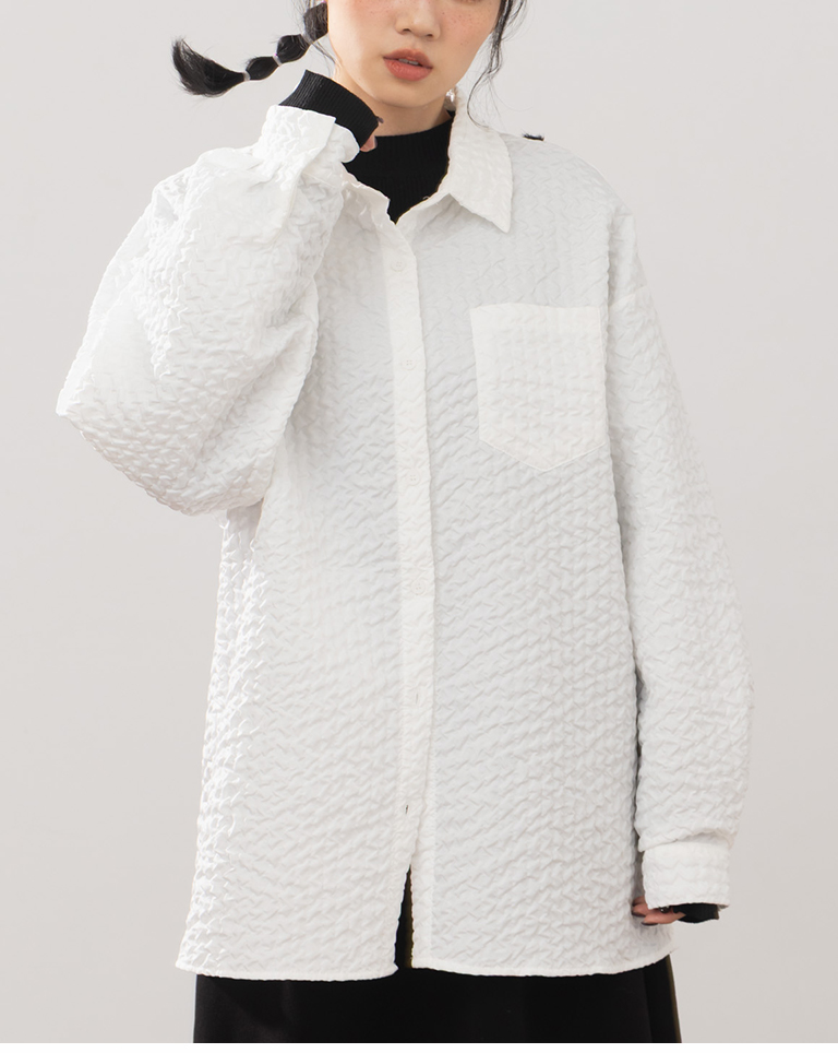 Three-dimensional wrinkled textured jacquard long-sleeved shirt, available in two colors.