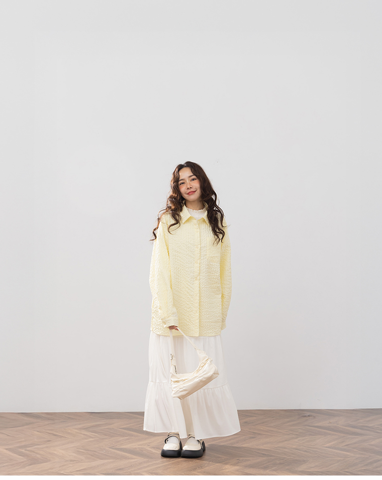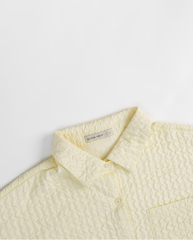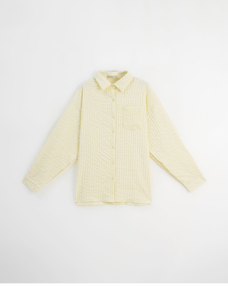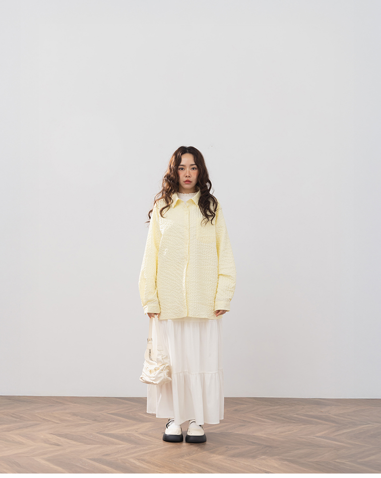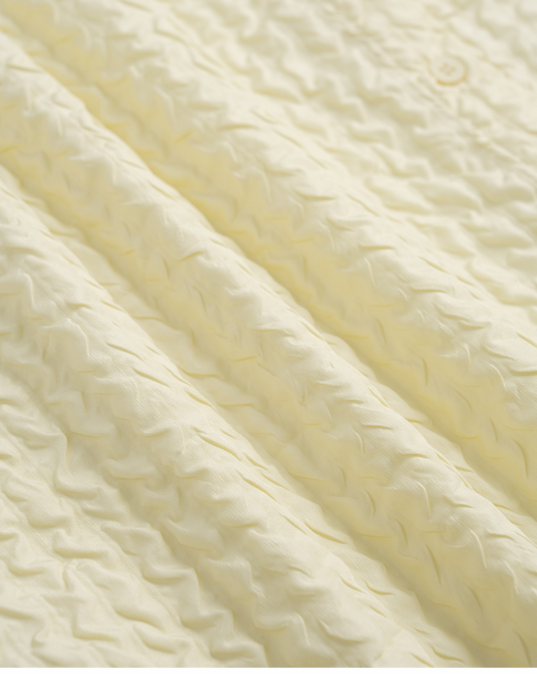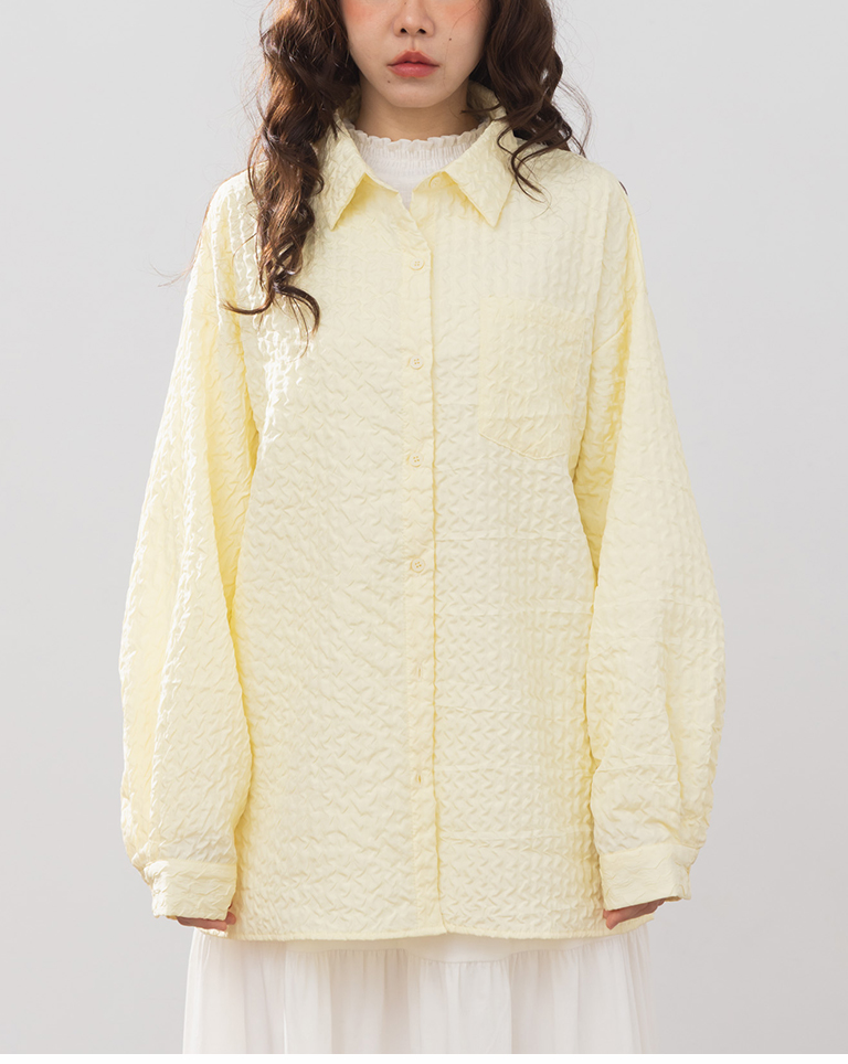 Three-dimensional wrinkled textured jacquard long-sleeved shirt, available in two colors.