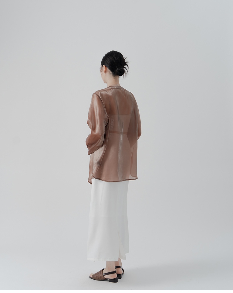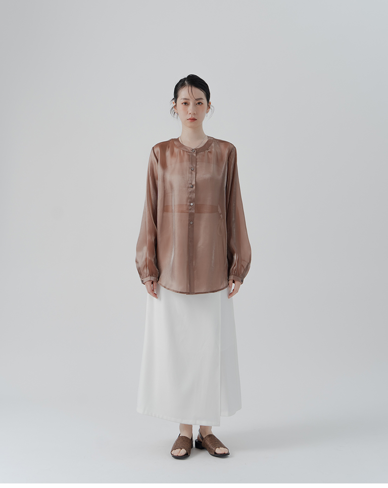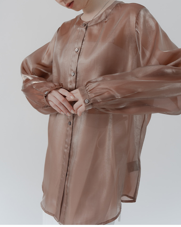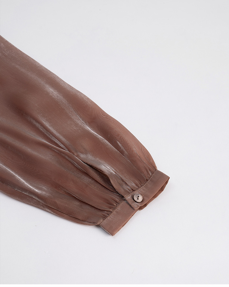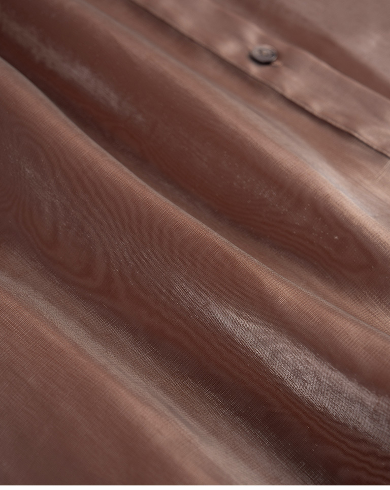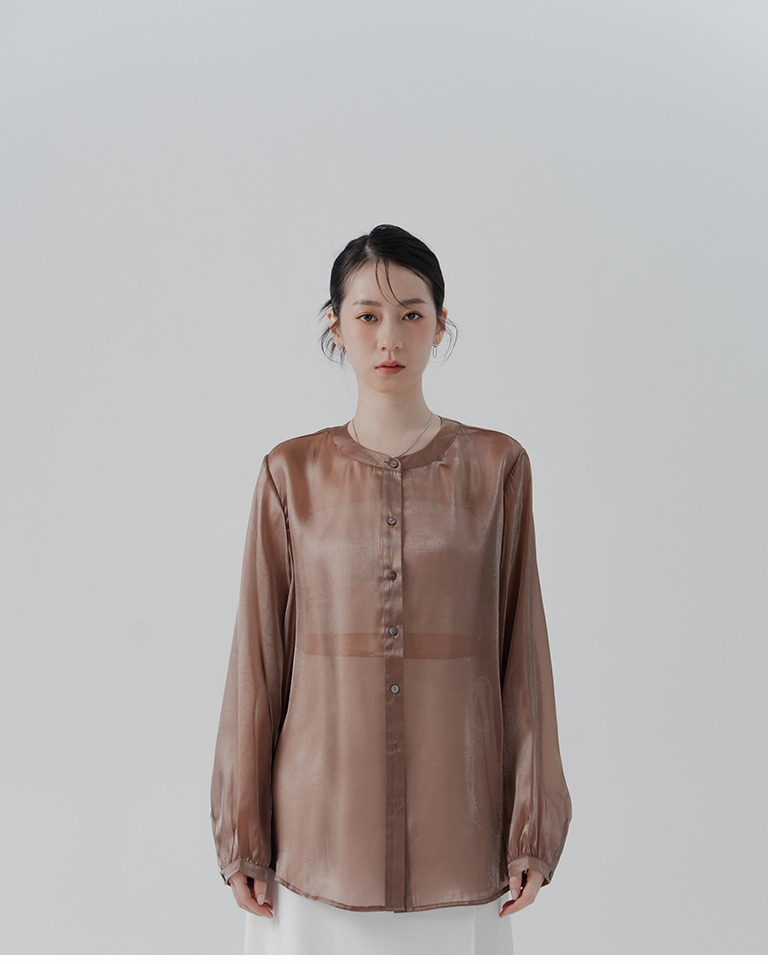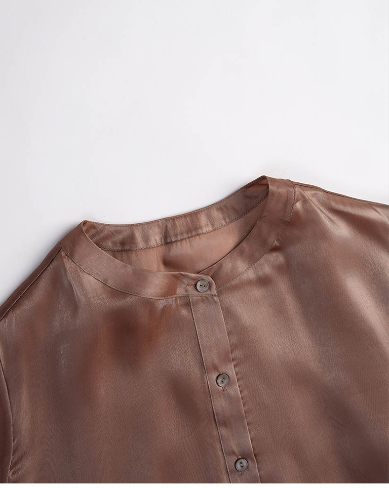 Glossy Zhongshan Collar Sheer Long Sleeve Shirt - Brown