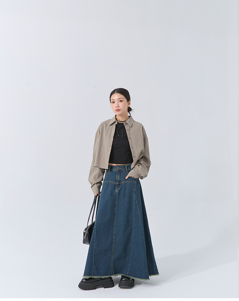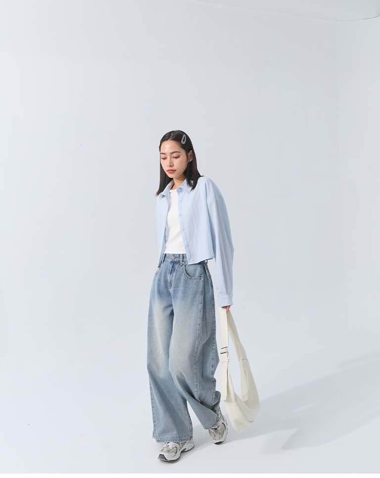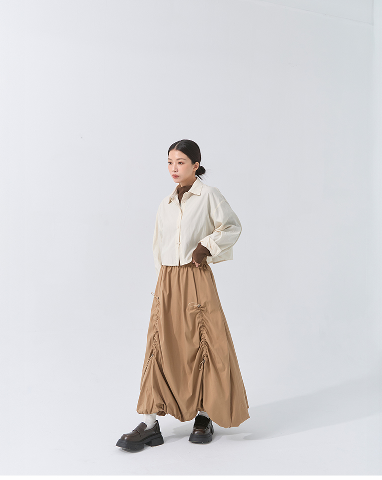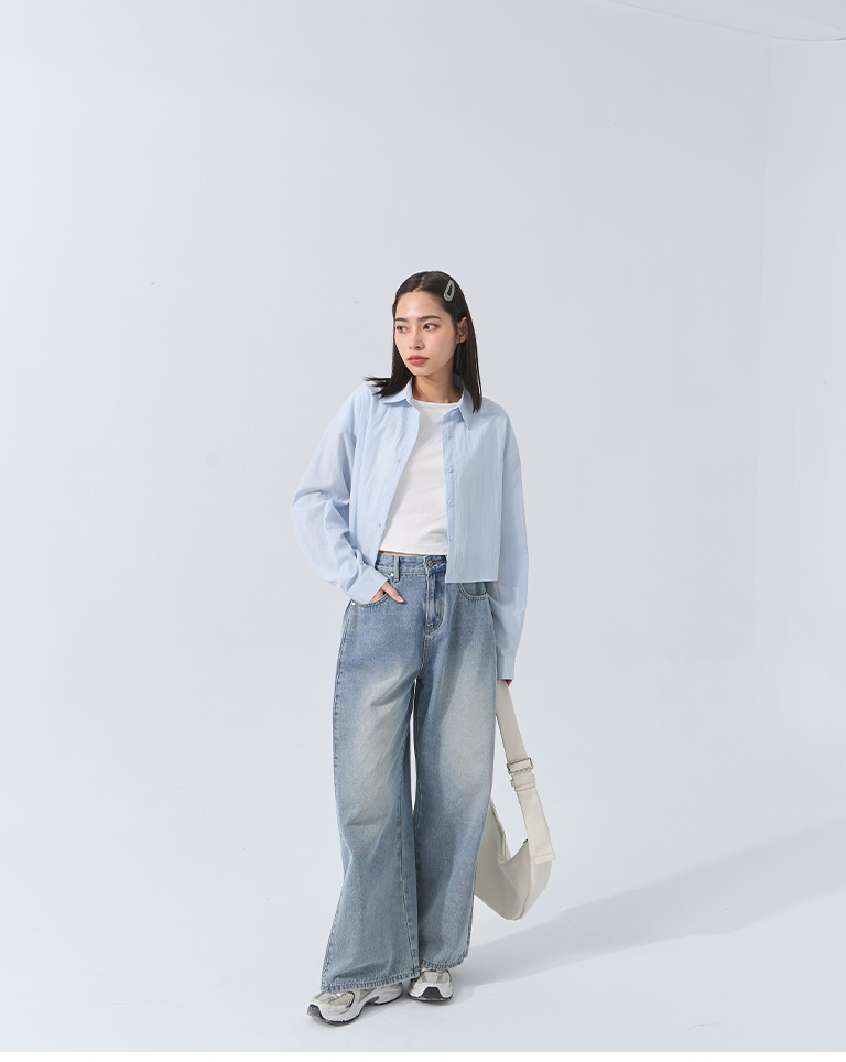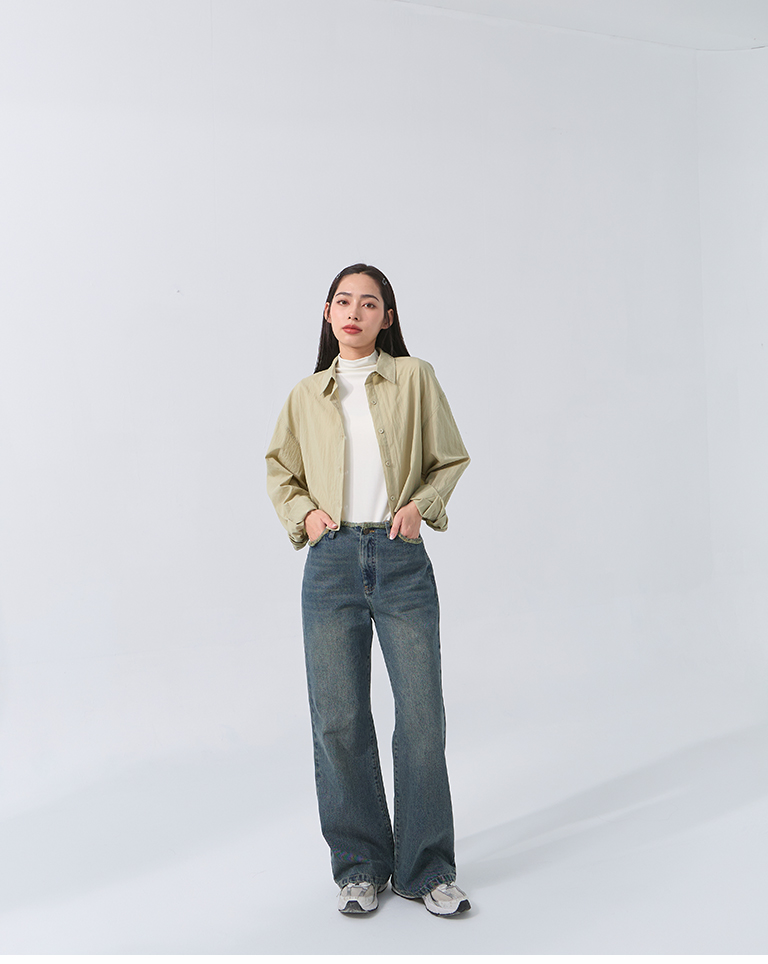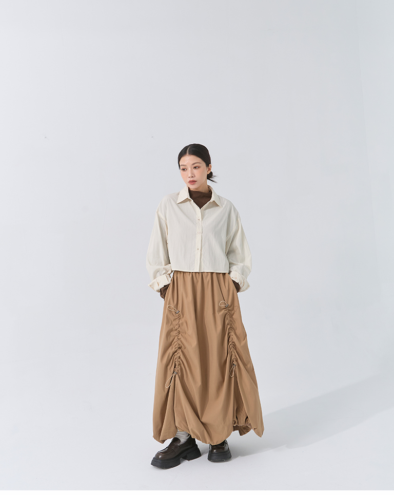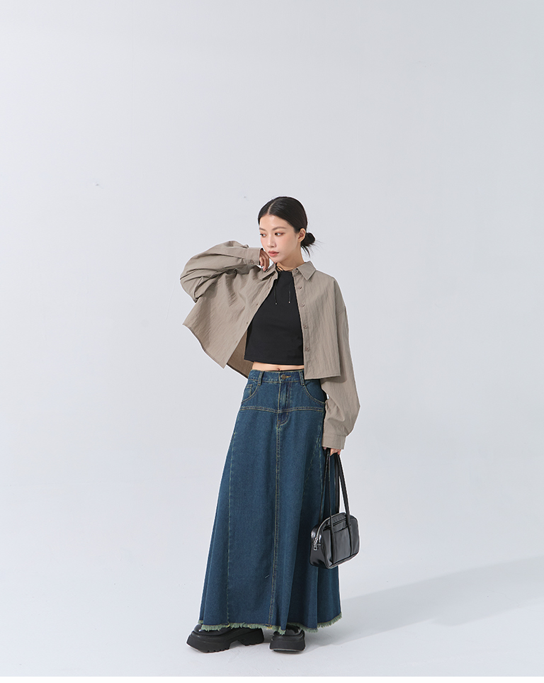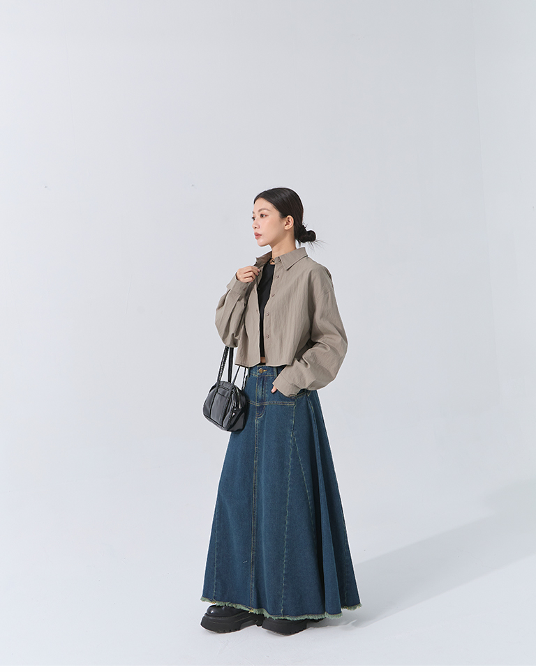 Plain back pleated long-sleeved cropped shirt (sold in four colors)