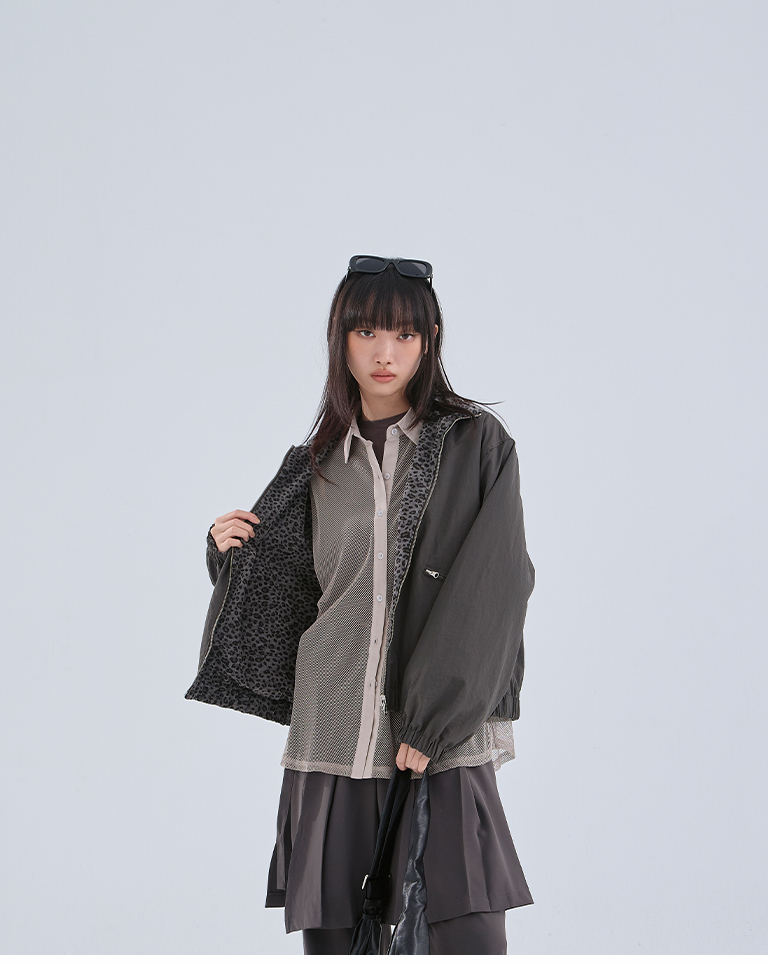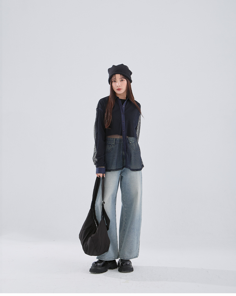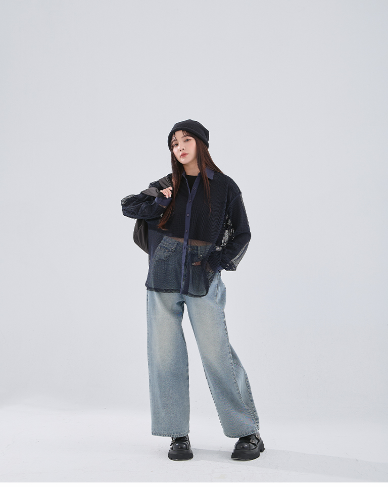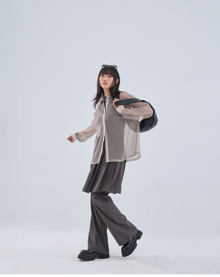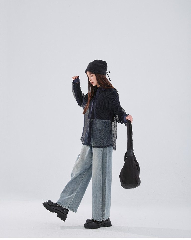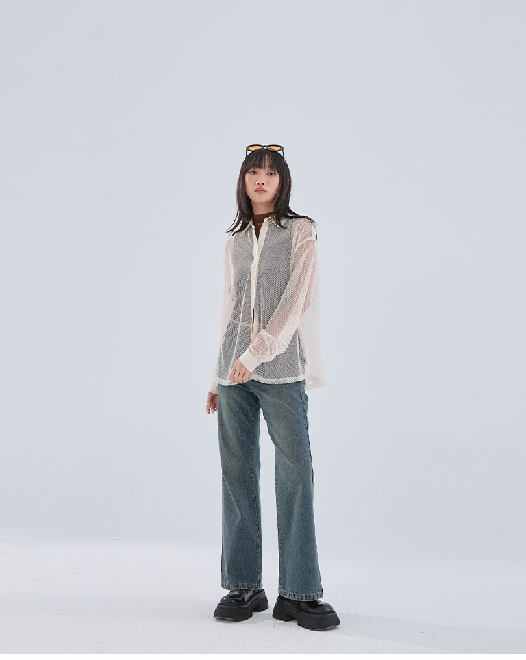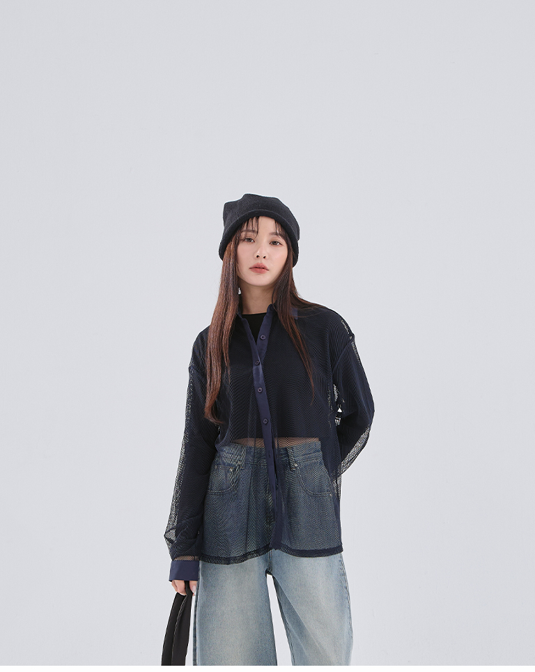 Hollow grid design long-sleeved shirt, three colors available