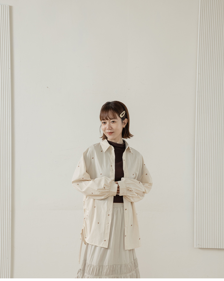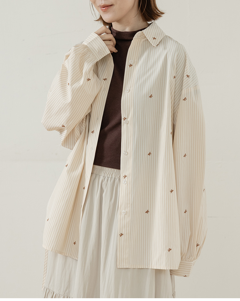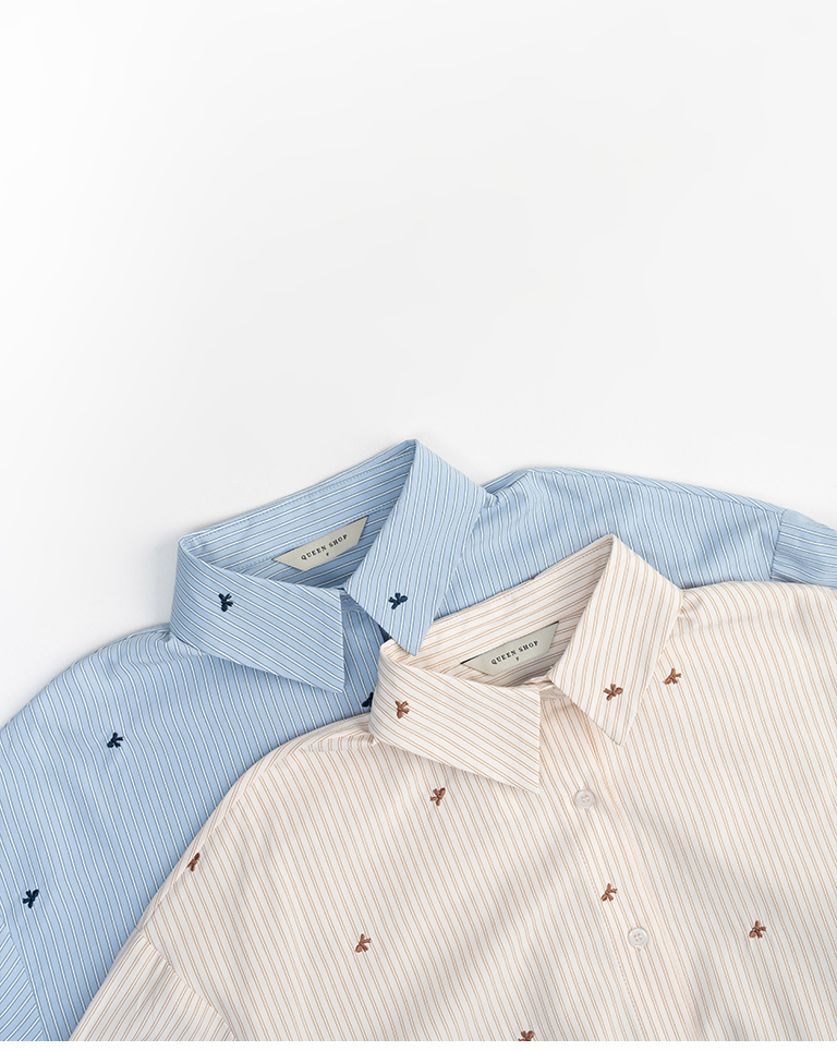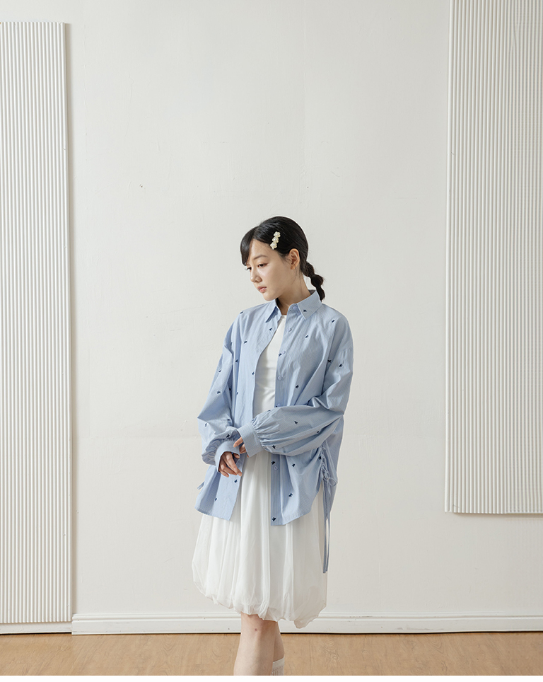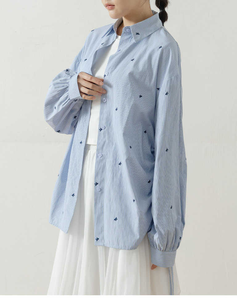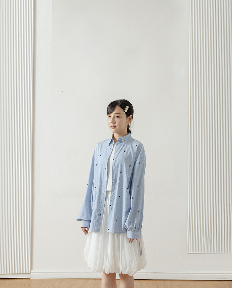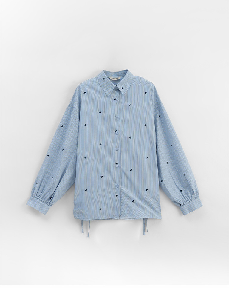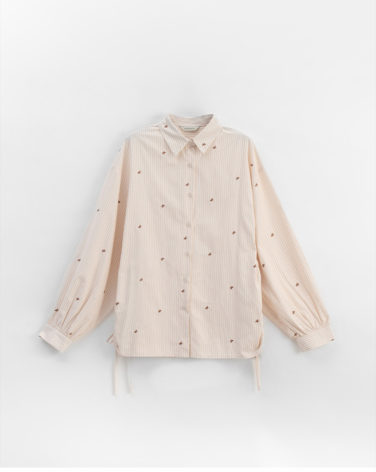 Striped bow-embroidered, side-gathered, wide-fit shirt, available in two colors.