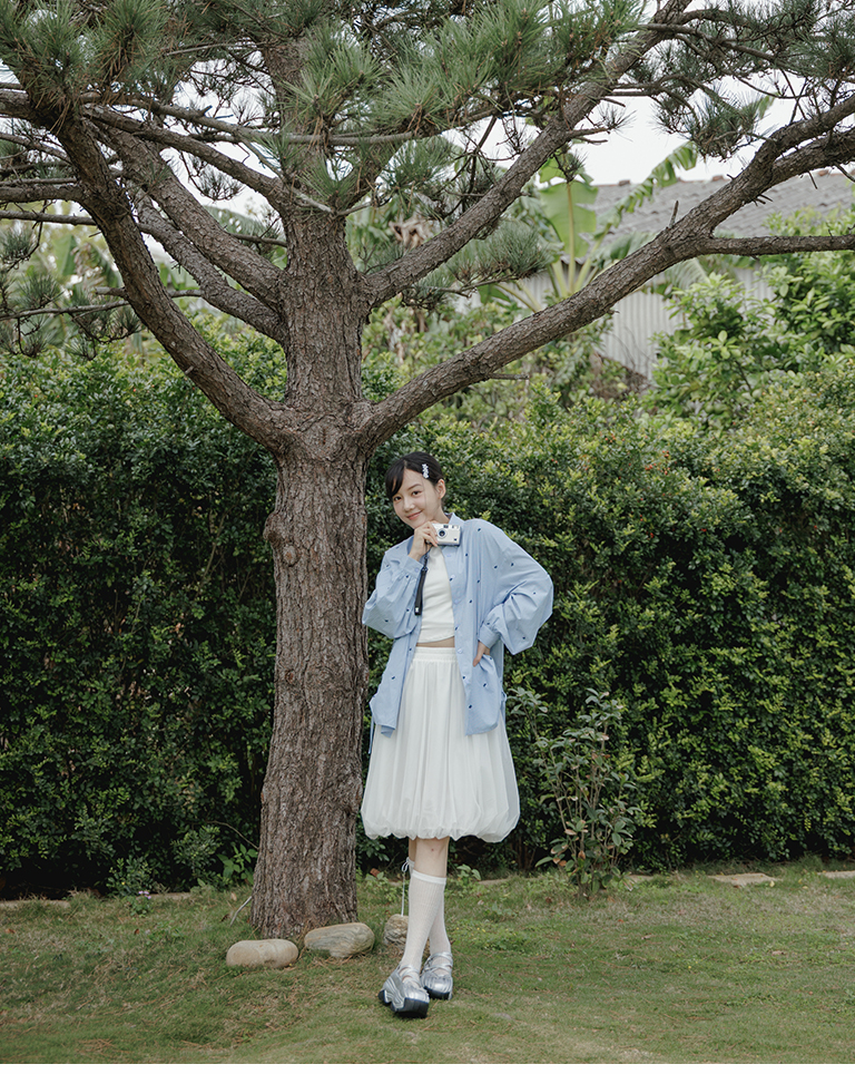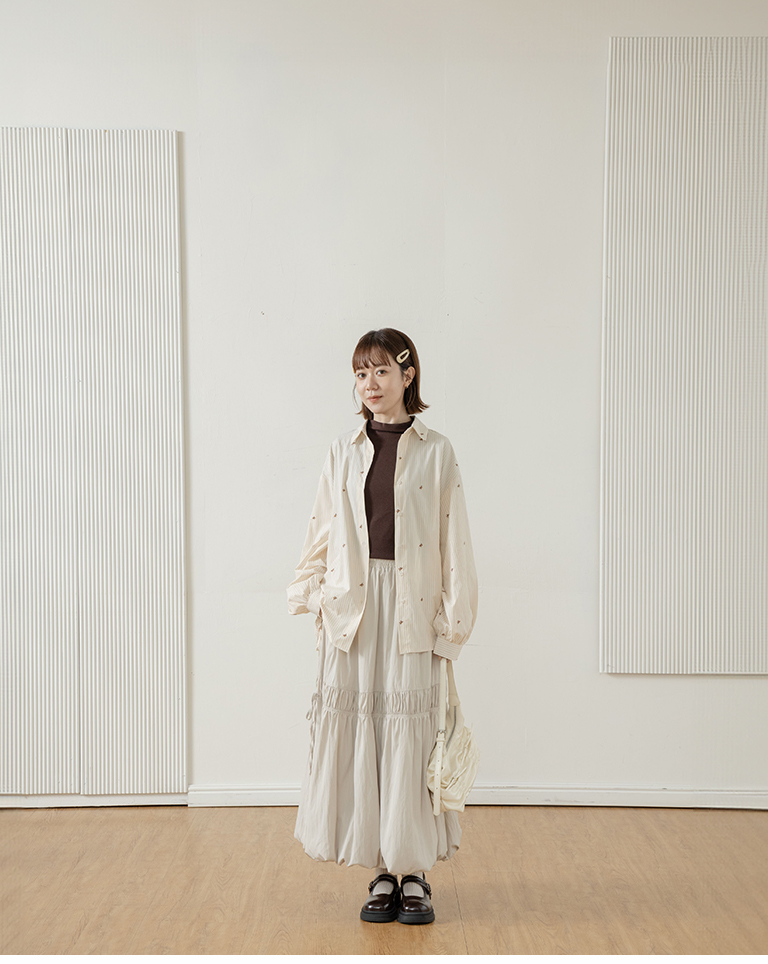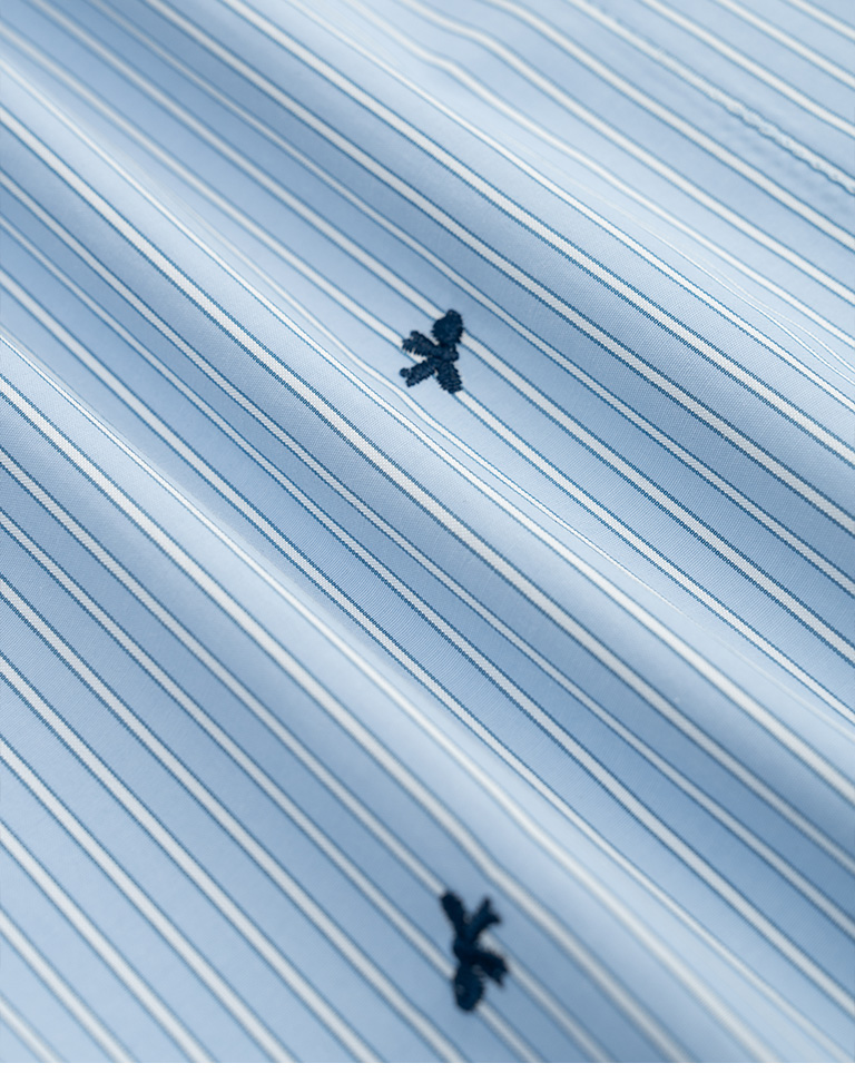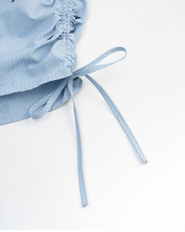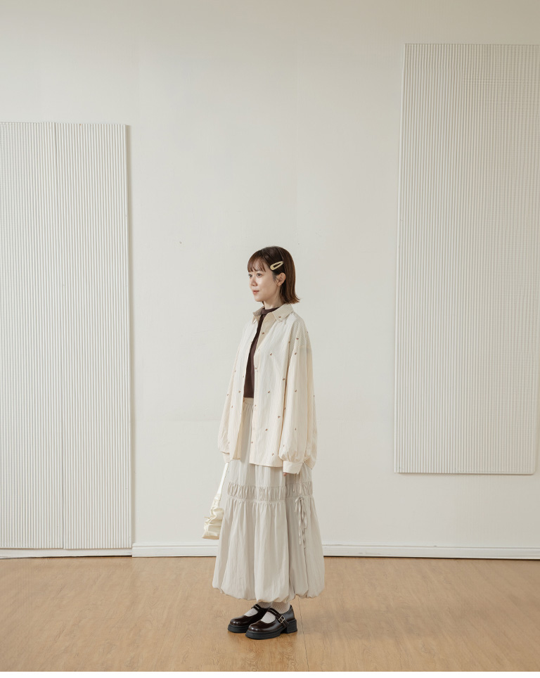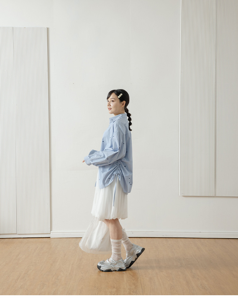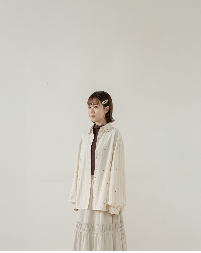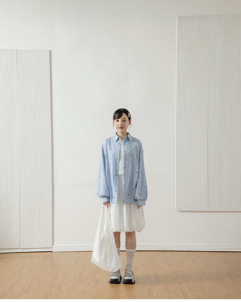 Striped bow-embroidered, side-gathered, wide-fit shirt, available in two colors.