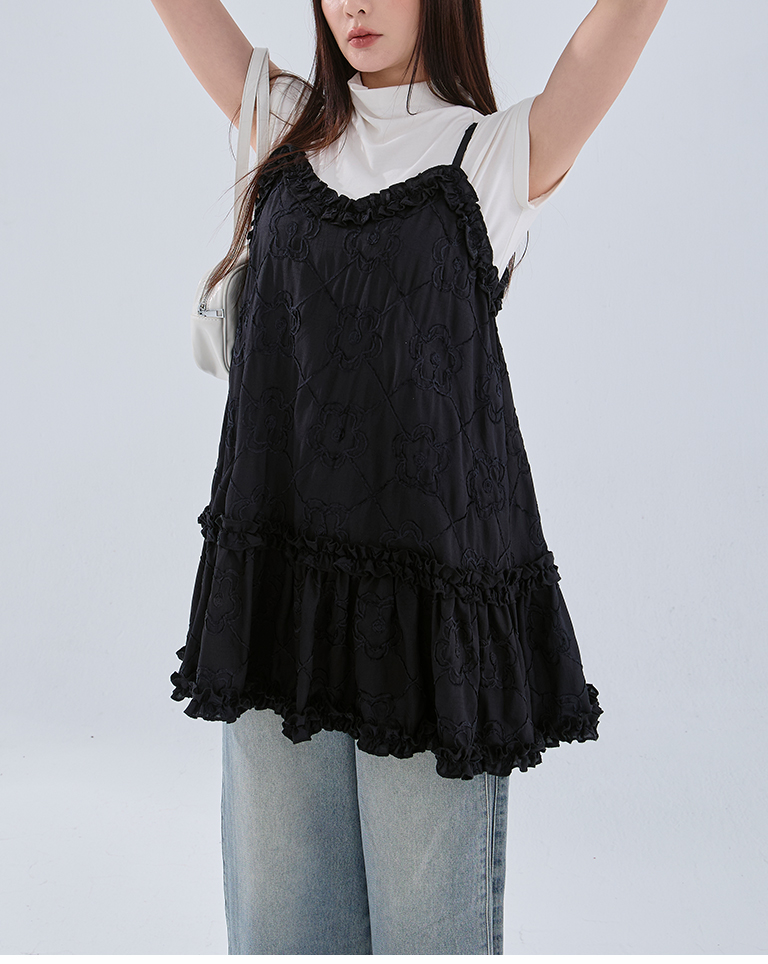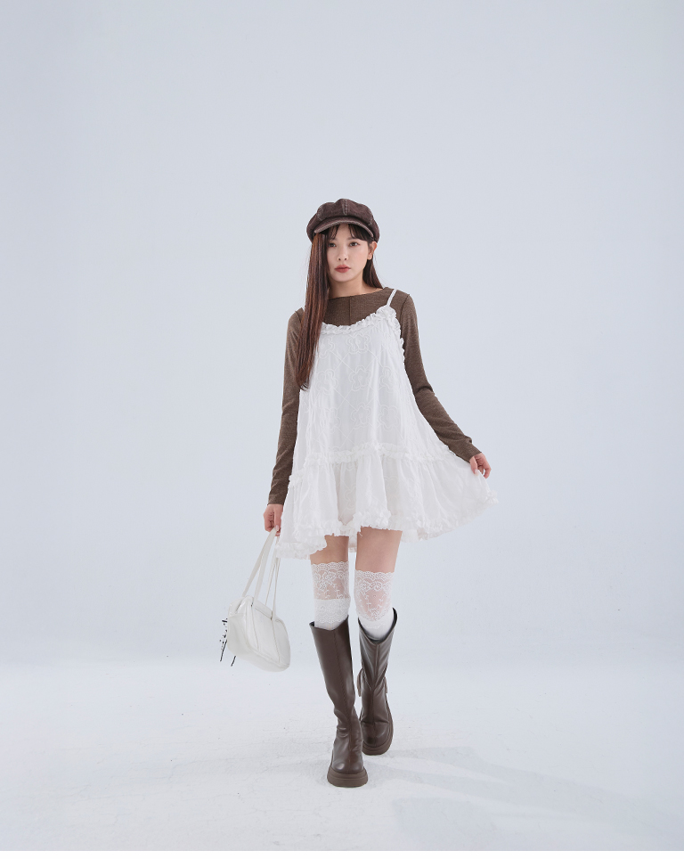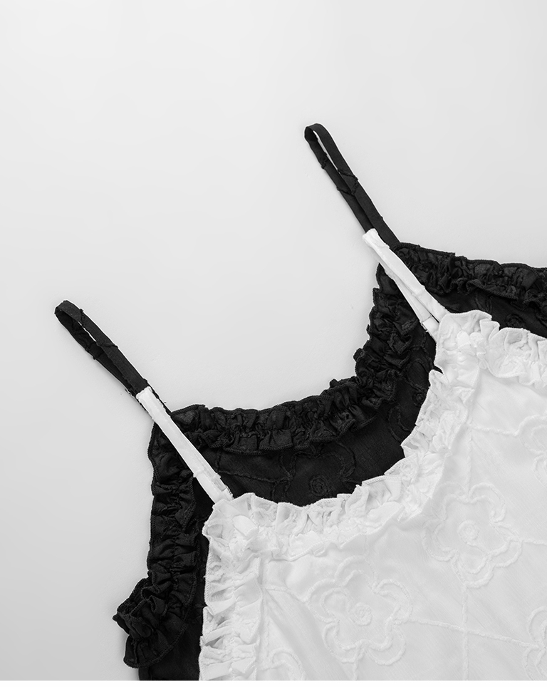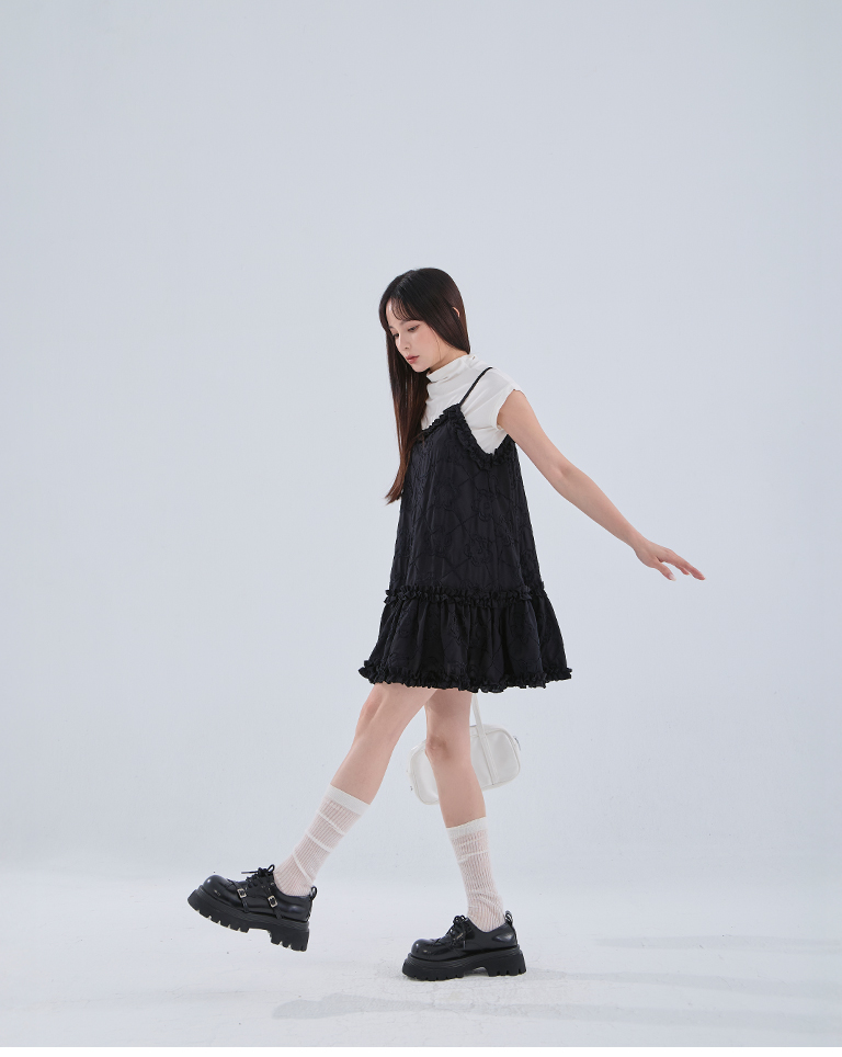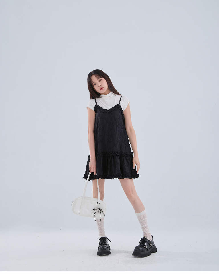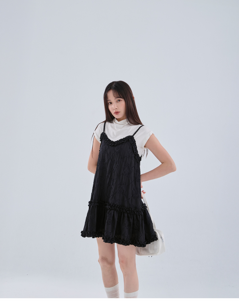 Three-dimensional jacquard lotus leaf spaghetti-shoulder short dress, two colors available