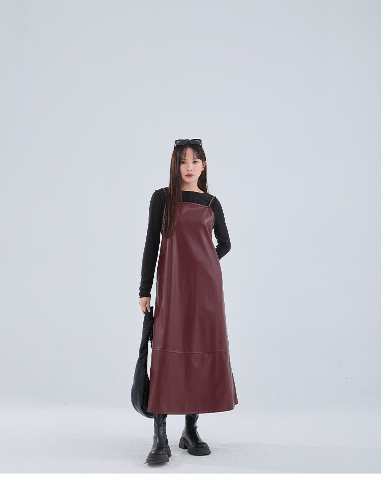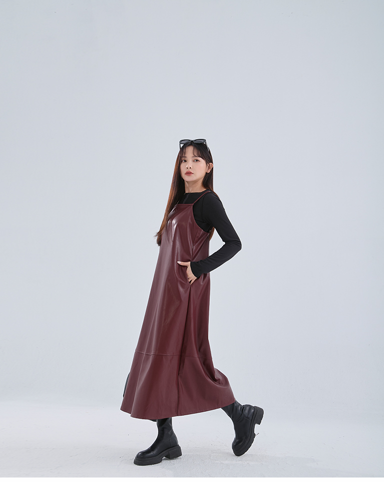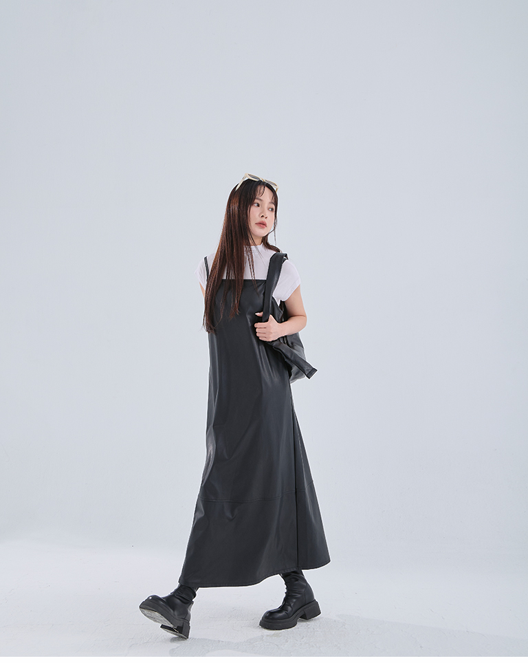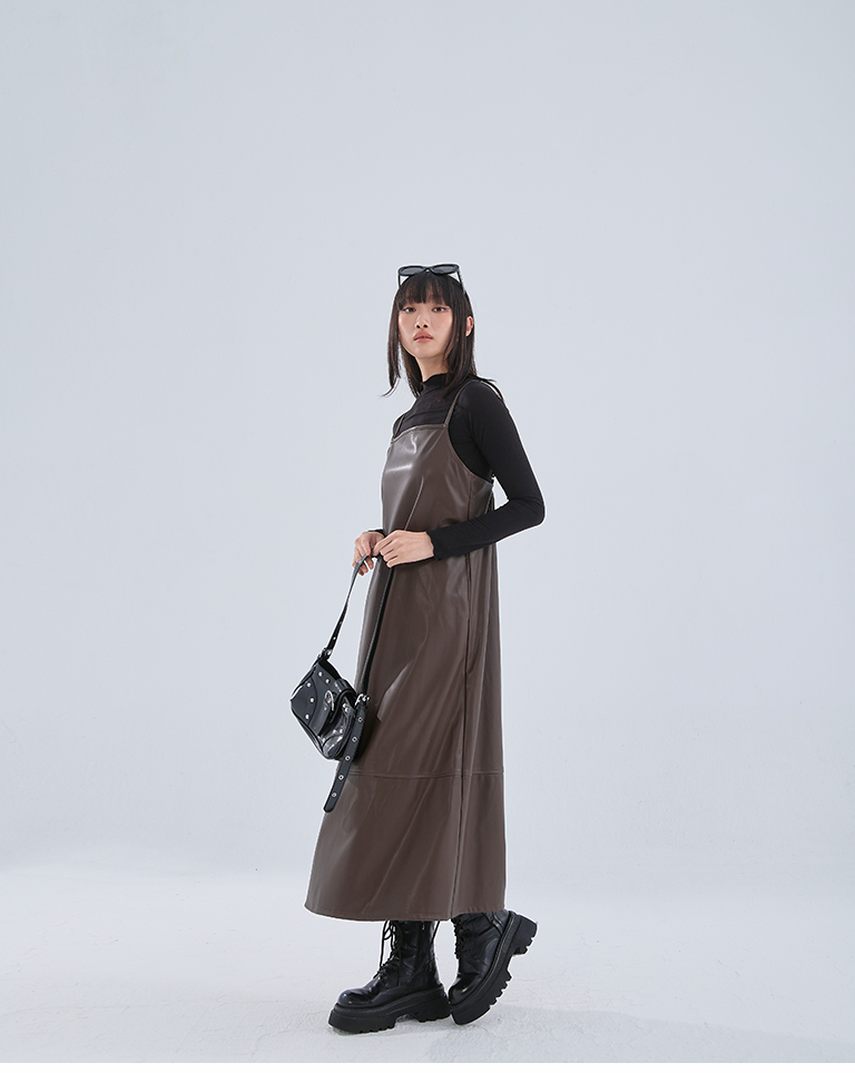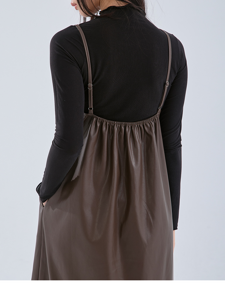 Textured leather paneled long dress with thin shoulders available in three colors