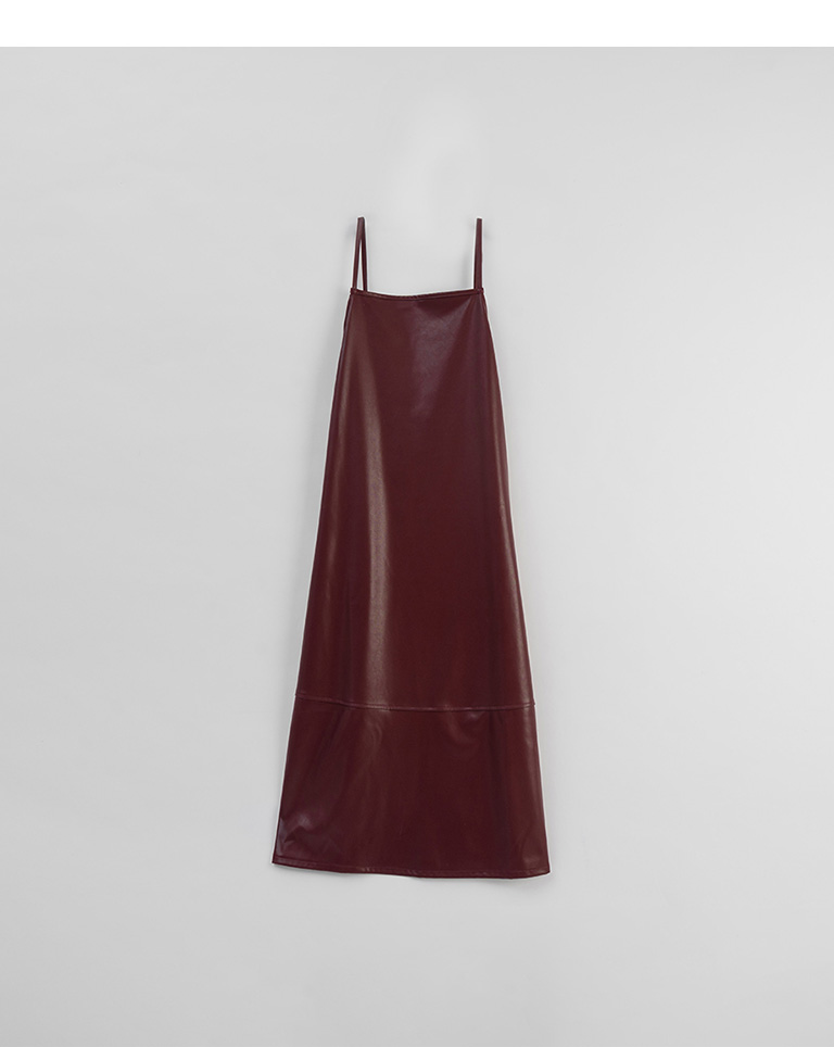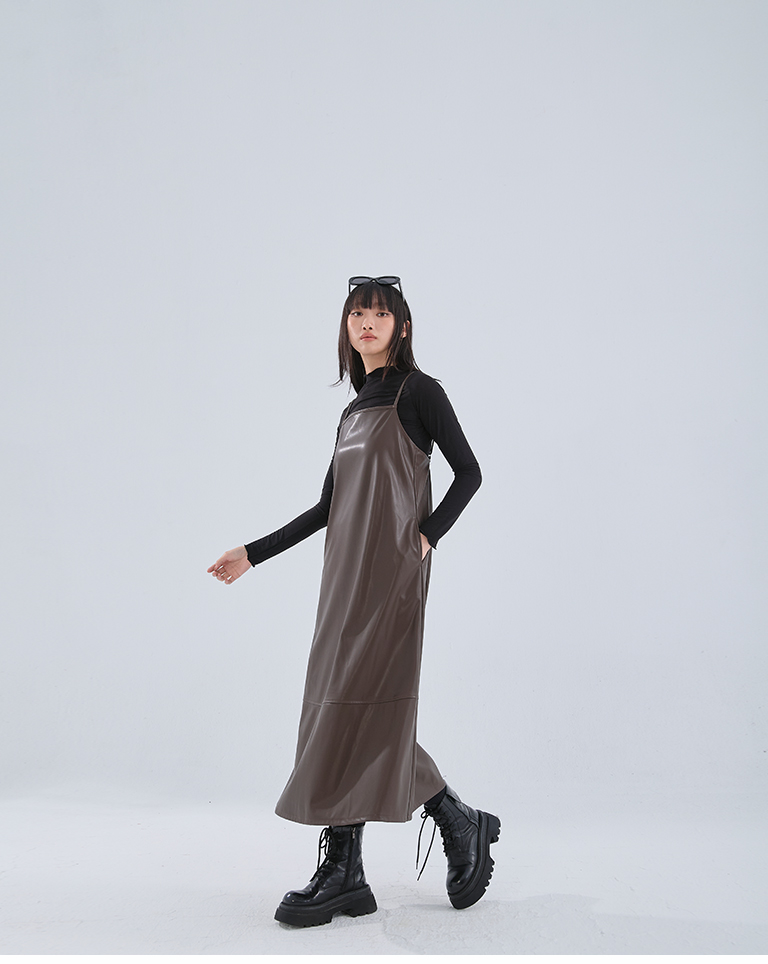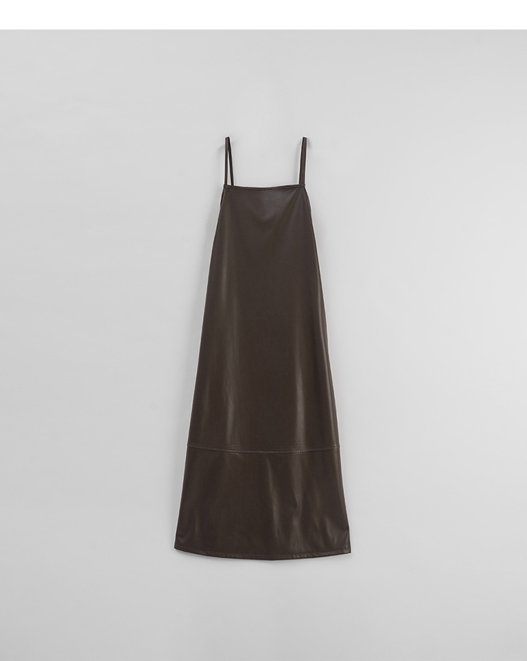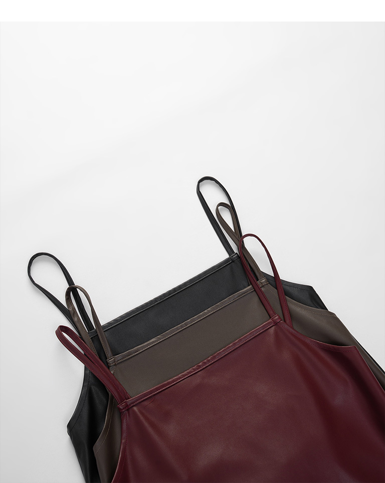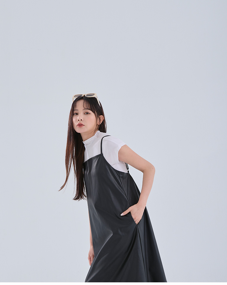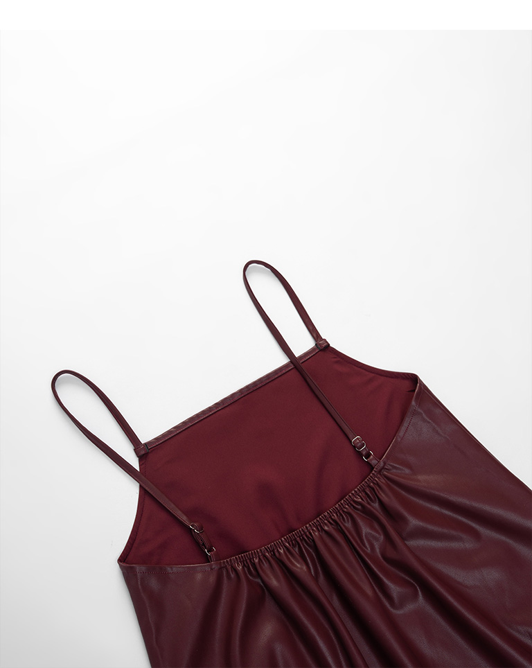 Textured leather paneled long dress with thin shoulders available in three colors