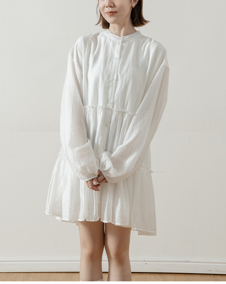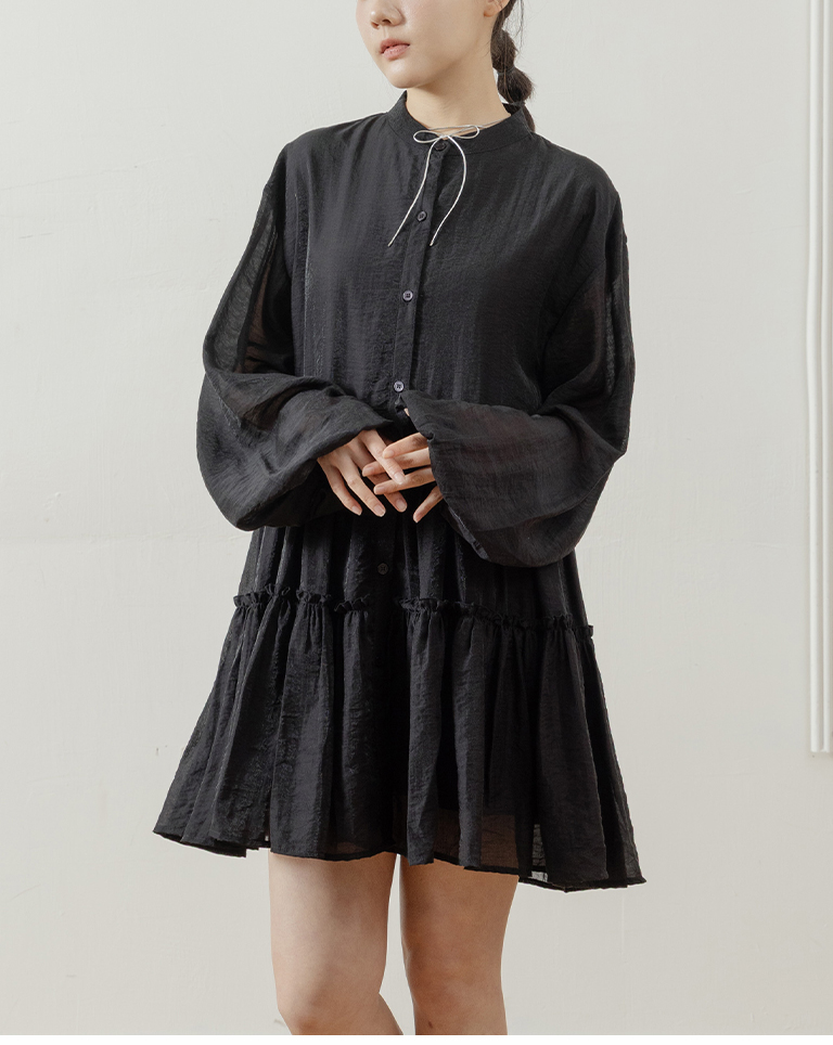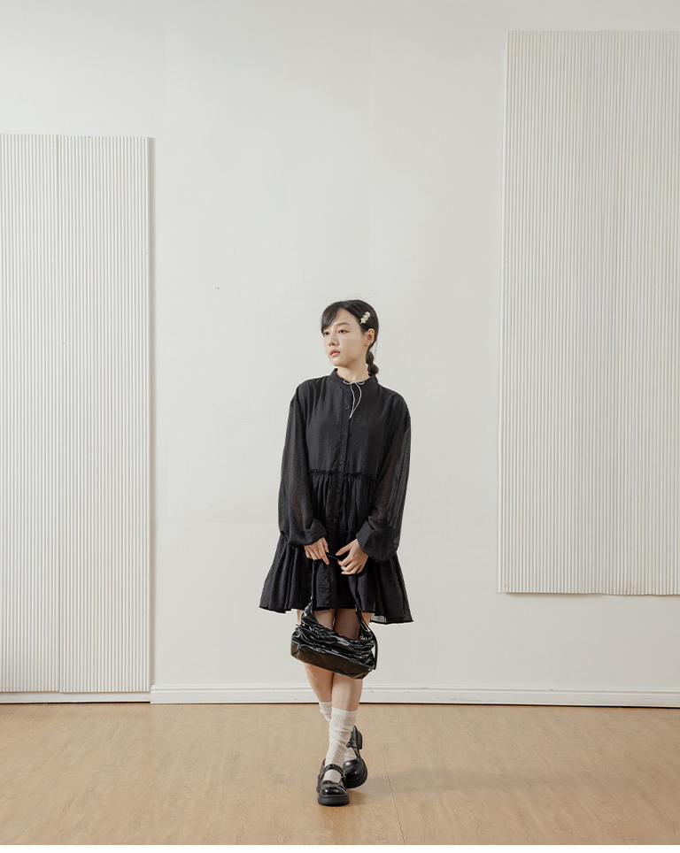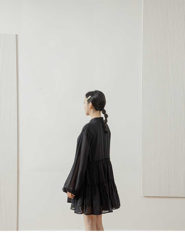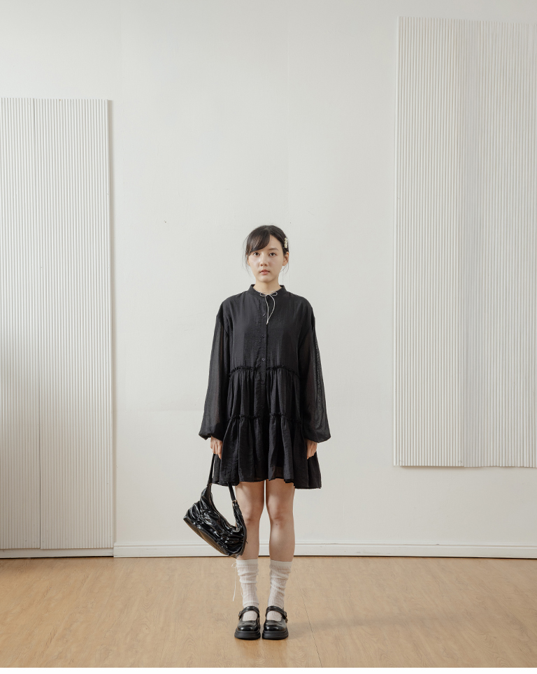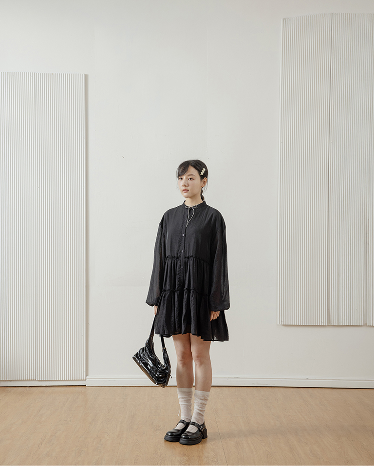 Semi-gloss double-layered design, mid-length collar cake dress, available in two colors.