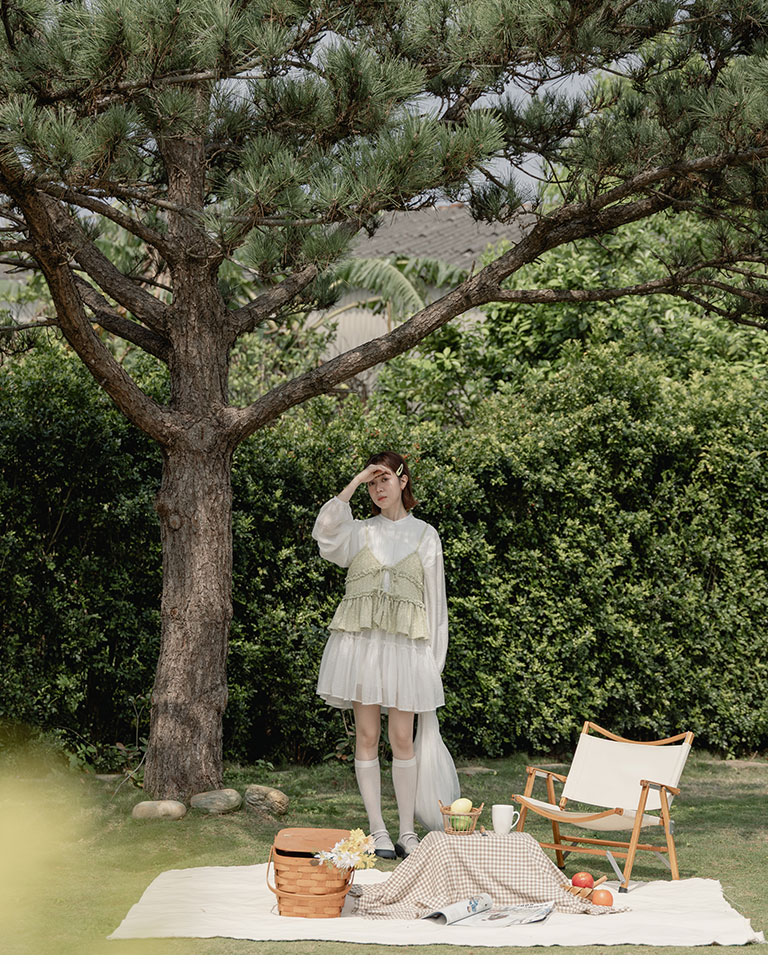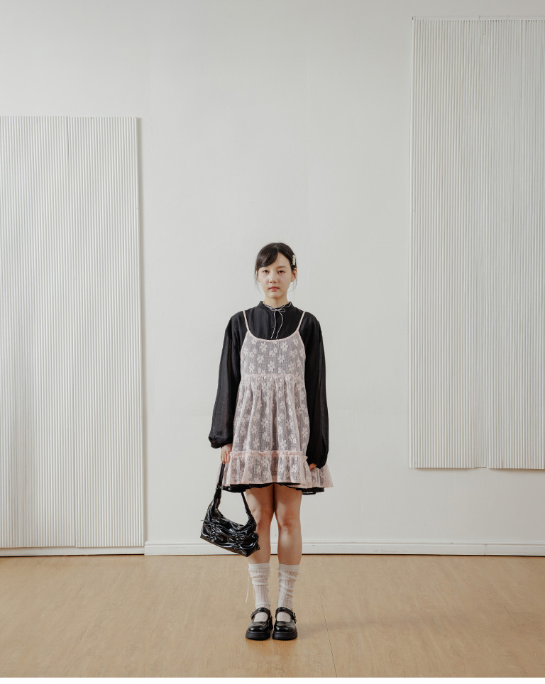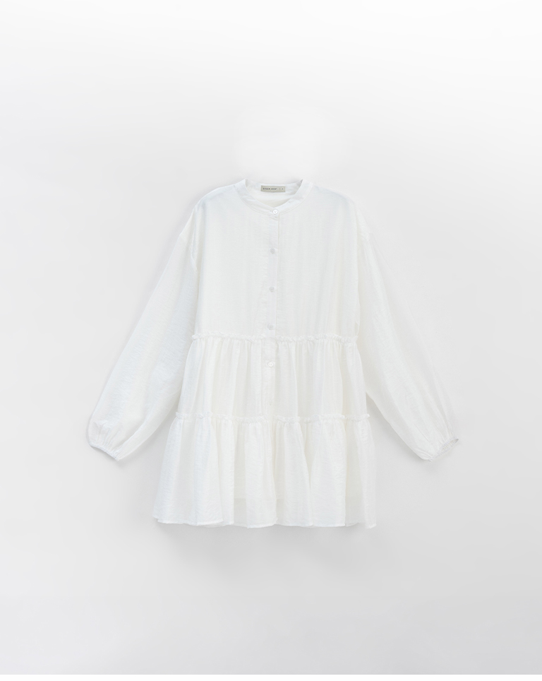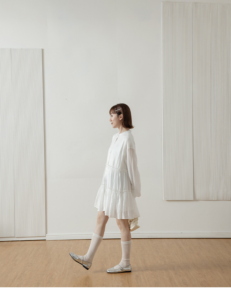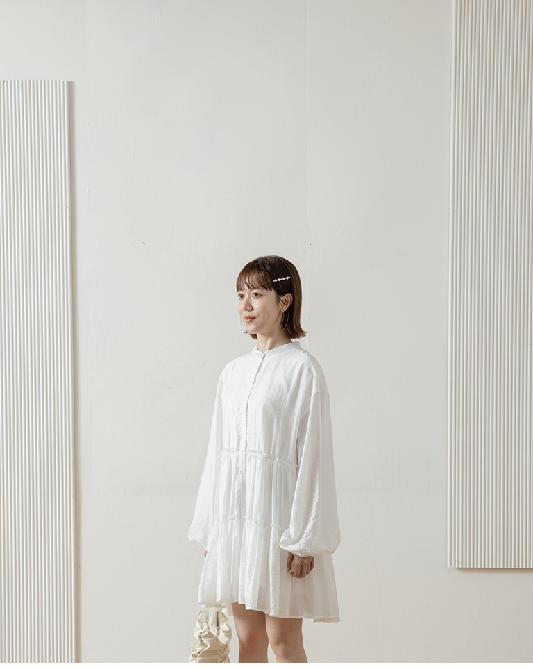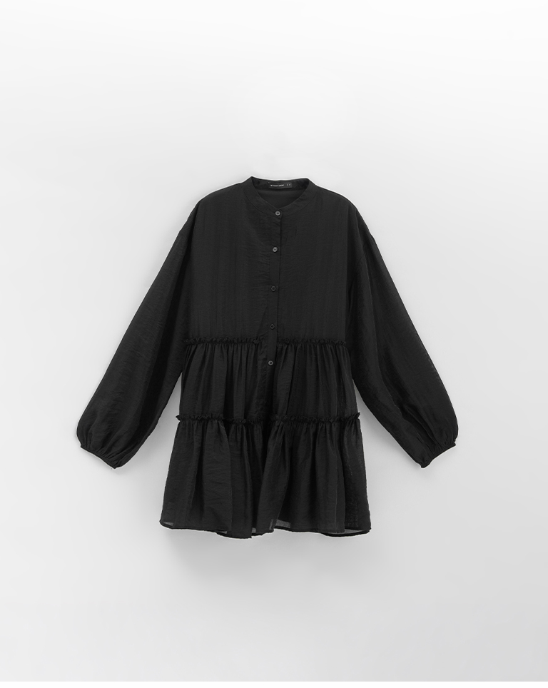 Semi-gloss double-layered design, mid-length collar cake dress, available in two colors.