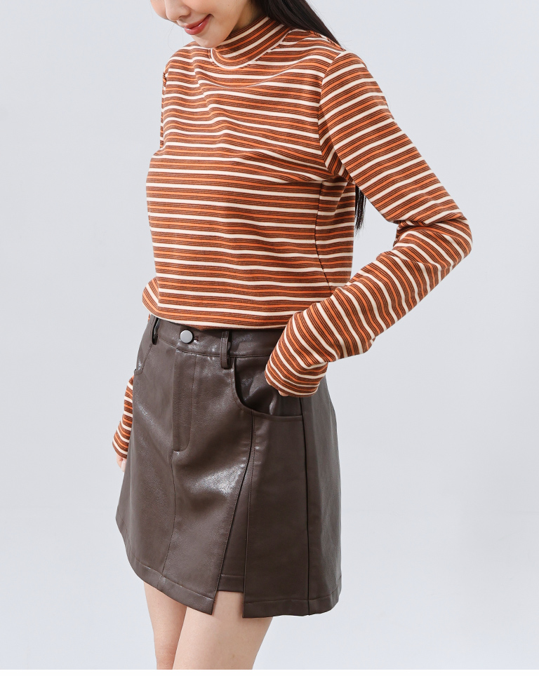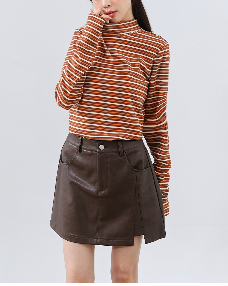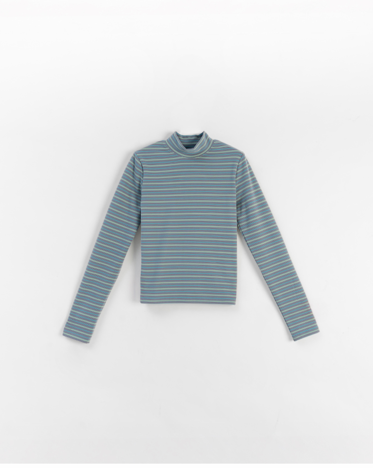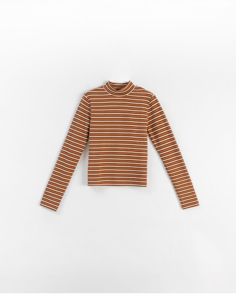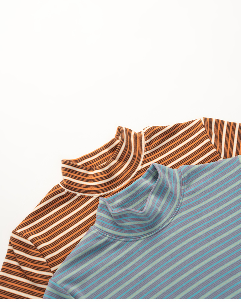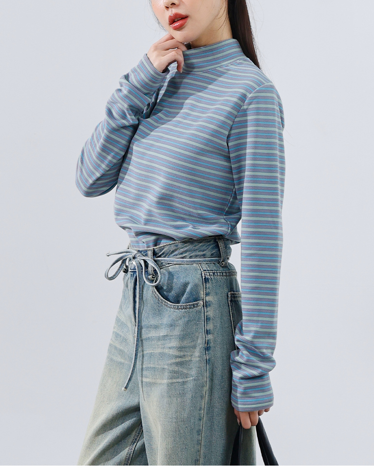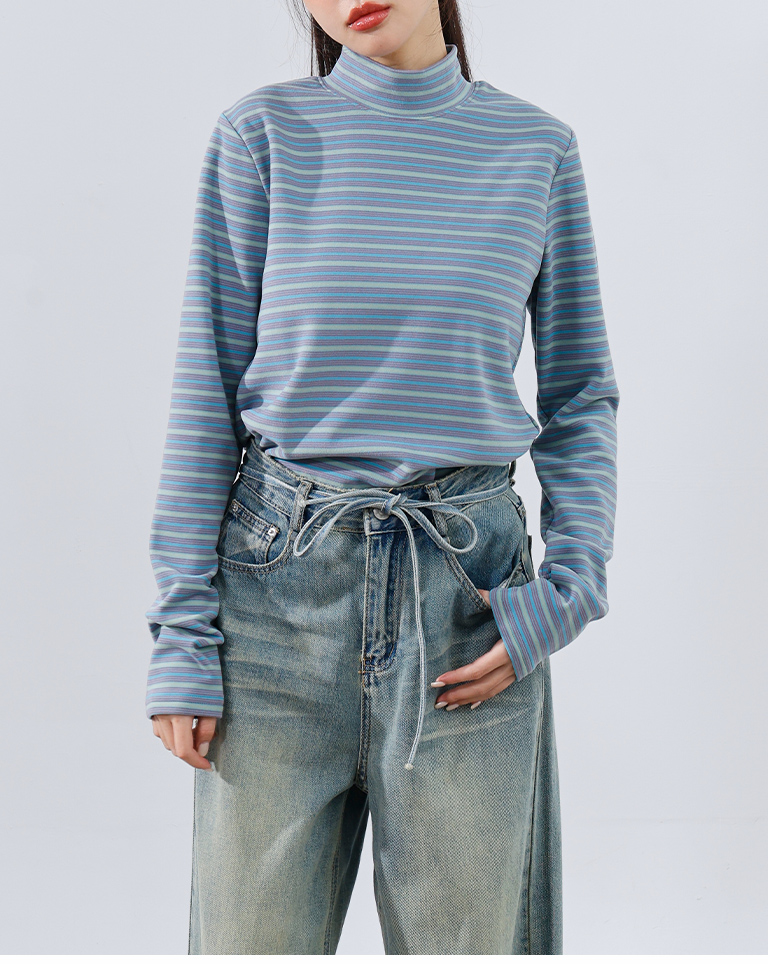 Brushed striped turtleneck long-sleeved top, available in two colors.
