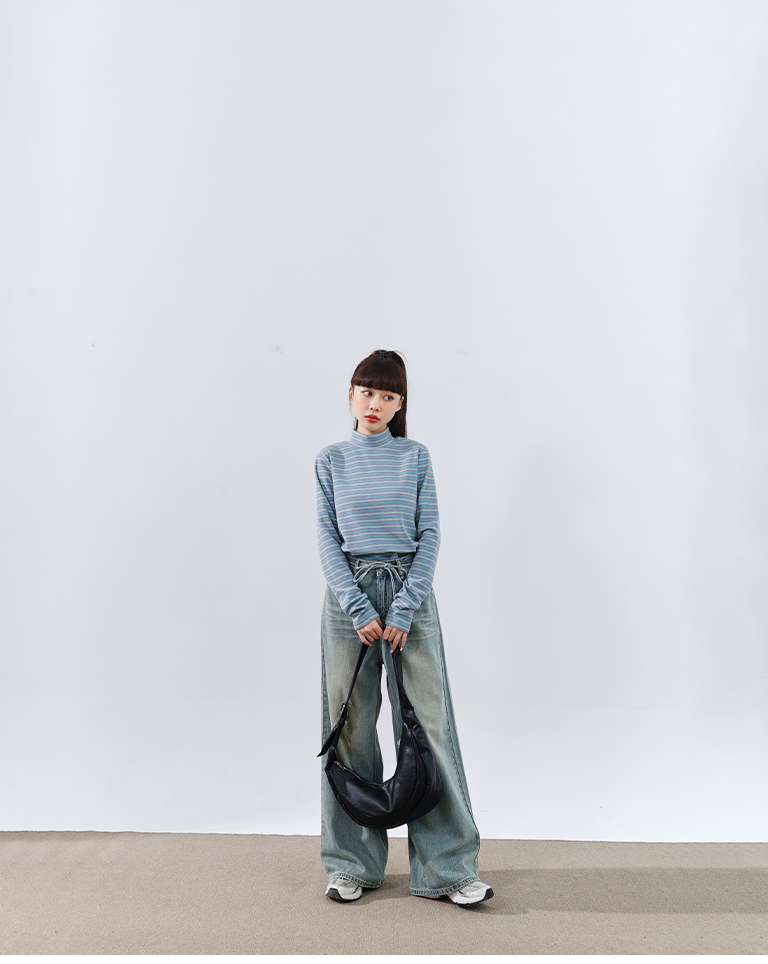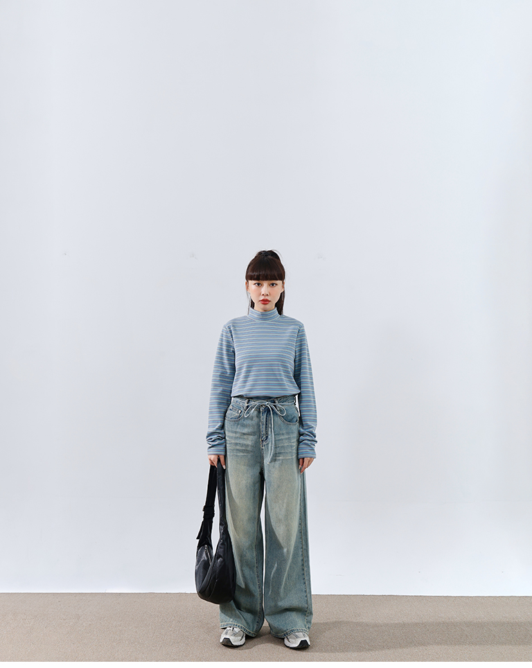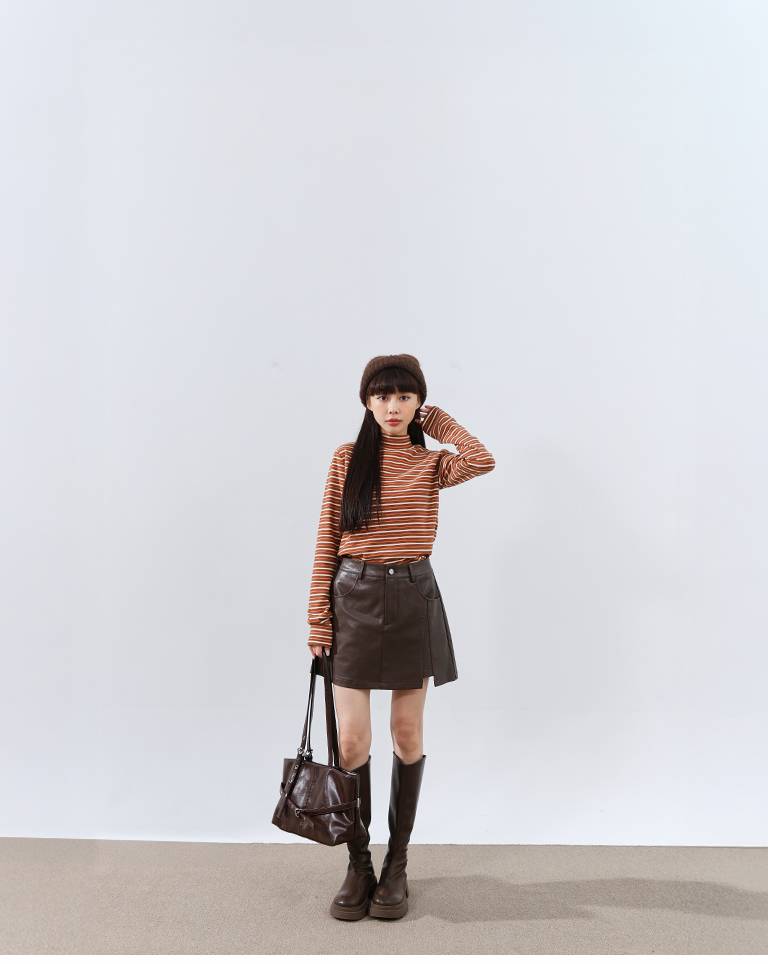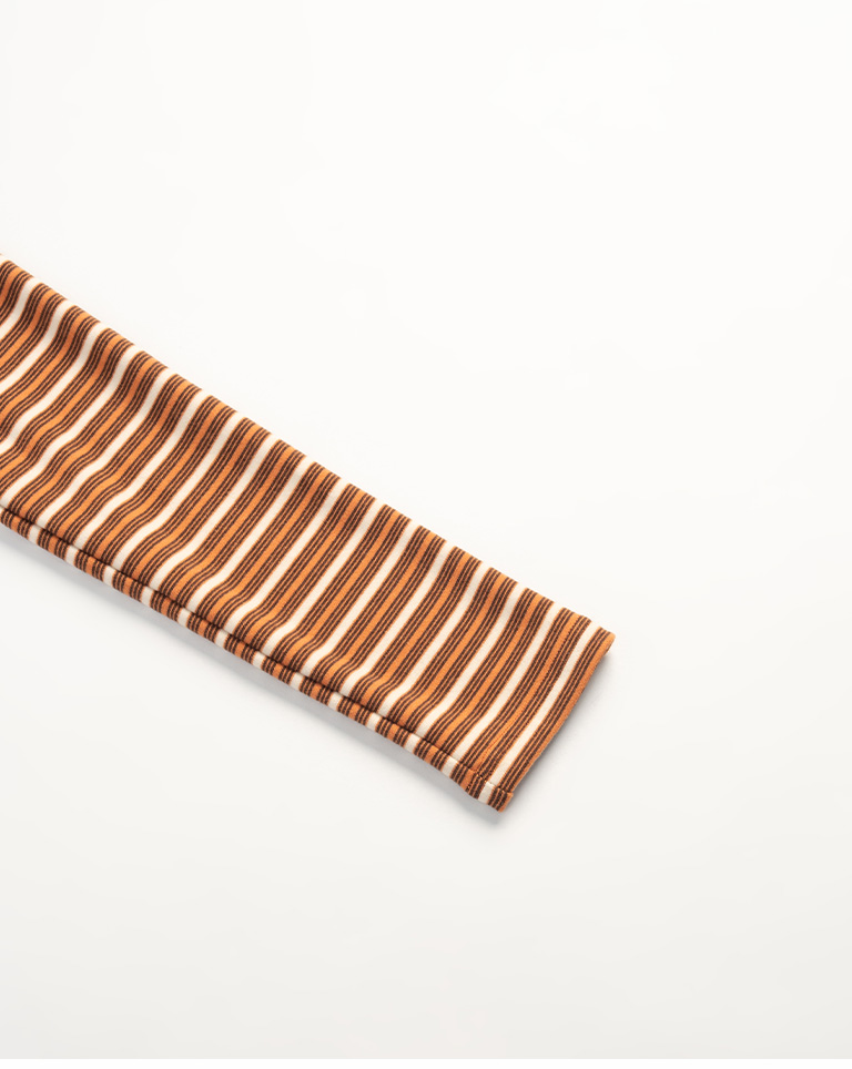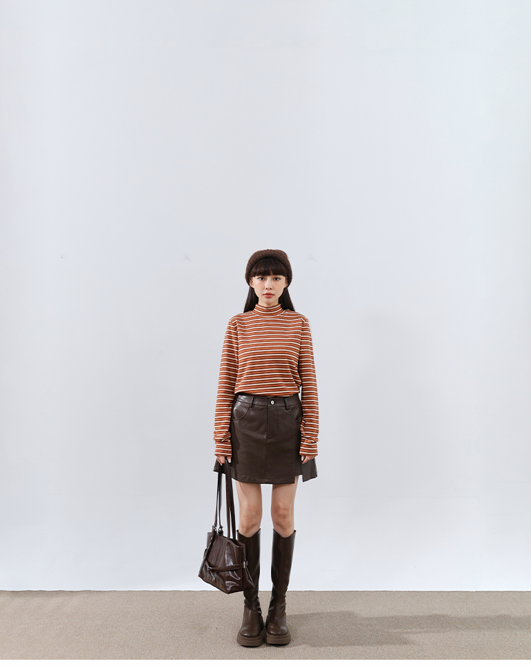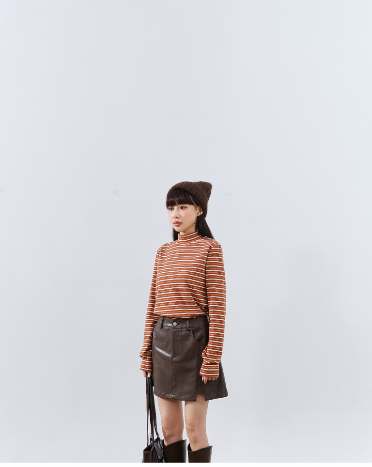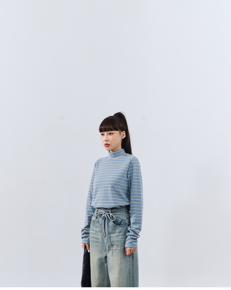 Brushed striped turtleneck long-sleeved top, available in two colors.