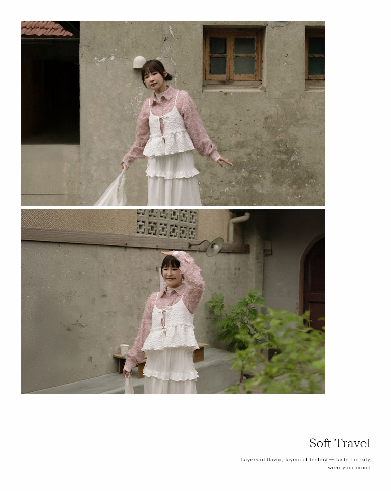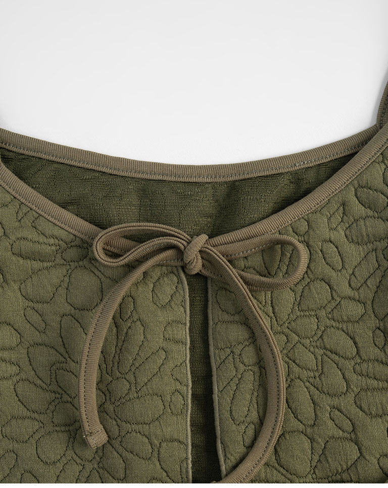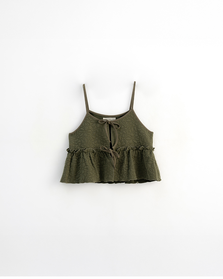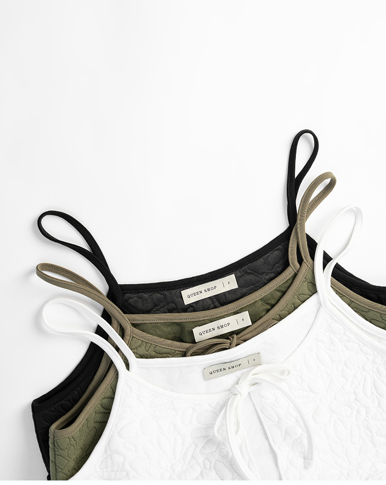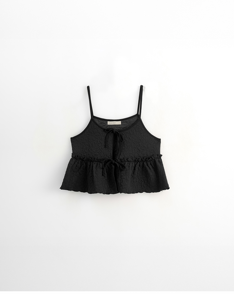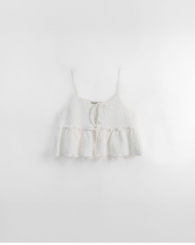 Floral embossed ruffle design, spaghetti strap vest, available in three colors.