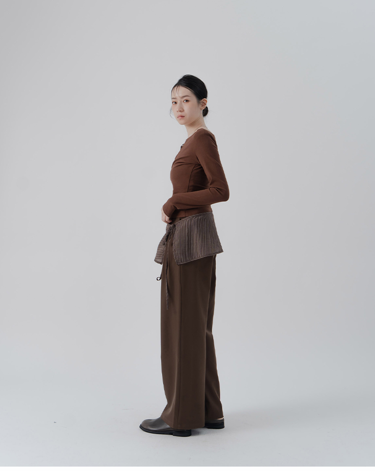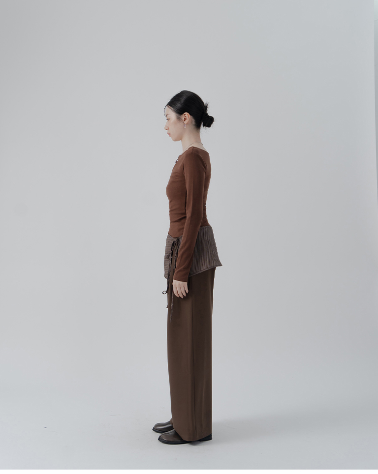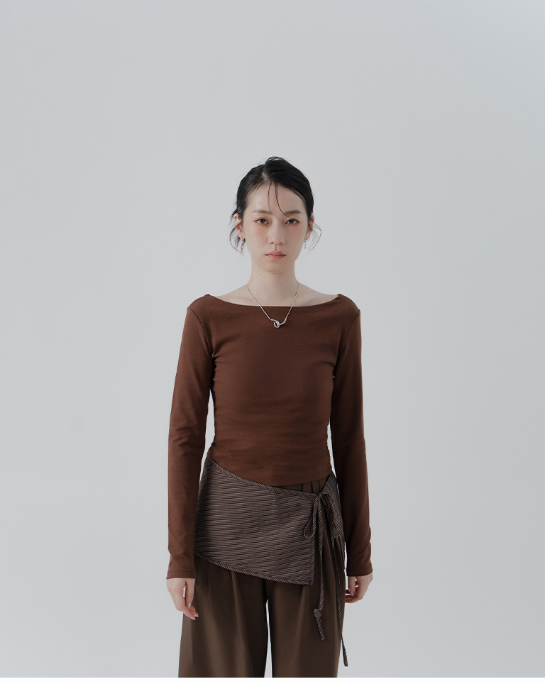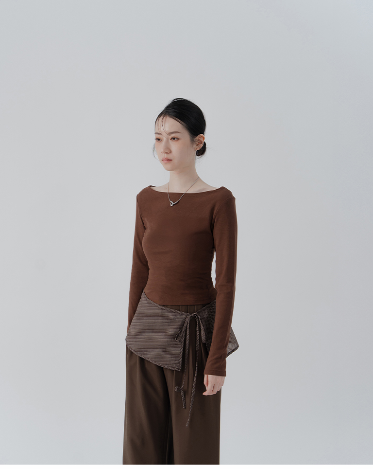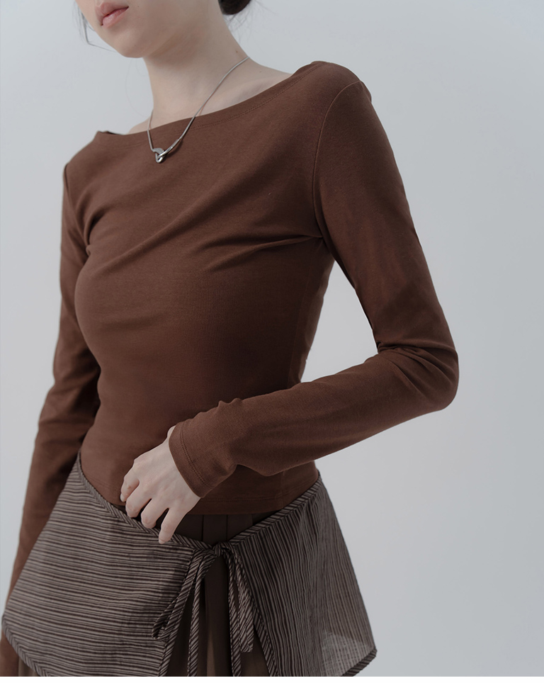 Solid Flat Collar Elastic Design Long Sleeve Top - Brown S/M/L