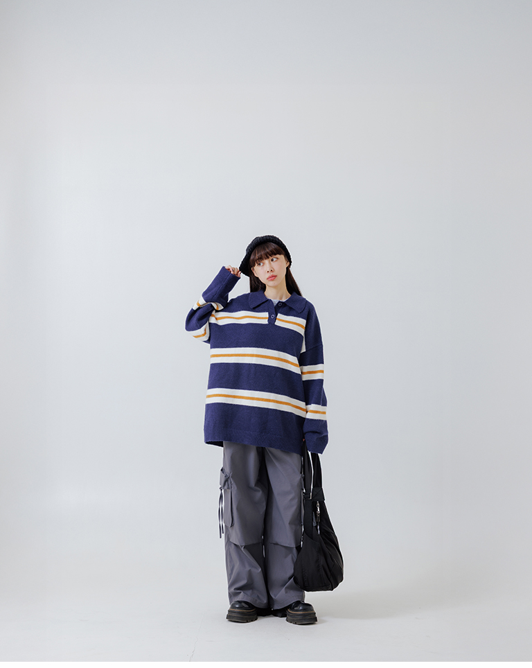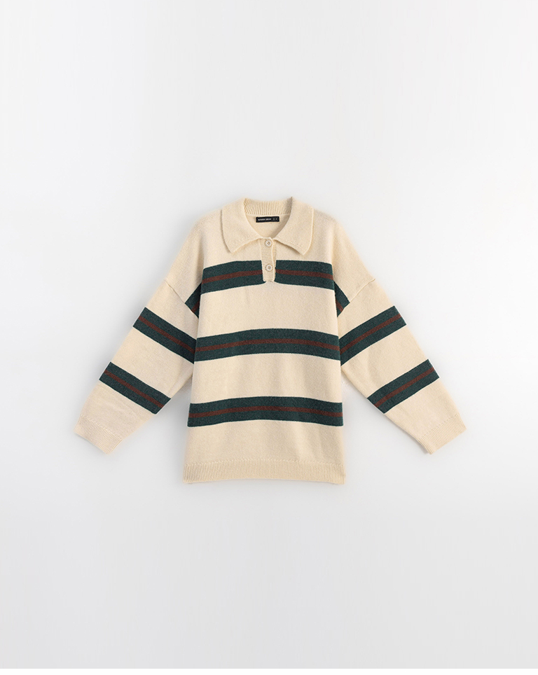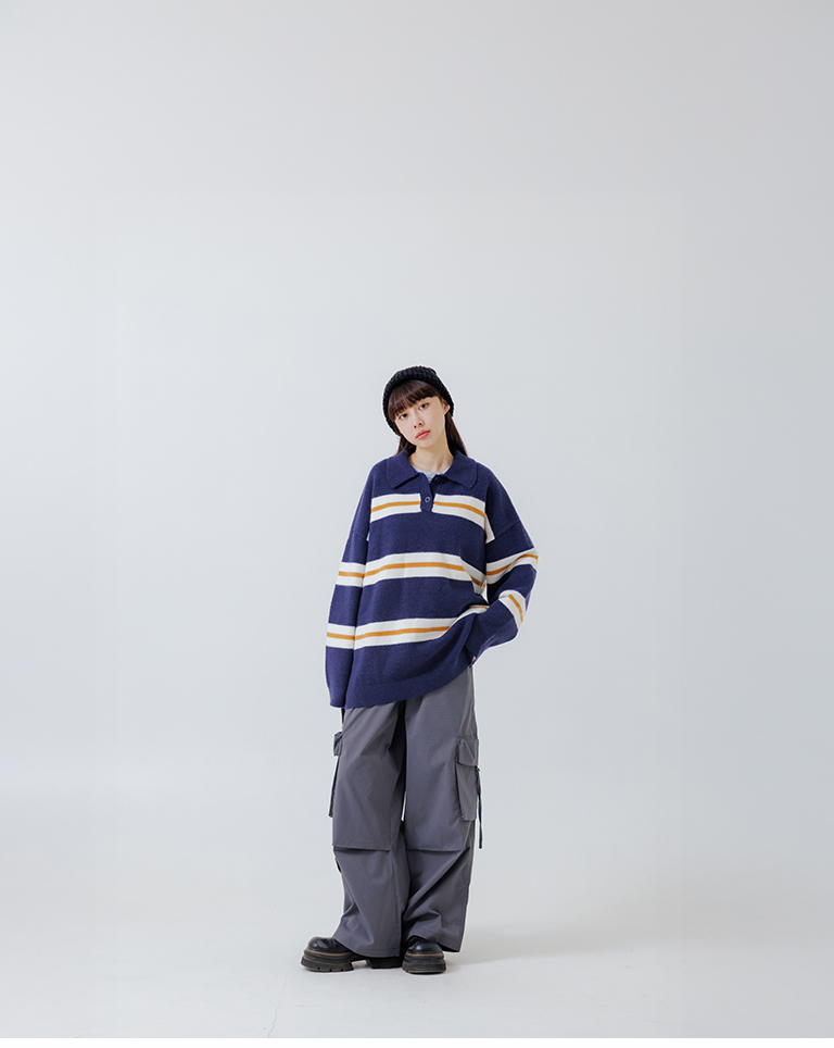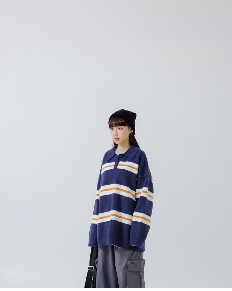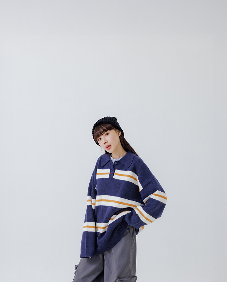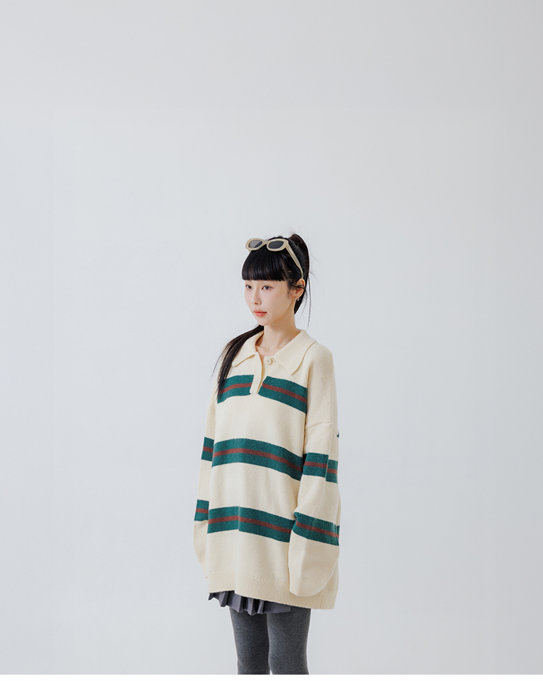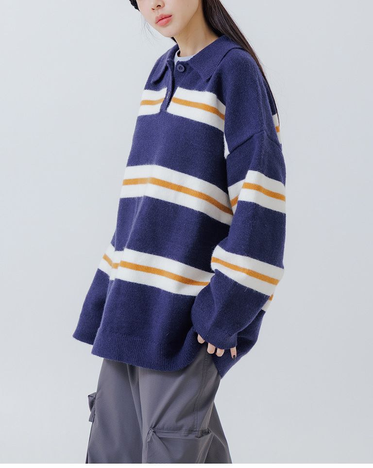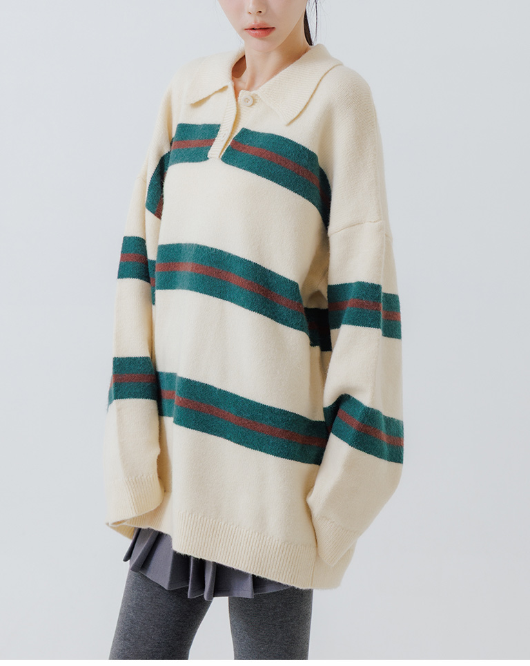 Polo collar striped wide-leg knit sweater, available in two colors.
