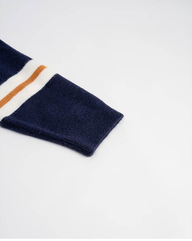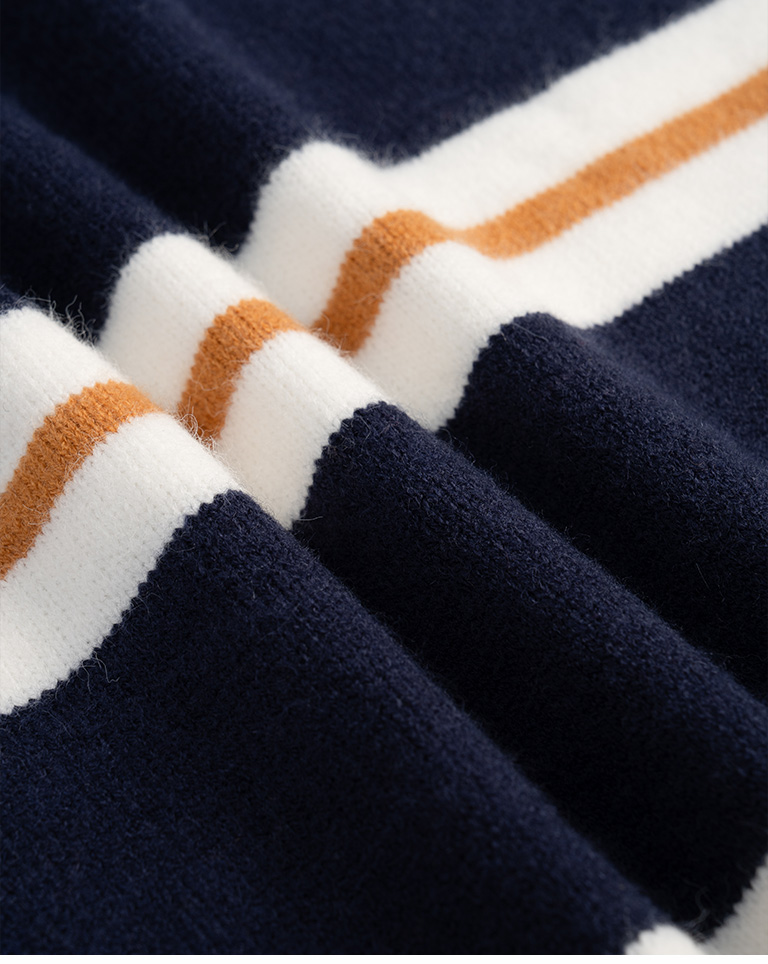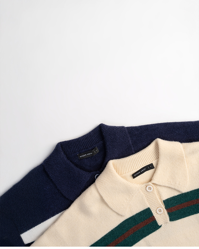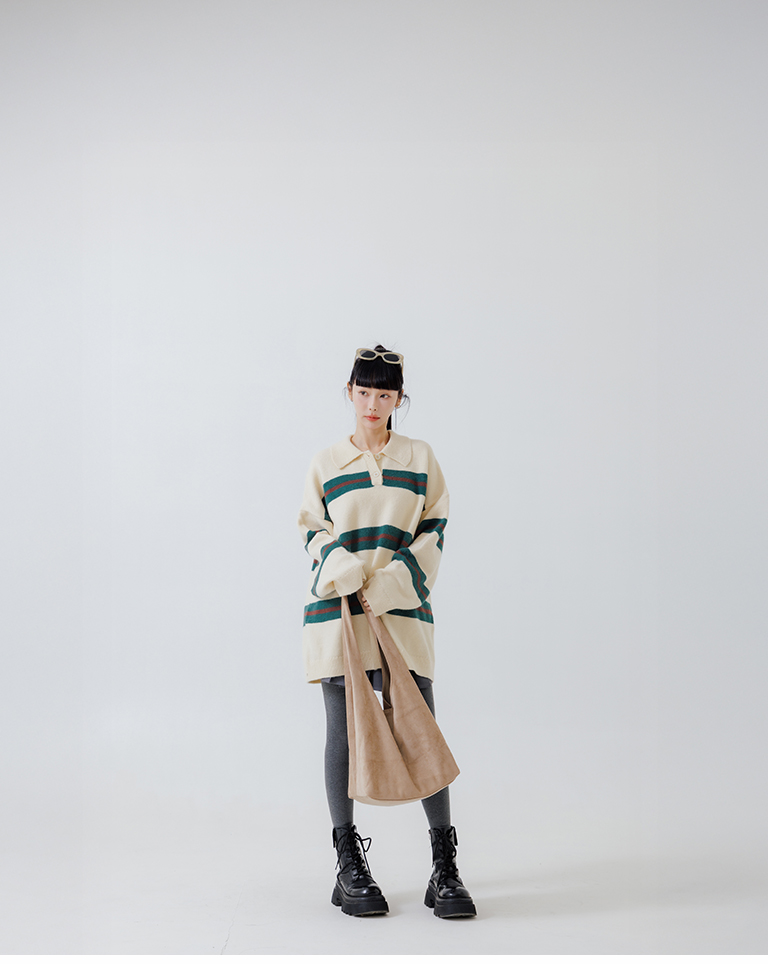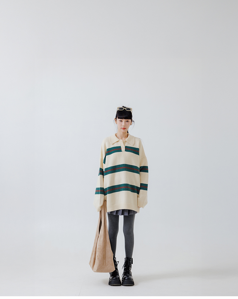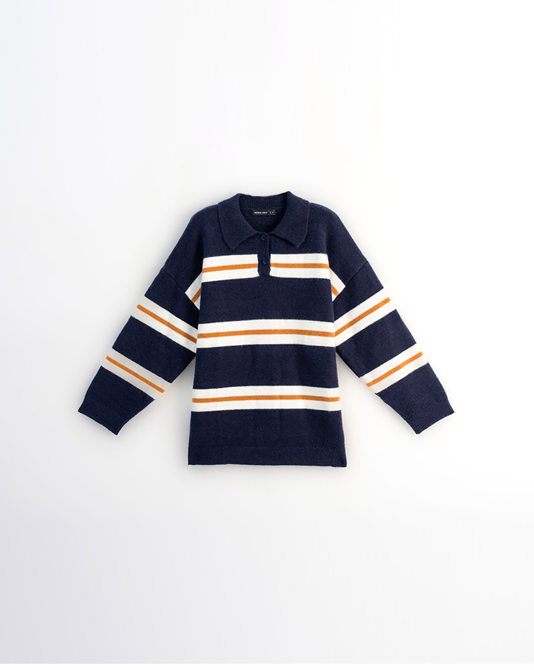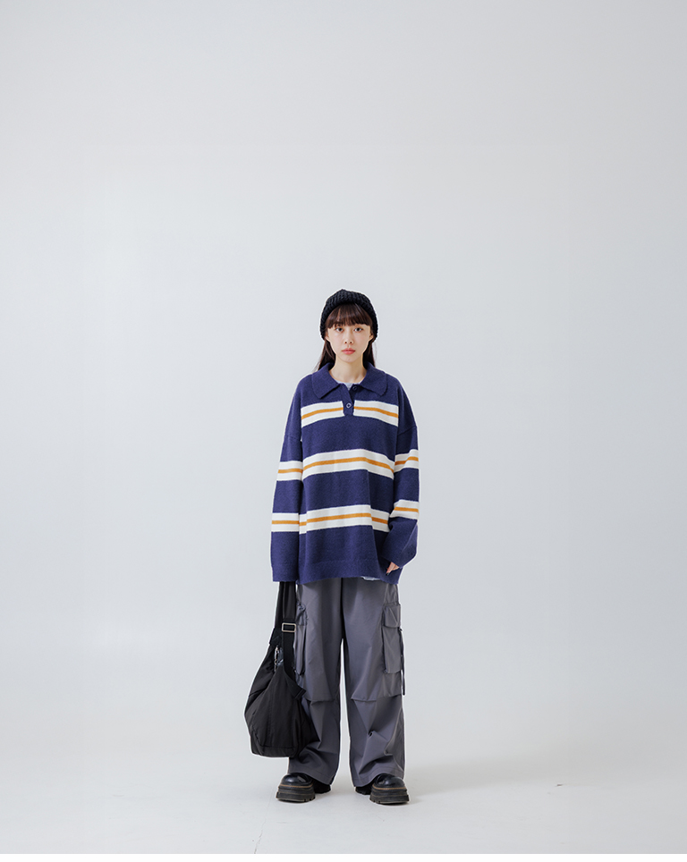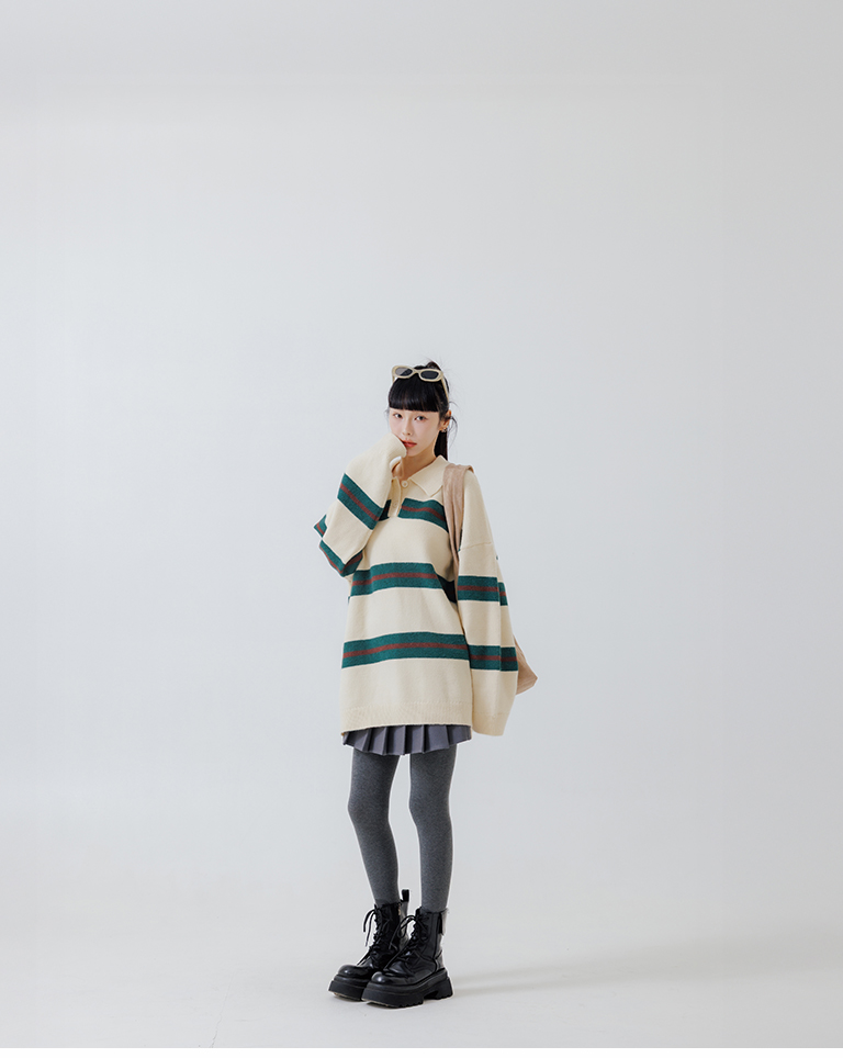 Polo collar striped wide-leg knit sweater, available in two colors.