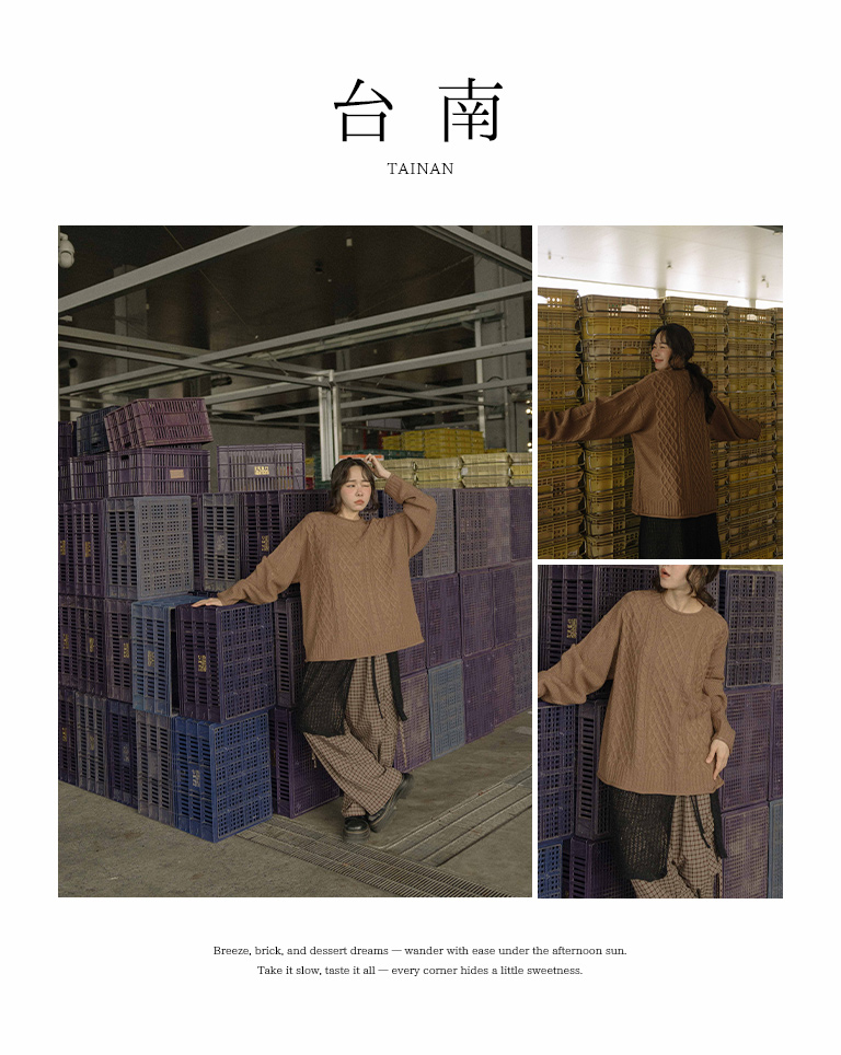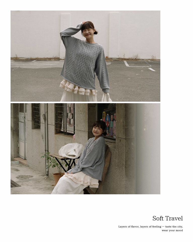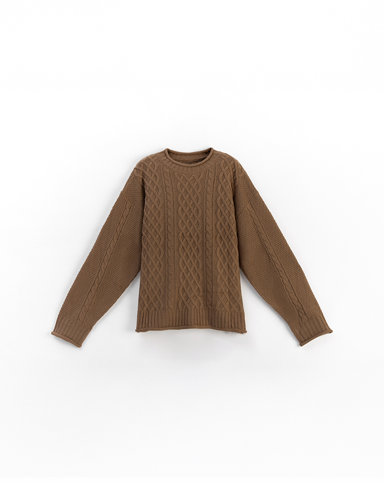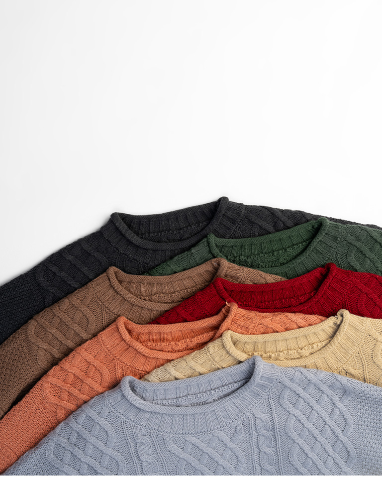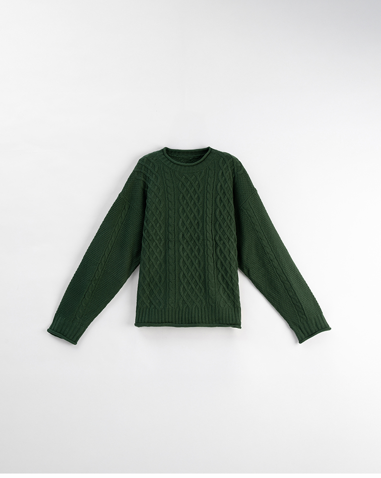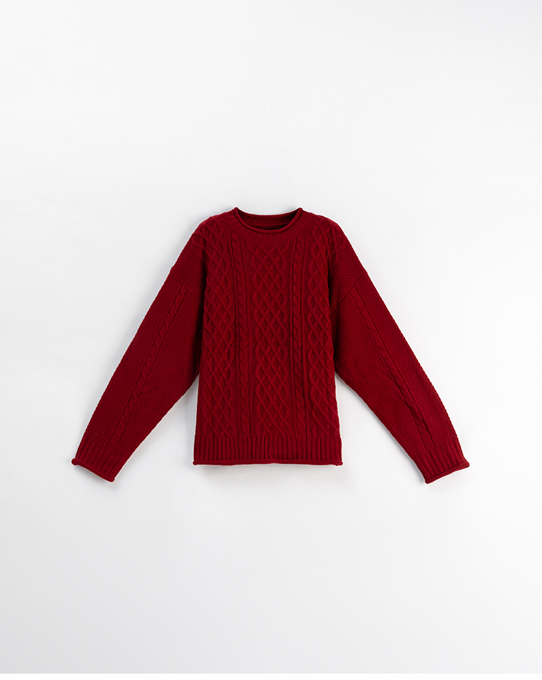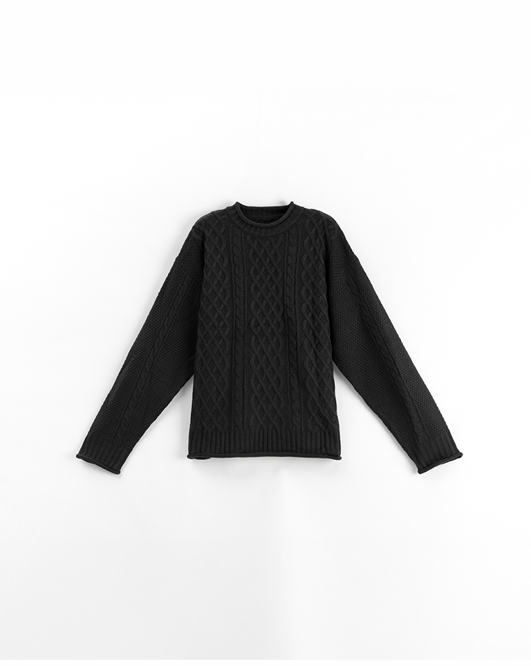 Rolled-hem cable knit wide-cut sweater, available in seven colors.