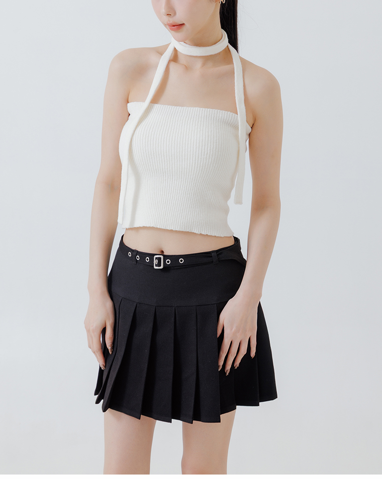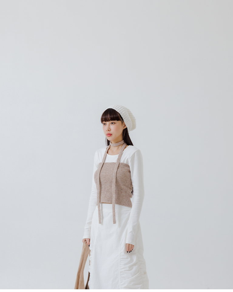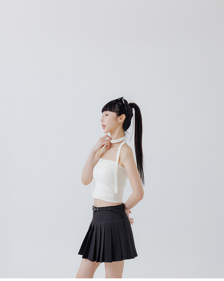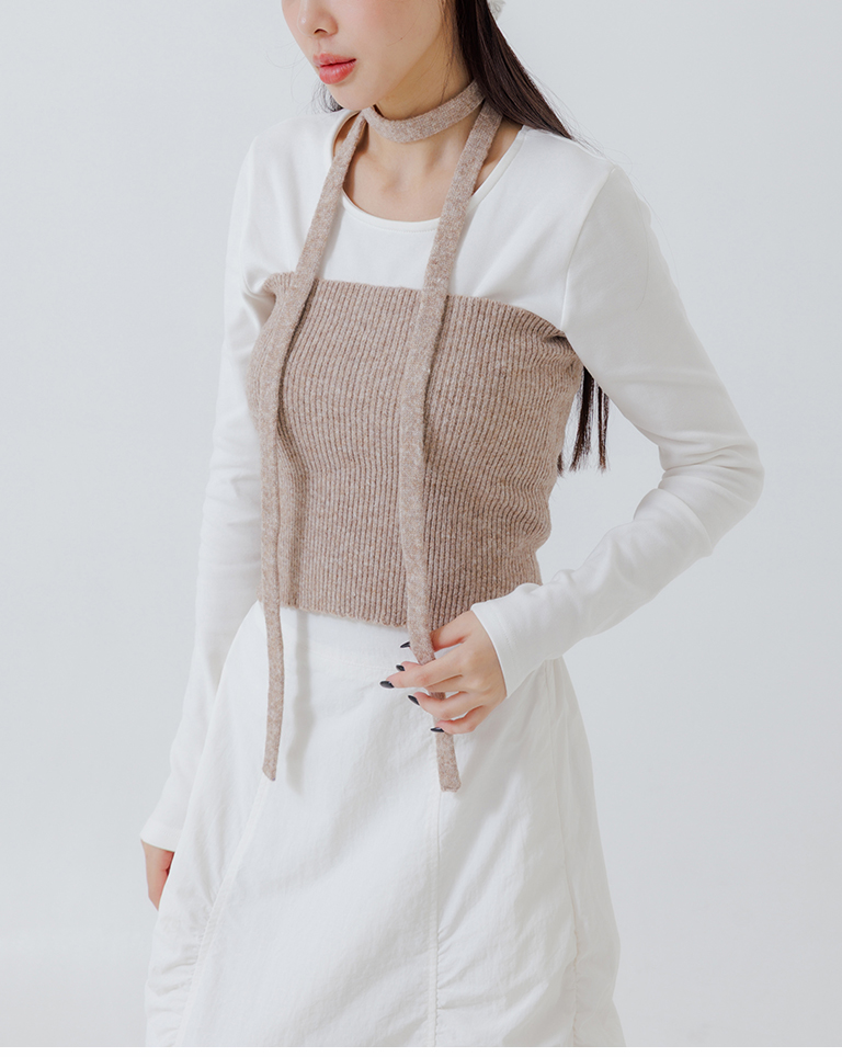 Ribbed fabric, straight hem, with tie detail, available in three colors.