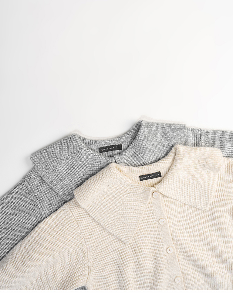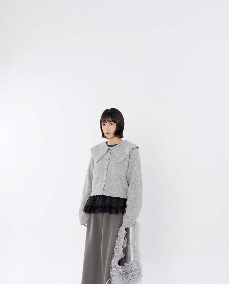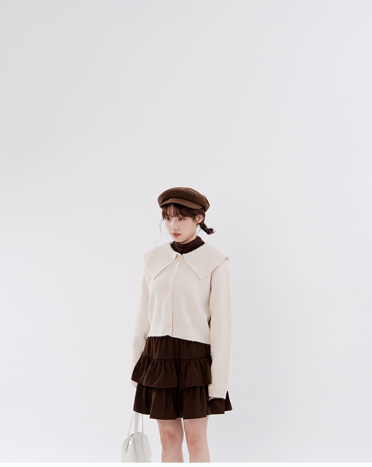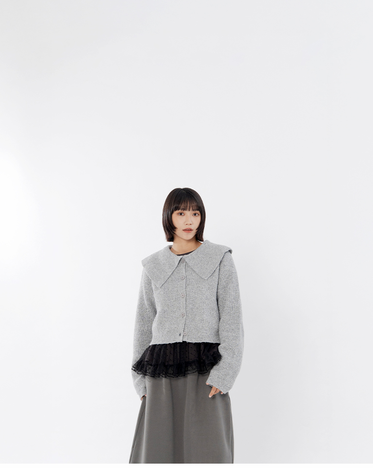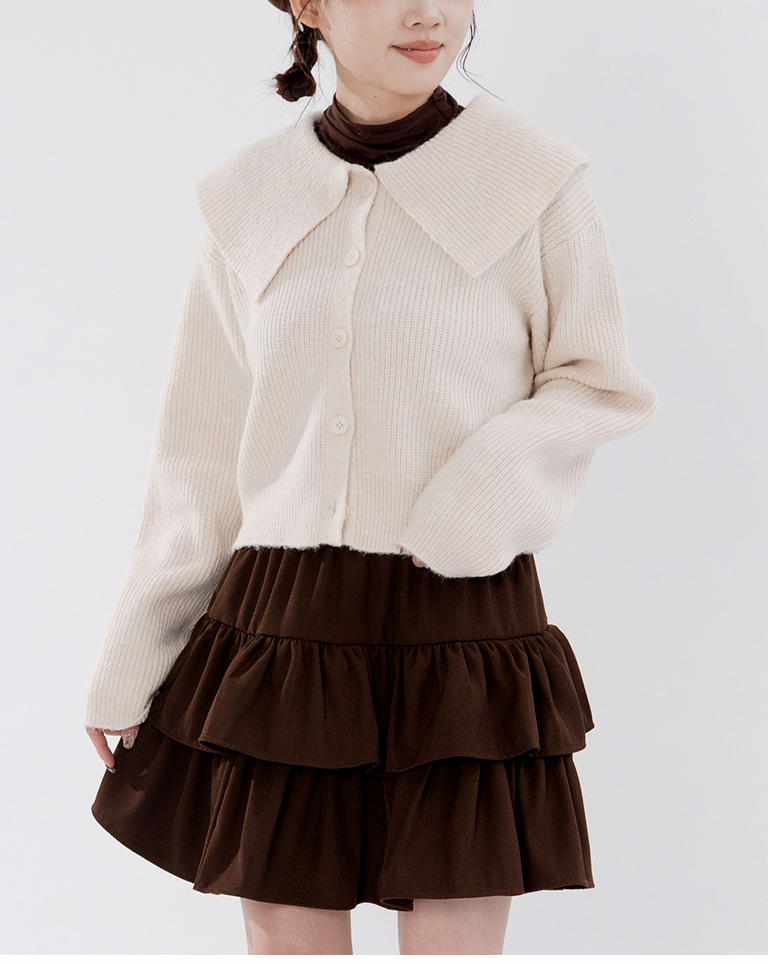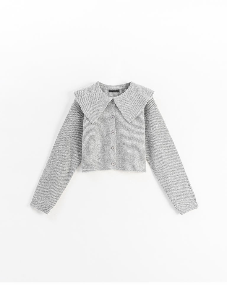 Short-length knit sweater with large collar and button-down design, available in two colors.