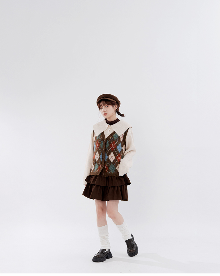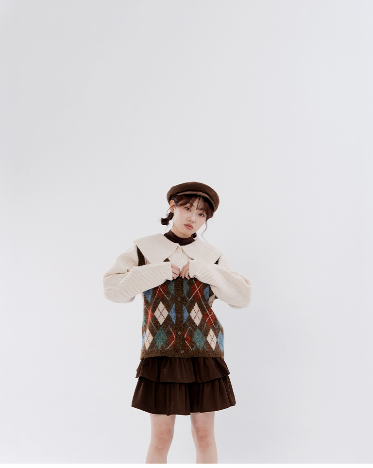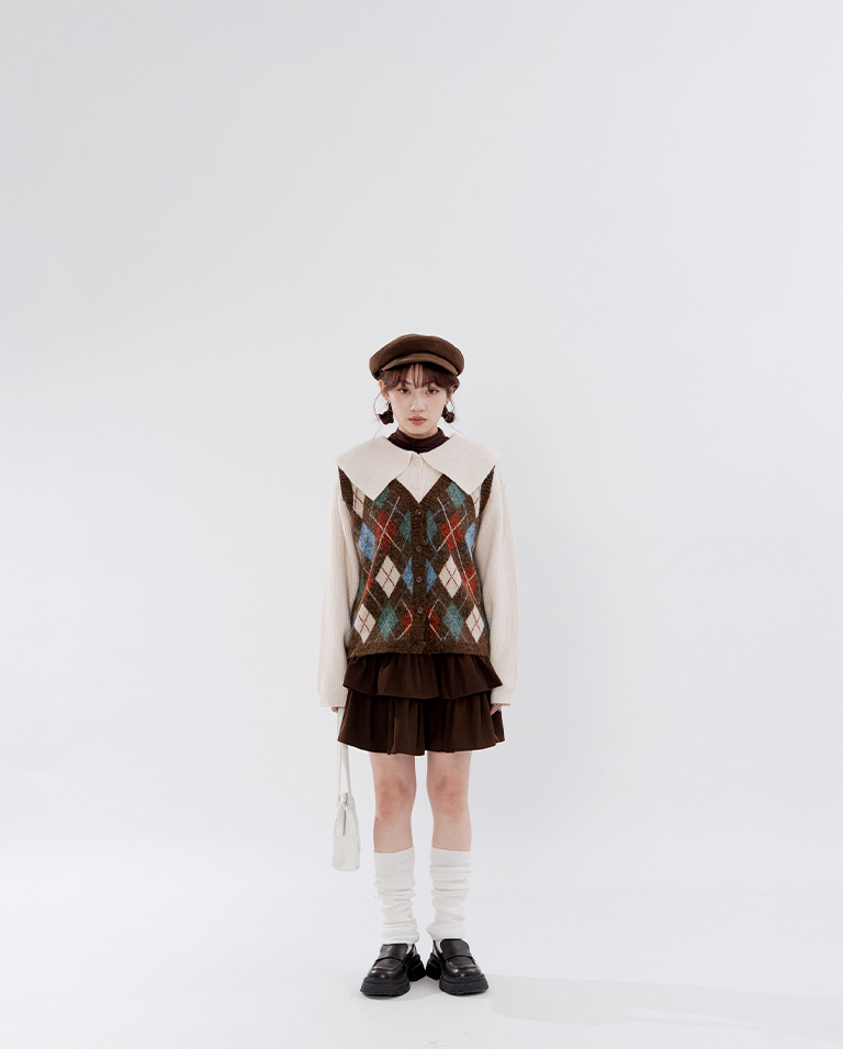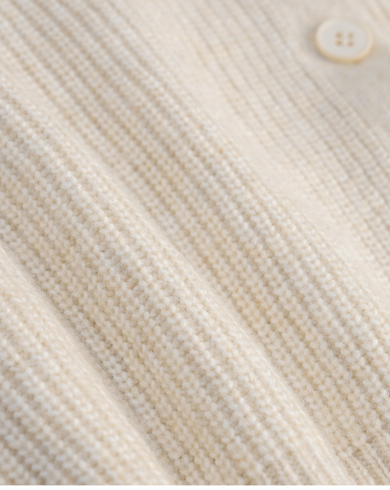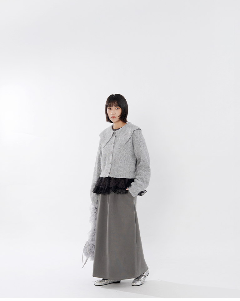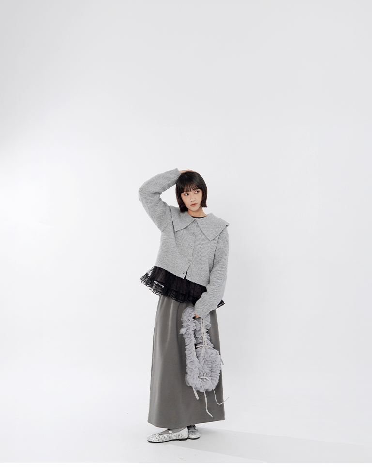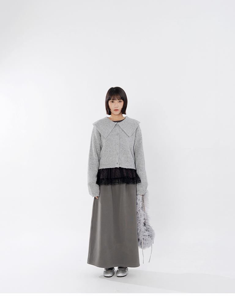 Short-length knit sweater with large collar and button-down design, available in two colors.