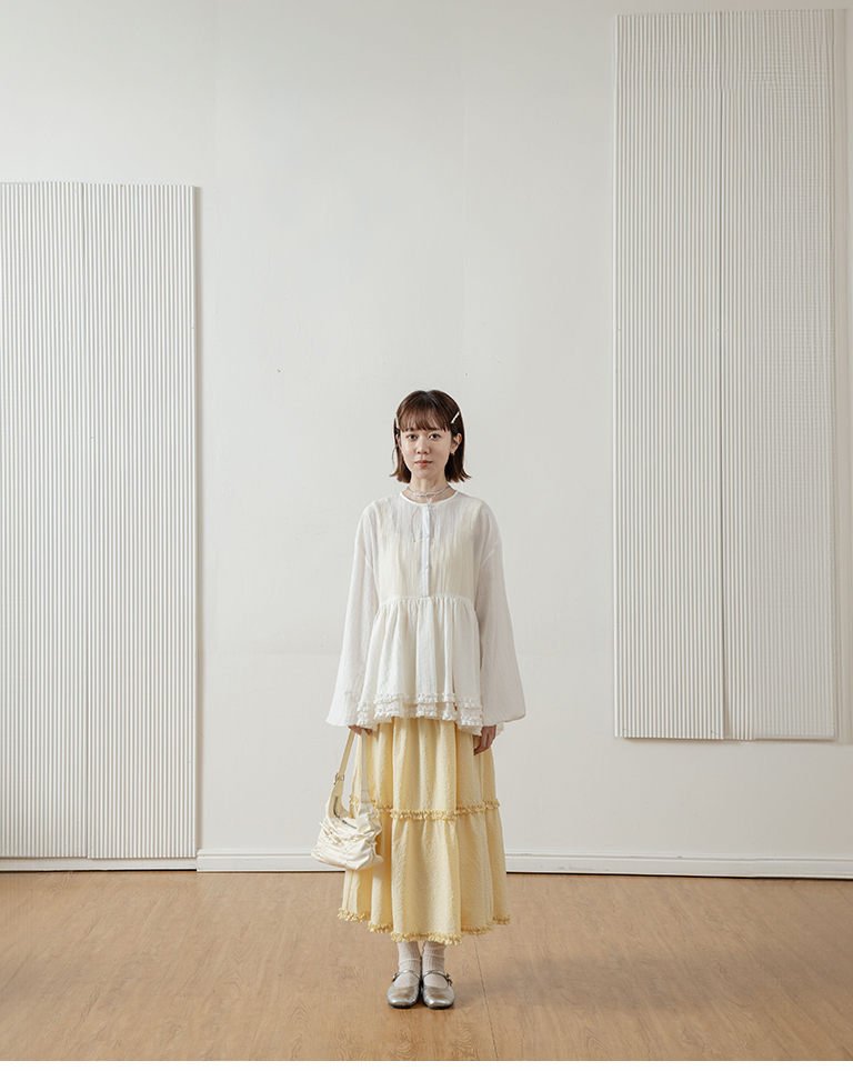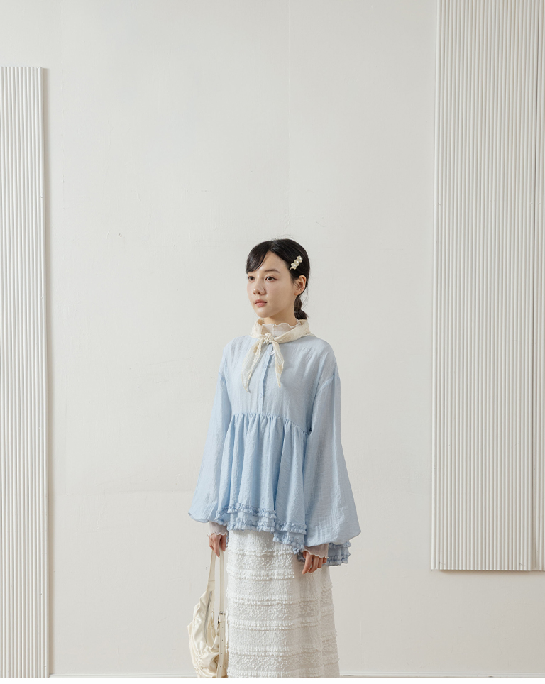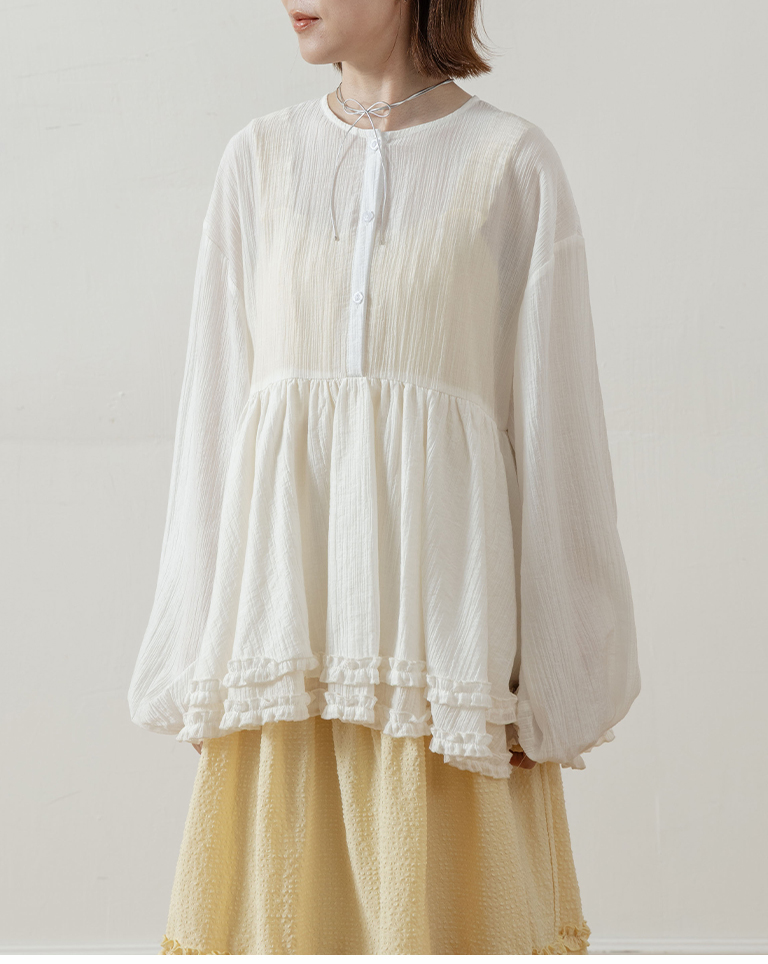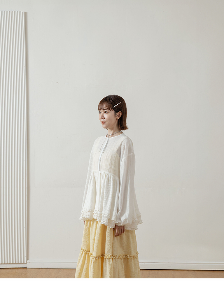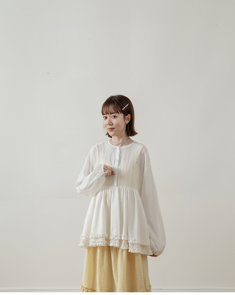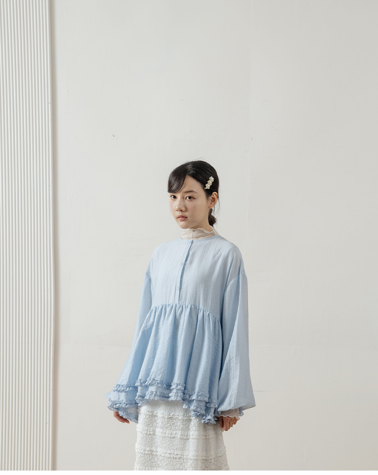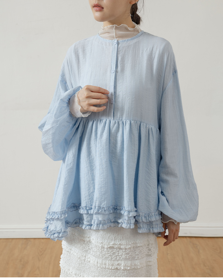 Double-layered ruffled hem top with a mid-length collar, available in two colors.
