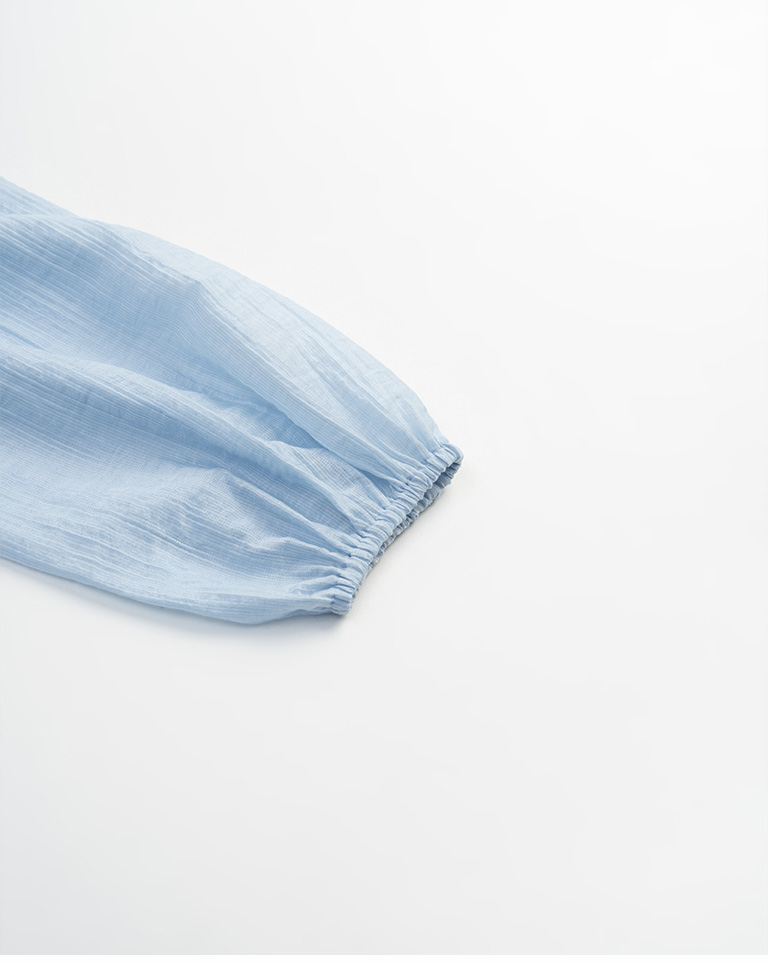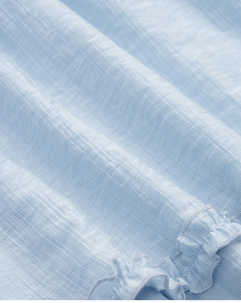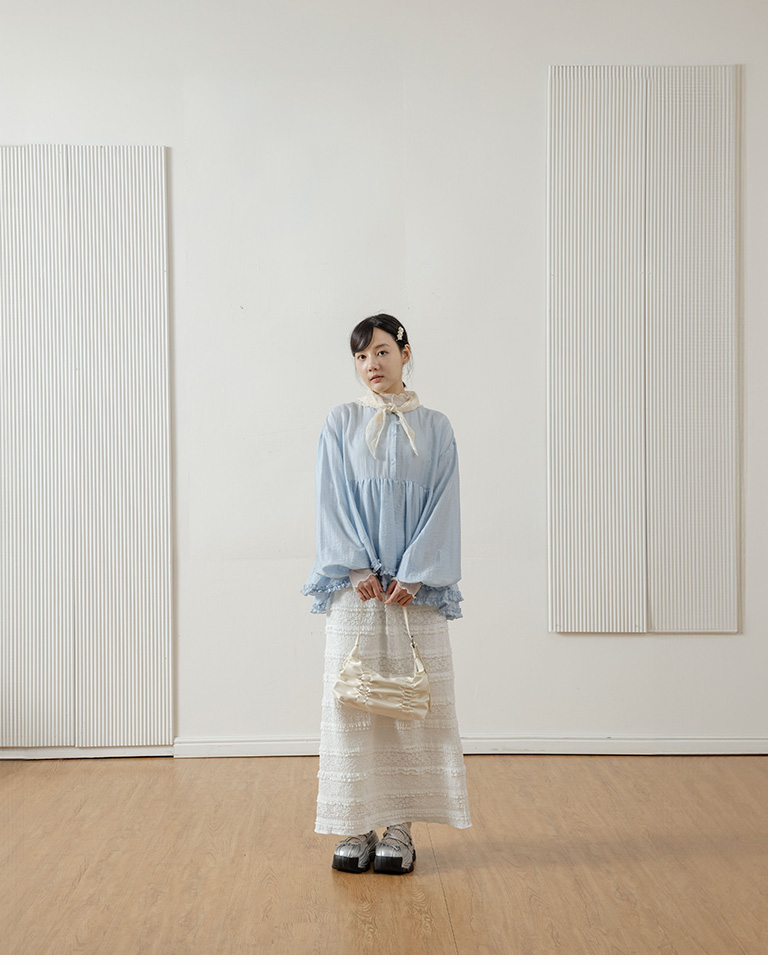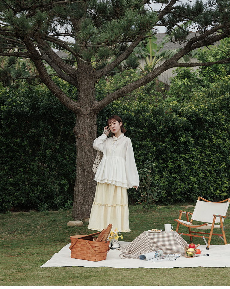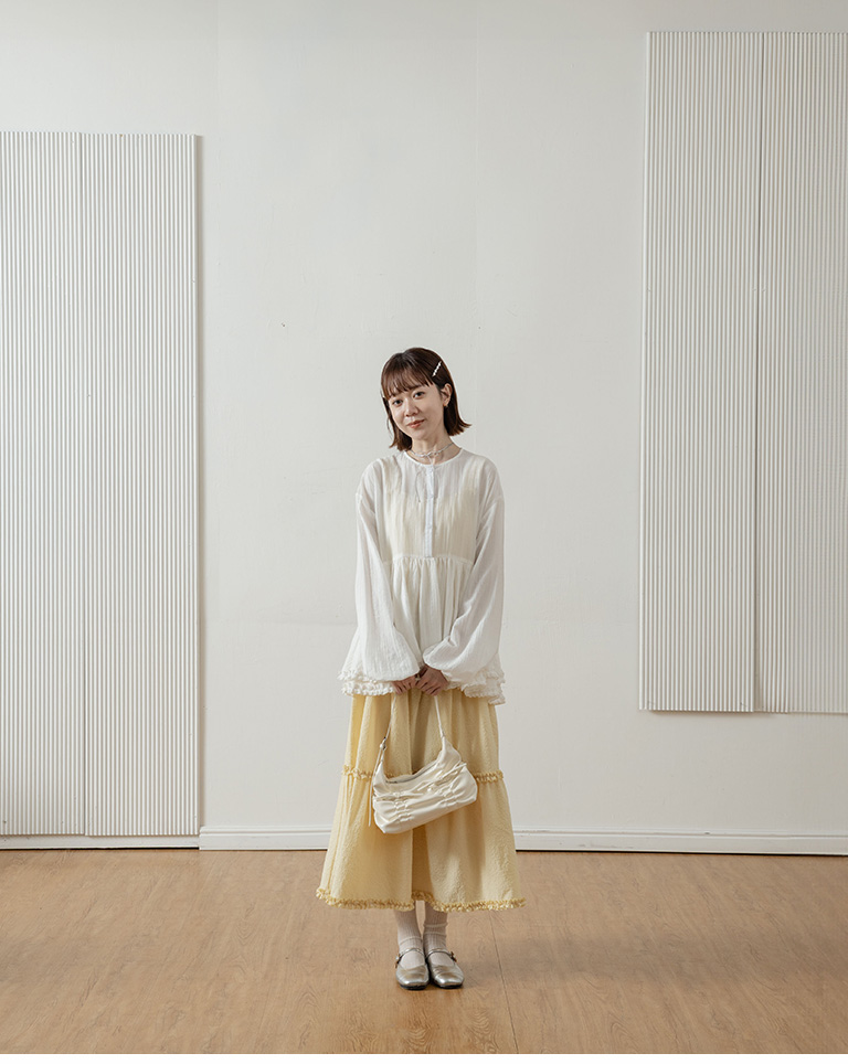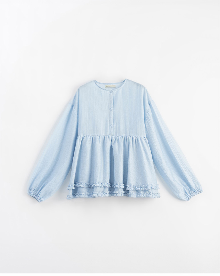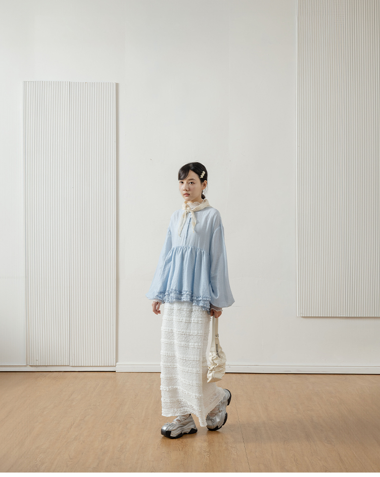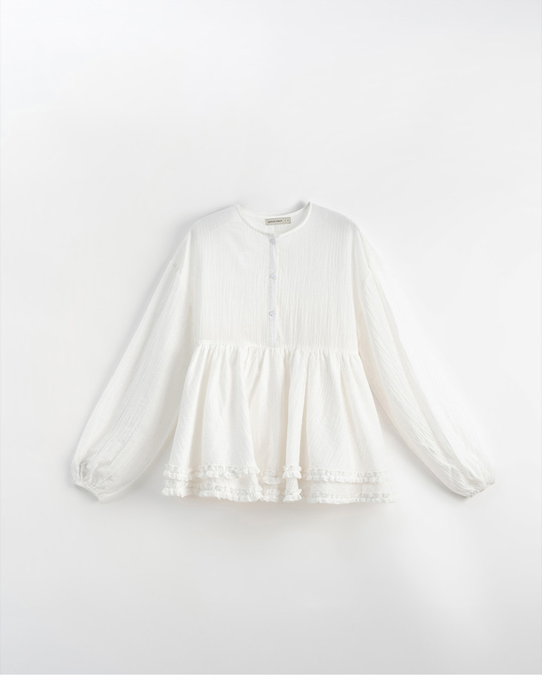 Double-layered ruffled hem top with a mid-length collar, available in two colors.