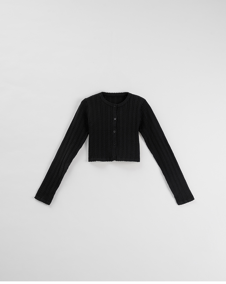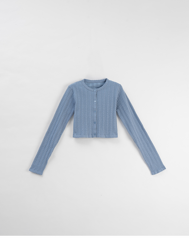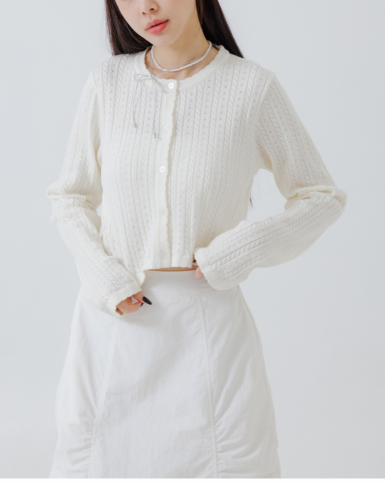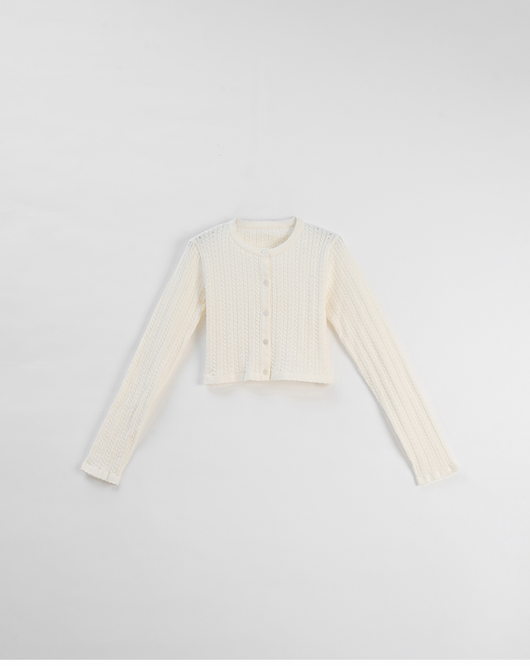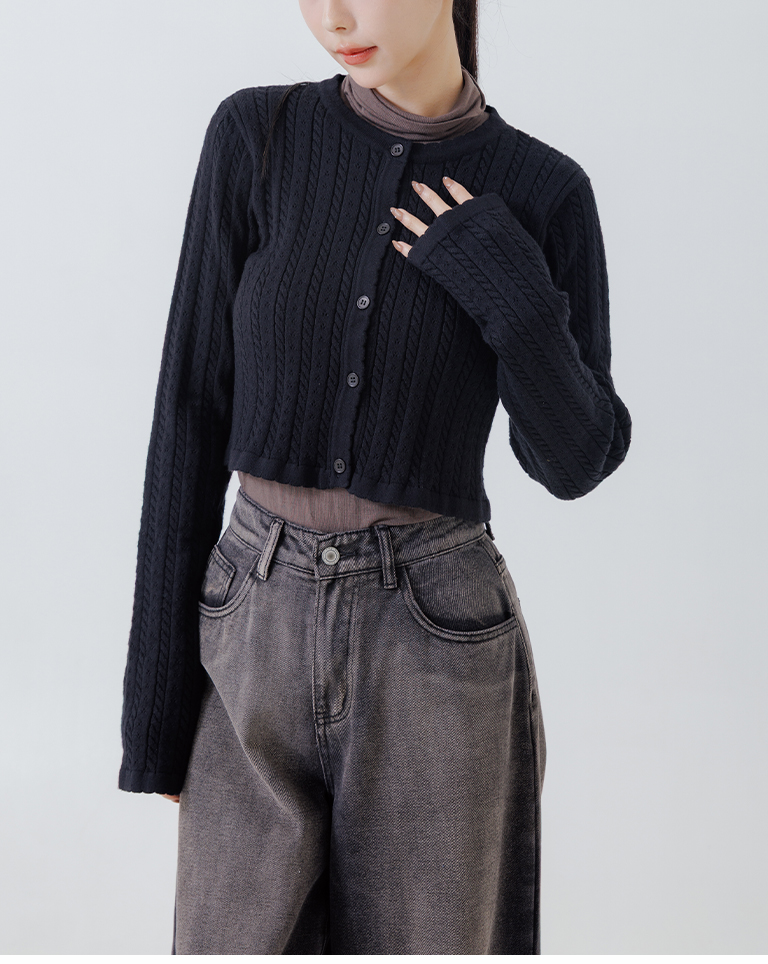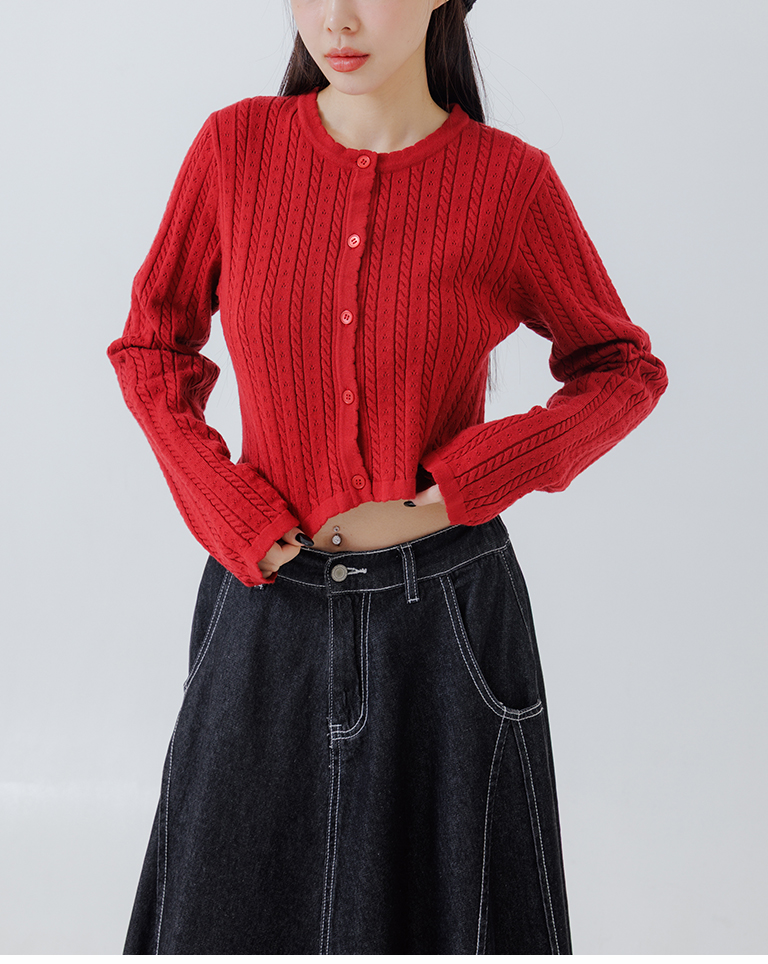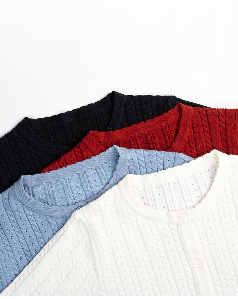 Hollow-out jacquard knit top with button-down design, available in four colors.