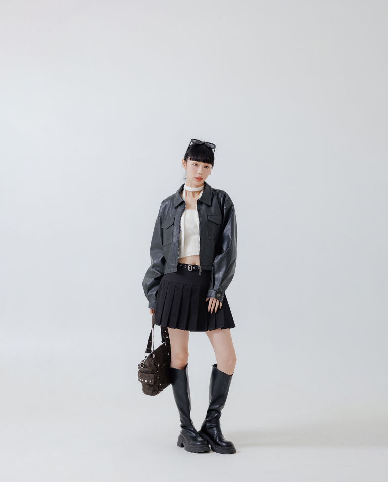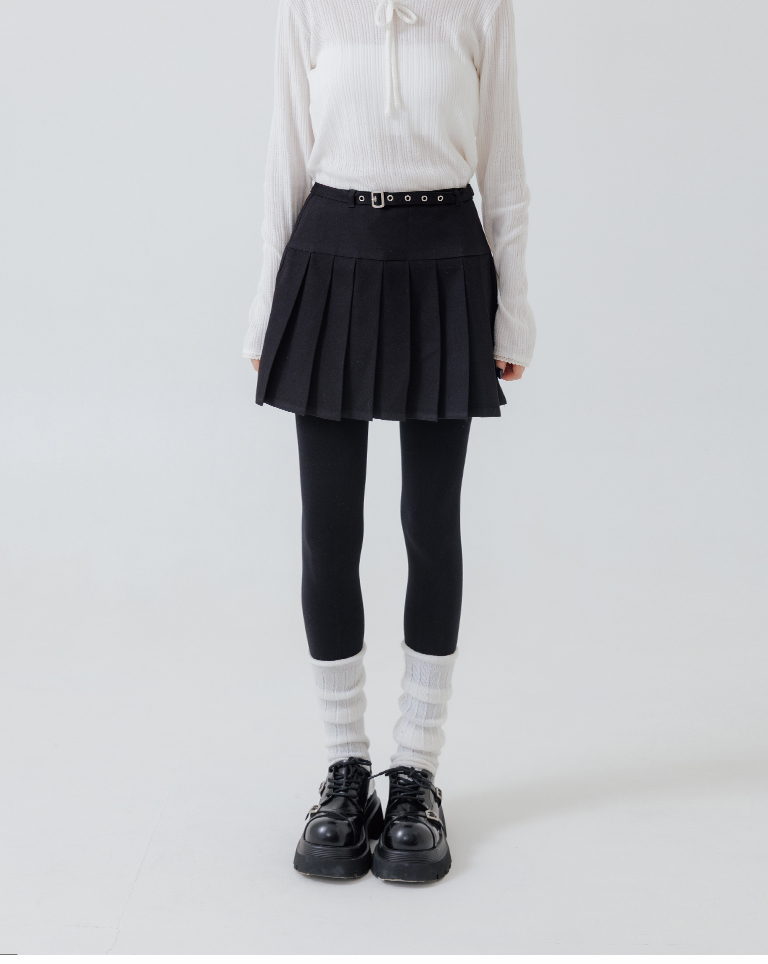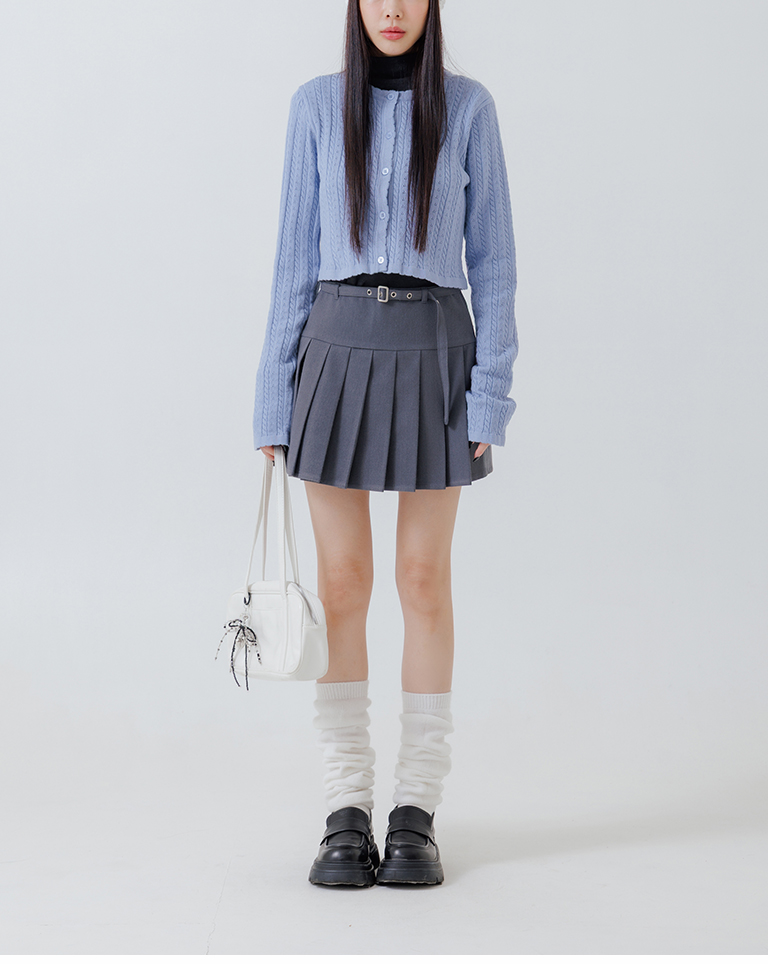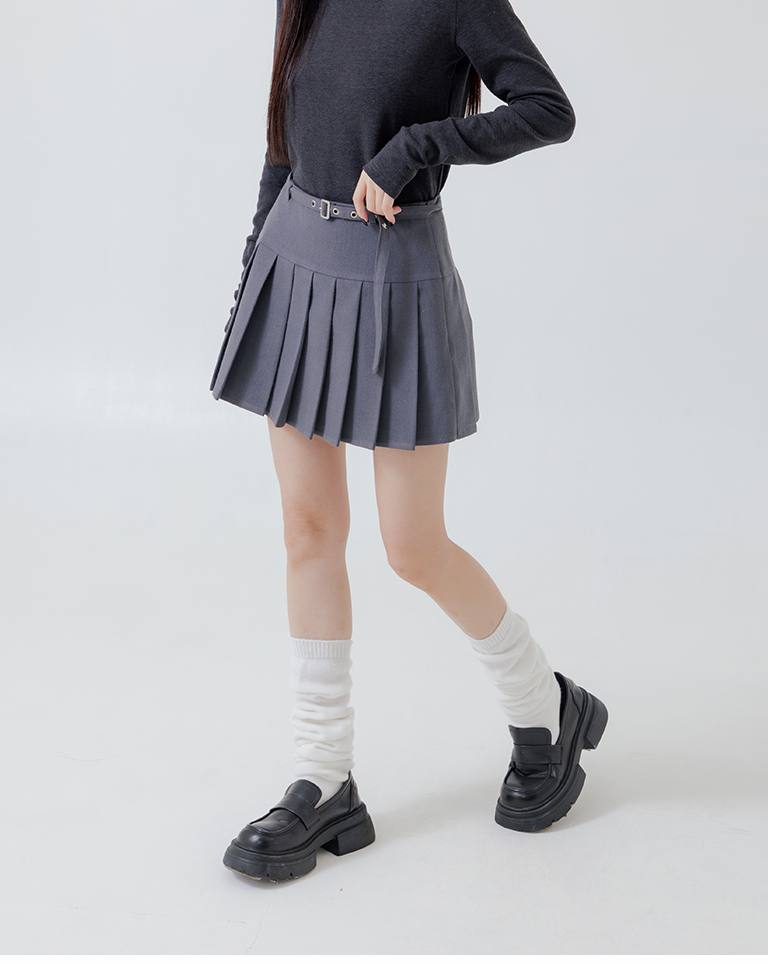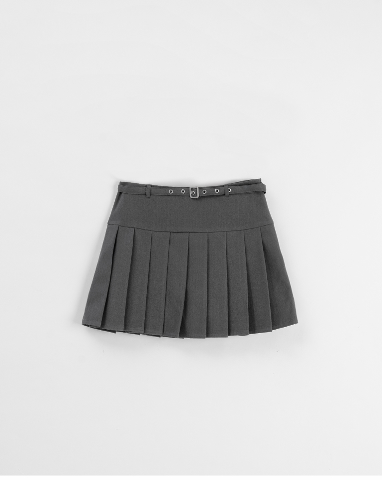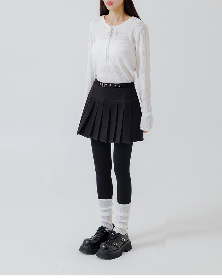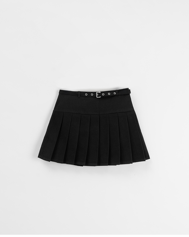 Low-cut design with belted pleated mini skirt, available in two colors, sizes S/M/L.