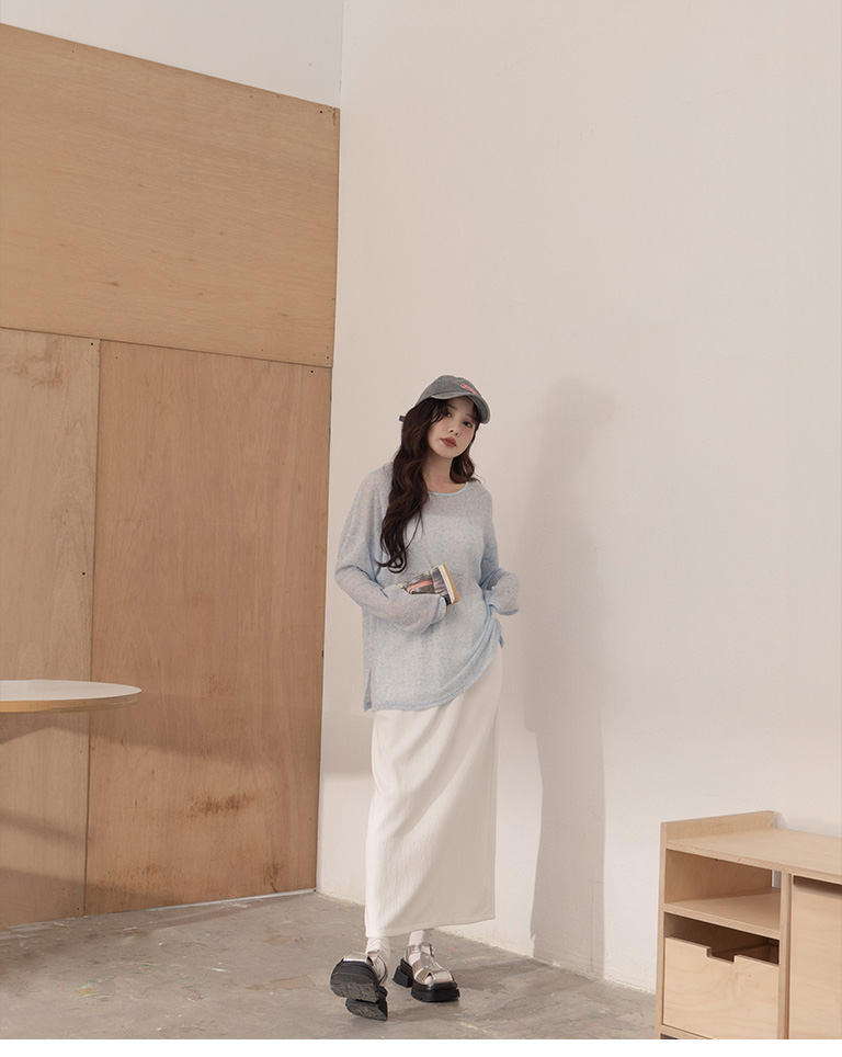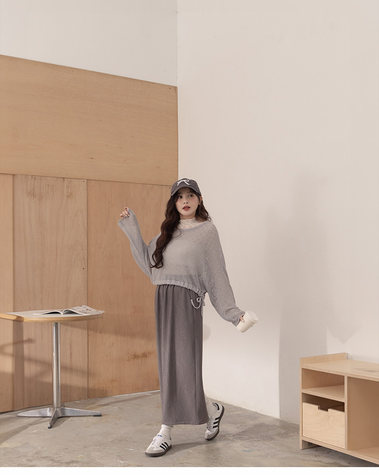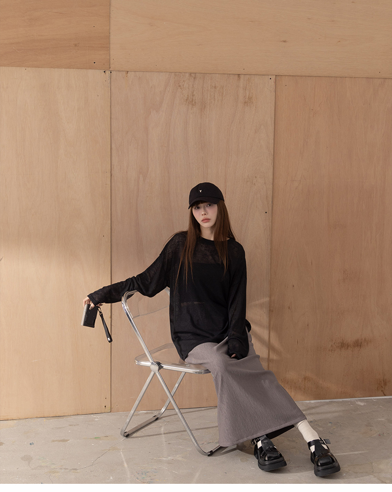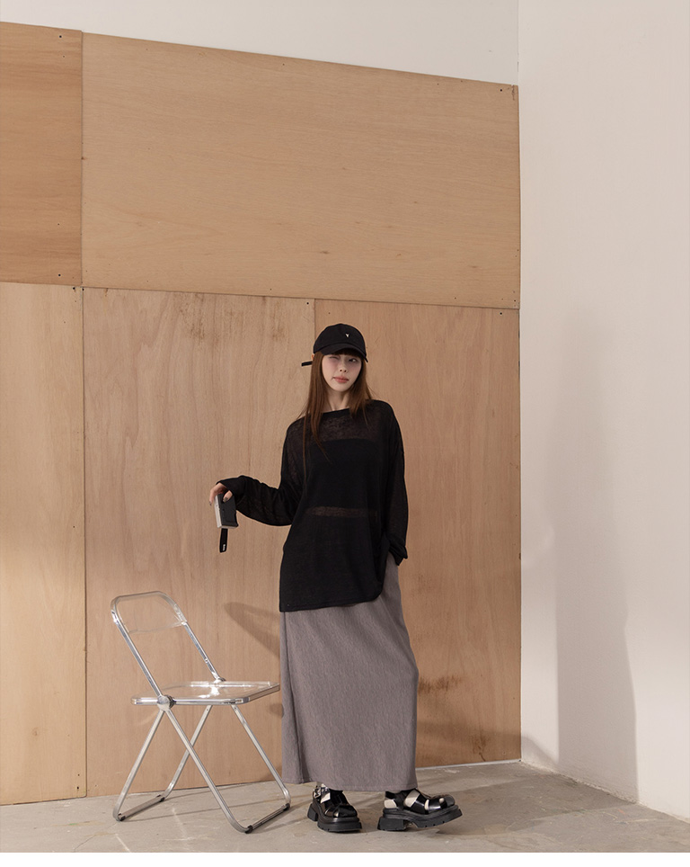 您詢問灰色裙子搭配的黑色上衣為【01098832 混紗針織透膚寬版長袖上衣 三色售】提供給您,謝謝。
