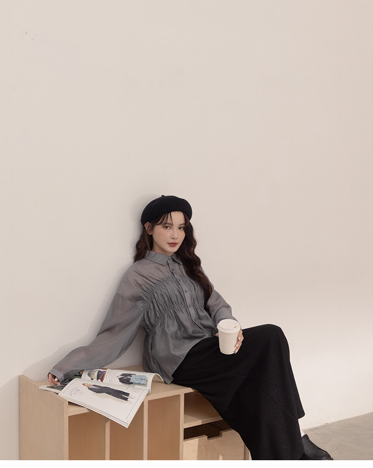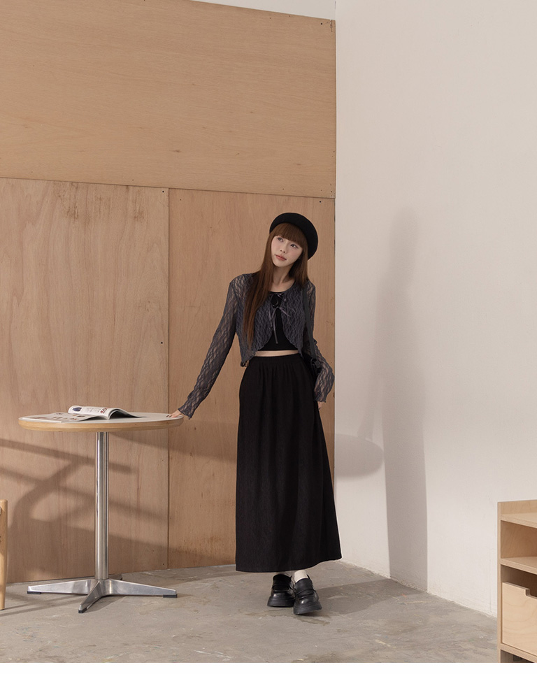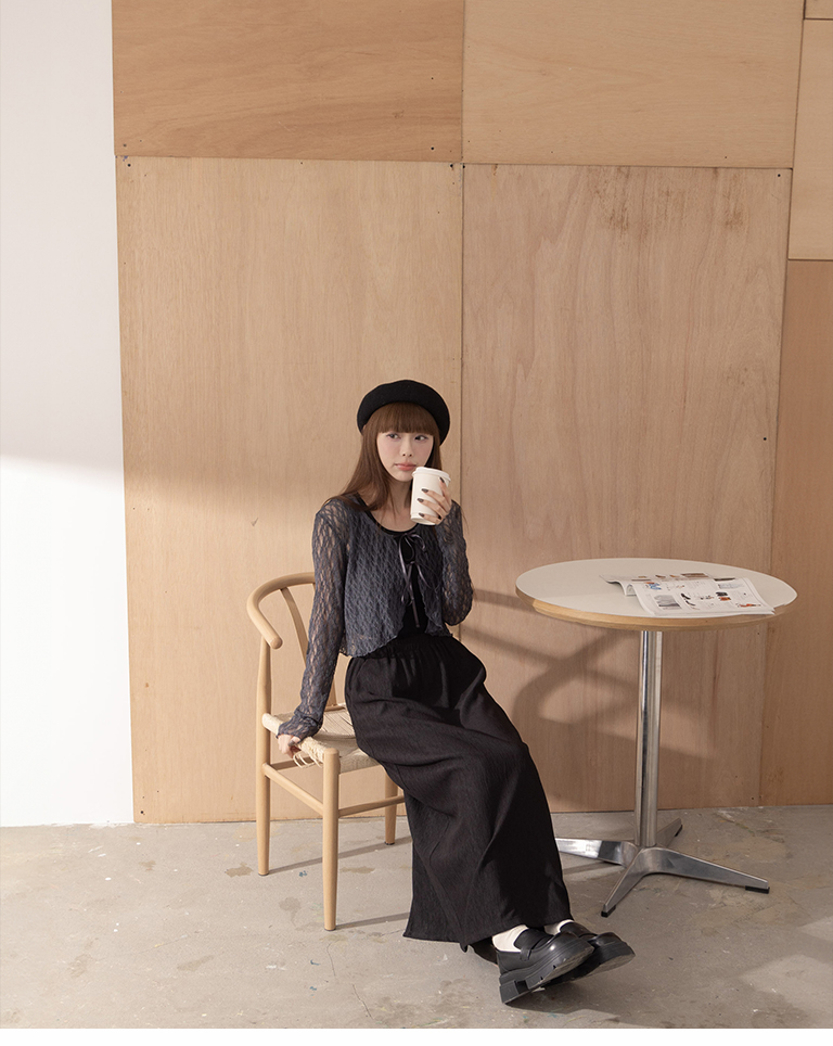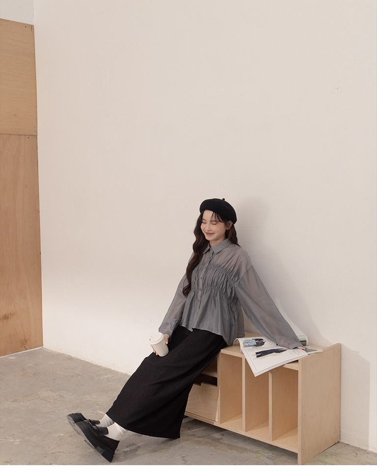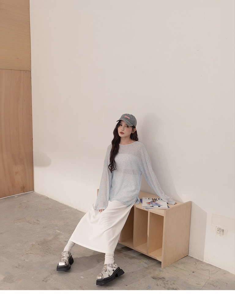 您詢問灰色裙子搭配的黑色上衣為【01098832 混紗針織透膚寬版長袖上衣 三色售】提供給您,謝謝。