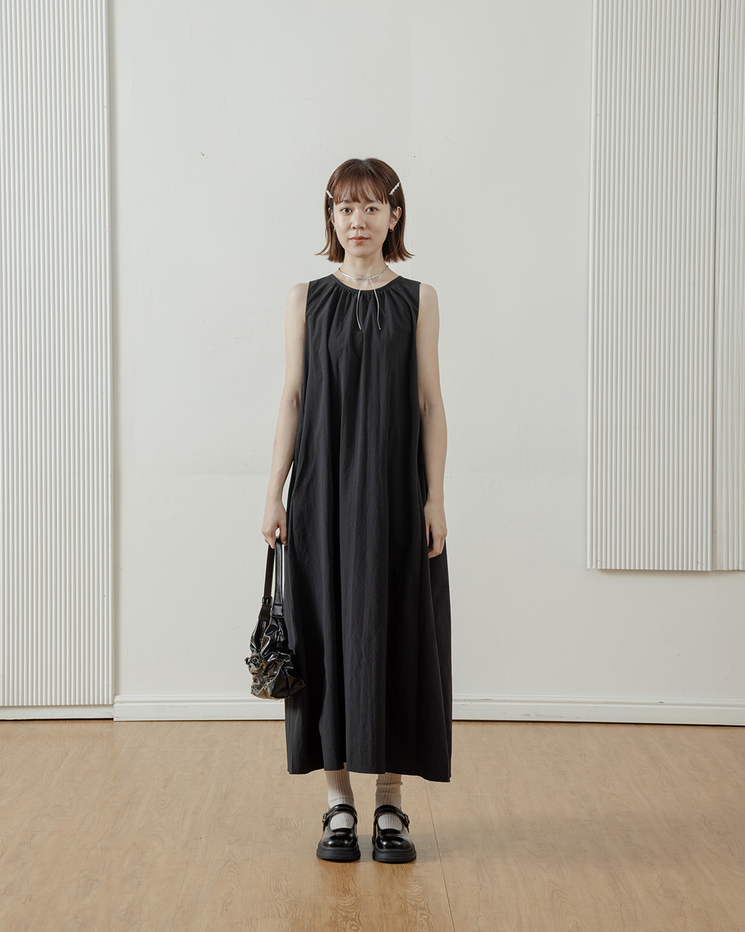 Simple sleeveless long dress with delicate pleats at the neckline, available in two colors.