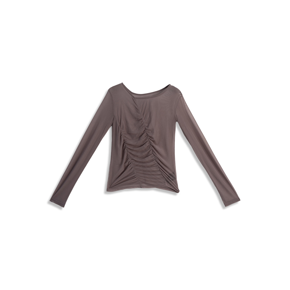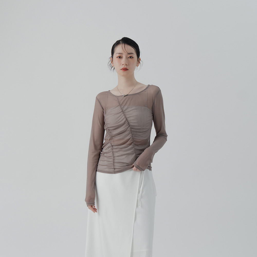 Wrinkled Design Sheer Mesh Long Sleeve Top - Gray