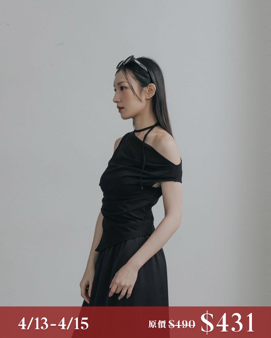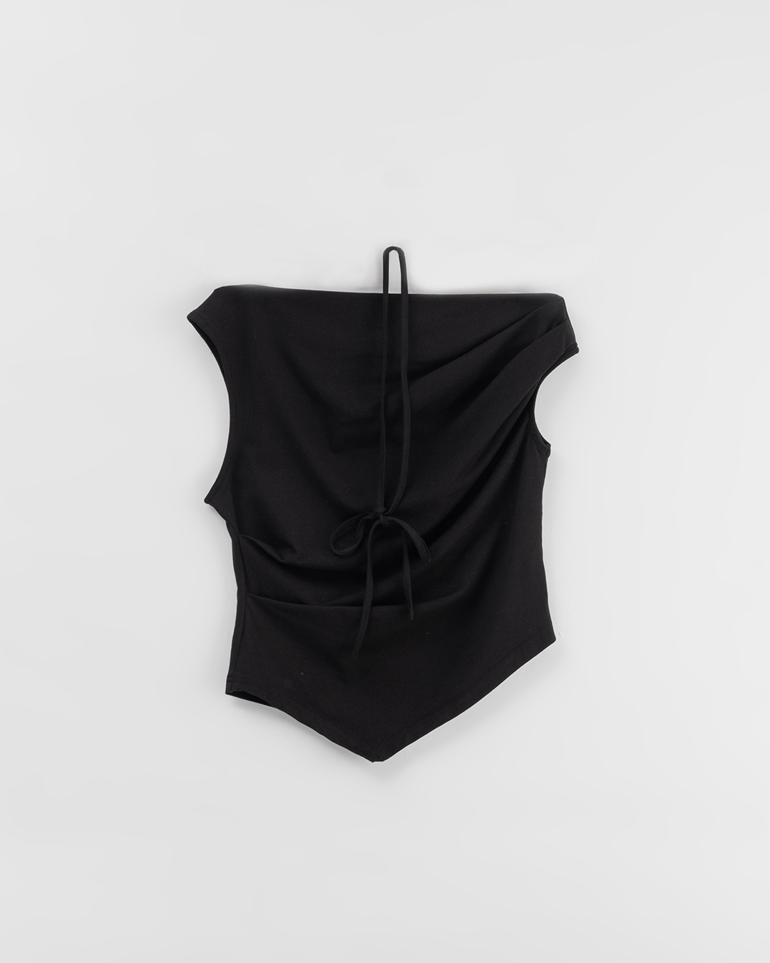 Cooling top with asymmetrical off-shoulder design and tie-up details - black