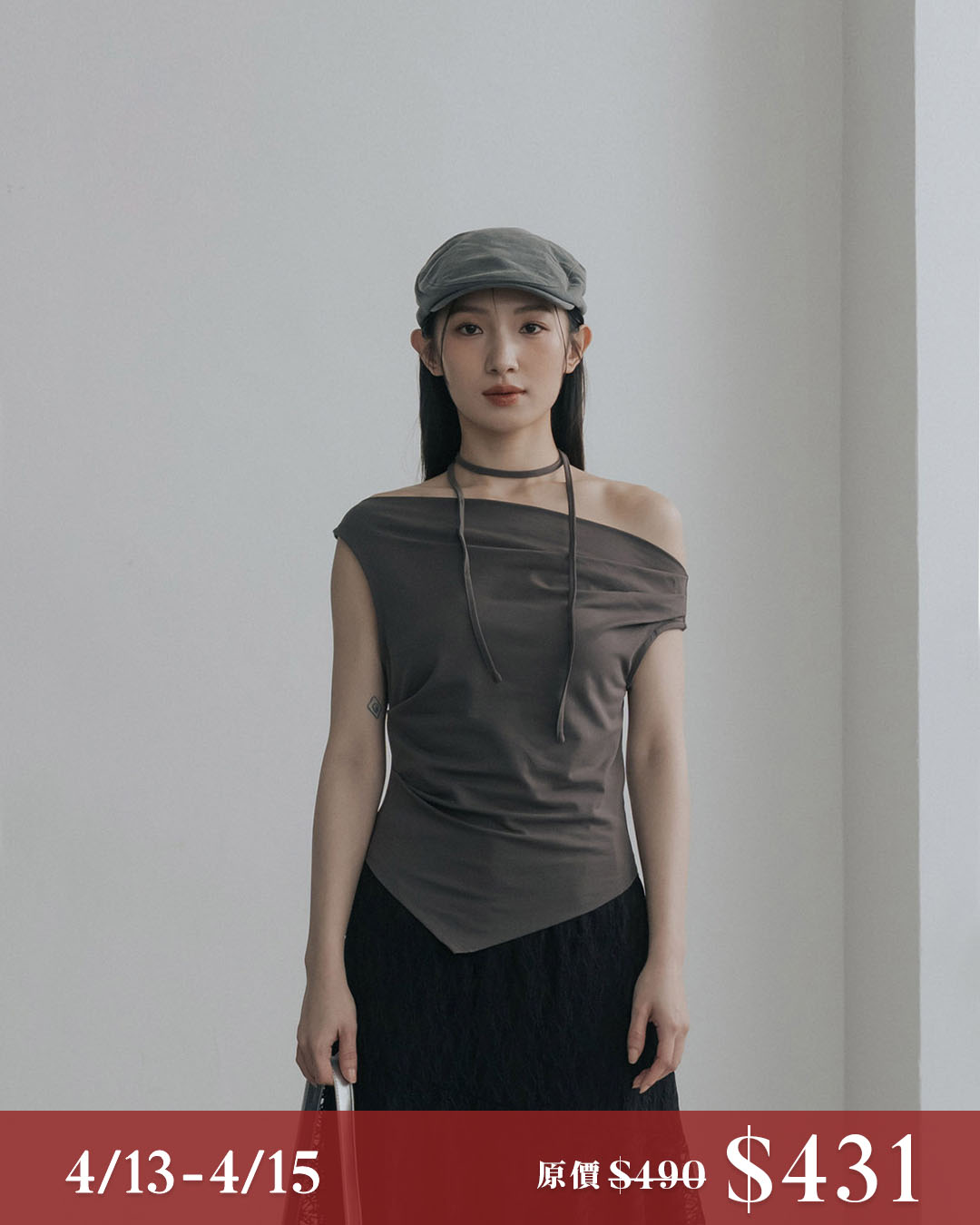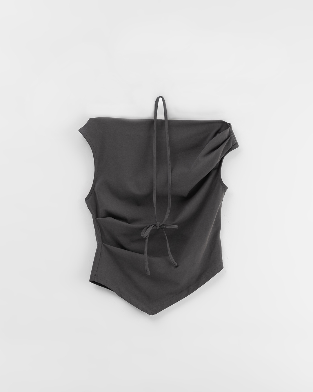 Cooling top with asymmetrical off-shoulder design and tie-up details - gray
