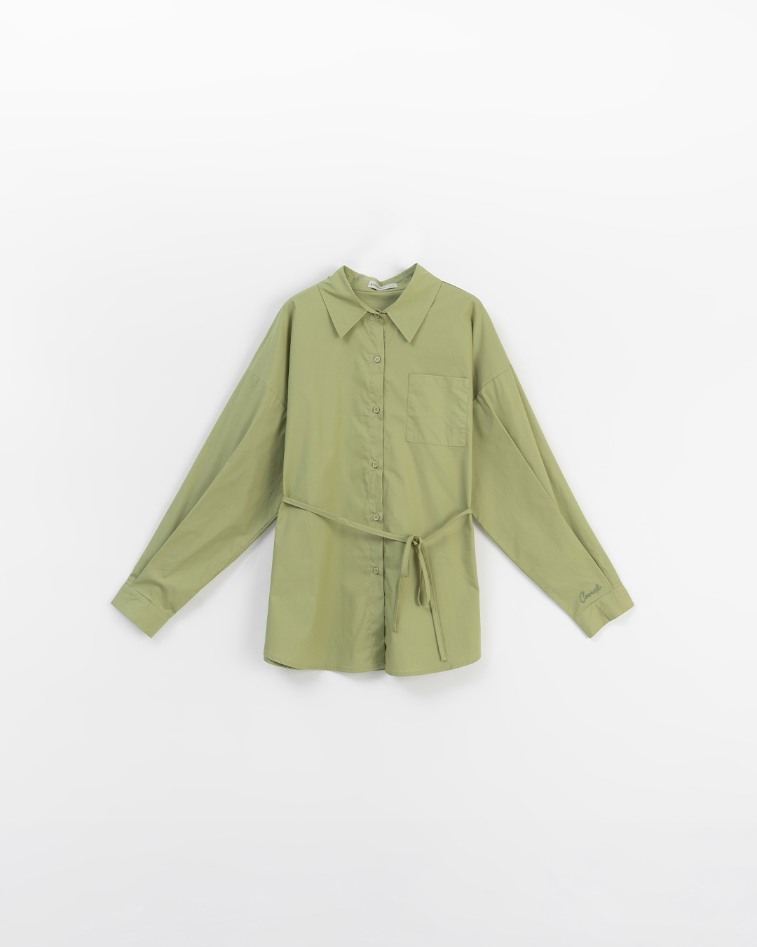 Two-piece long-sleeved dress with ruffled collar and drawstring, available in two colors.