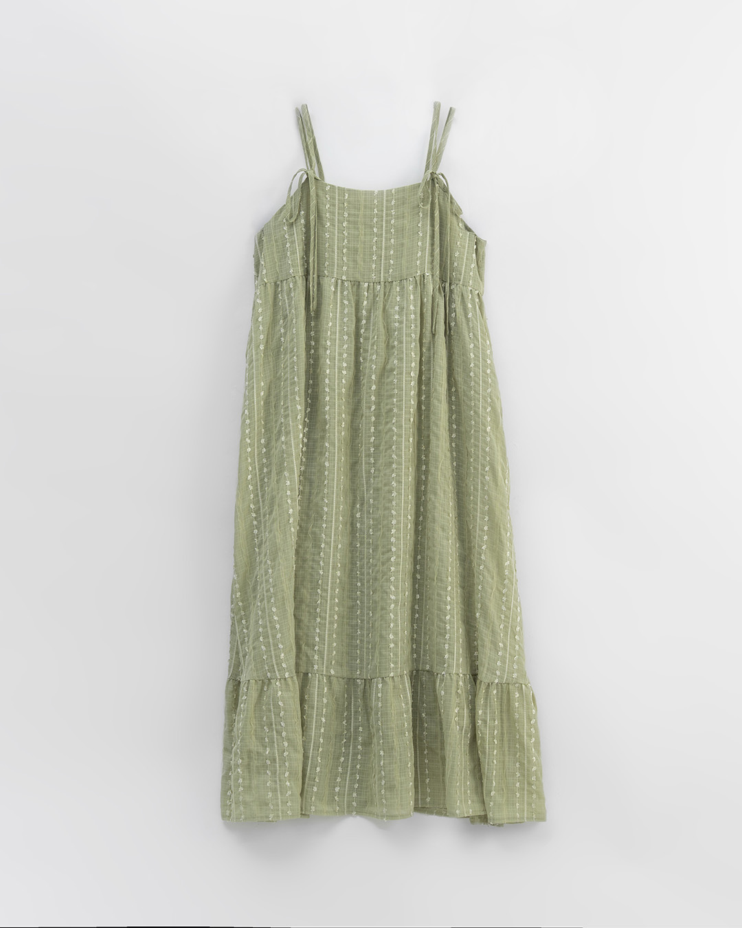 Double-strapped, three-dimensional floral patterned spaghetti strap long dress, available in three colors.