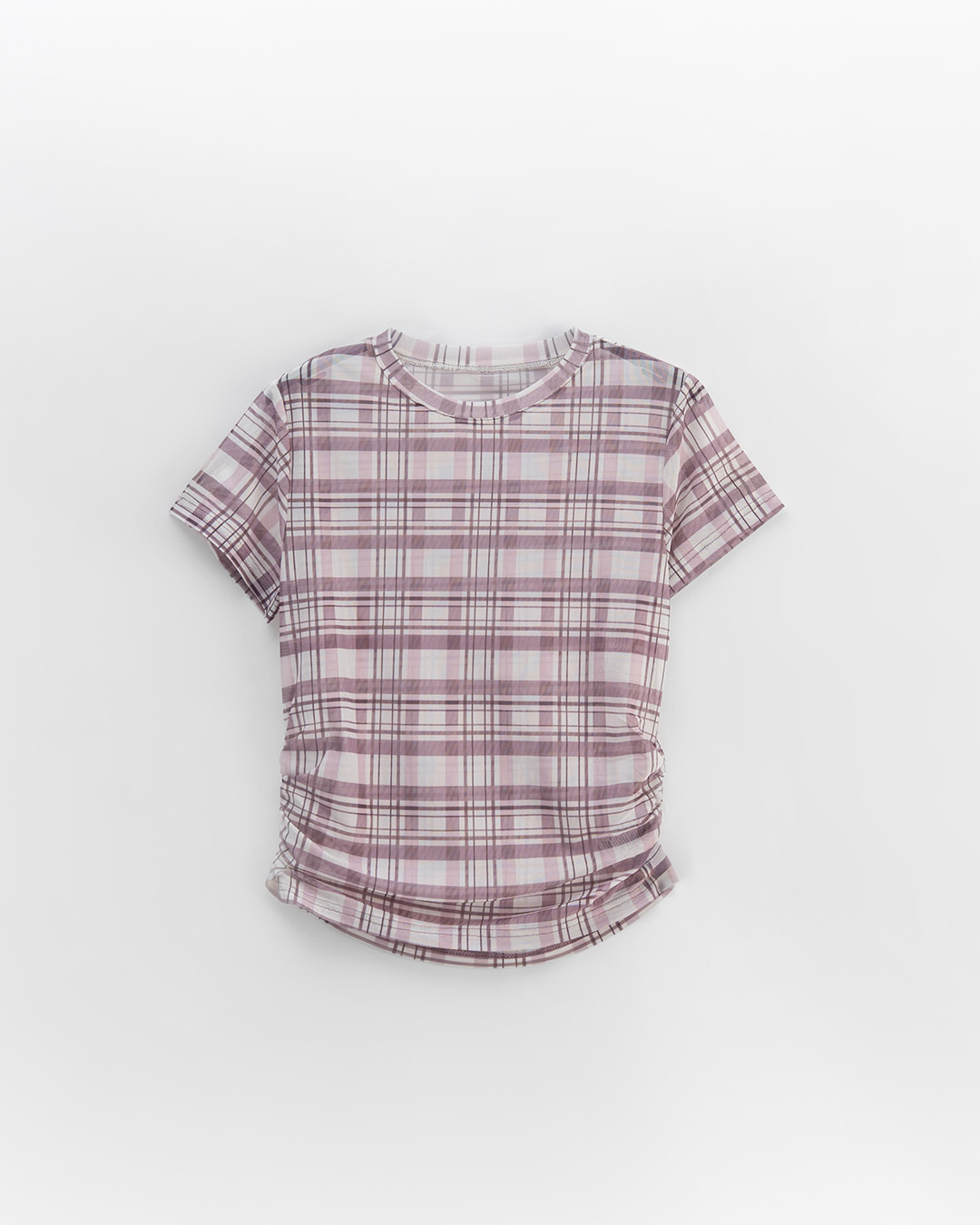 Color-blocked plaid side-ruched sheer short-sleeved top, available in three colors, S/M.