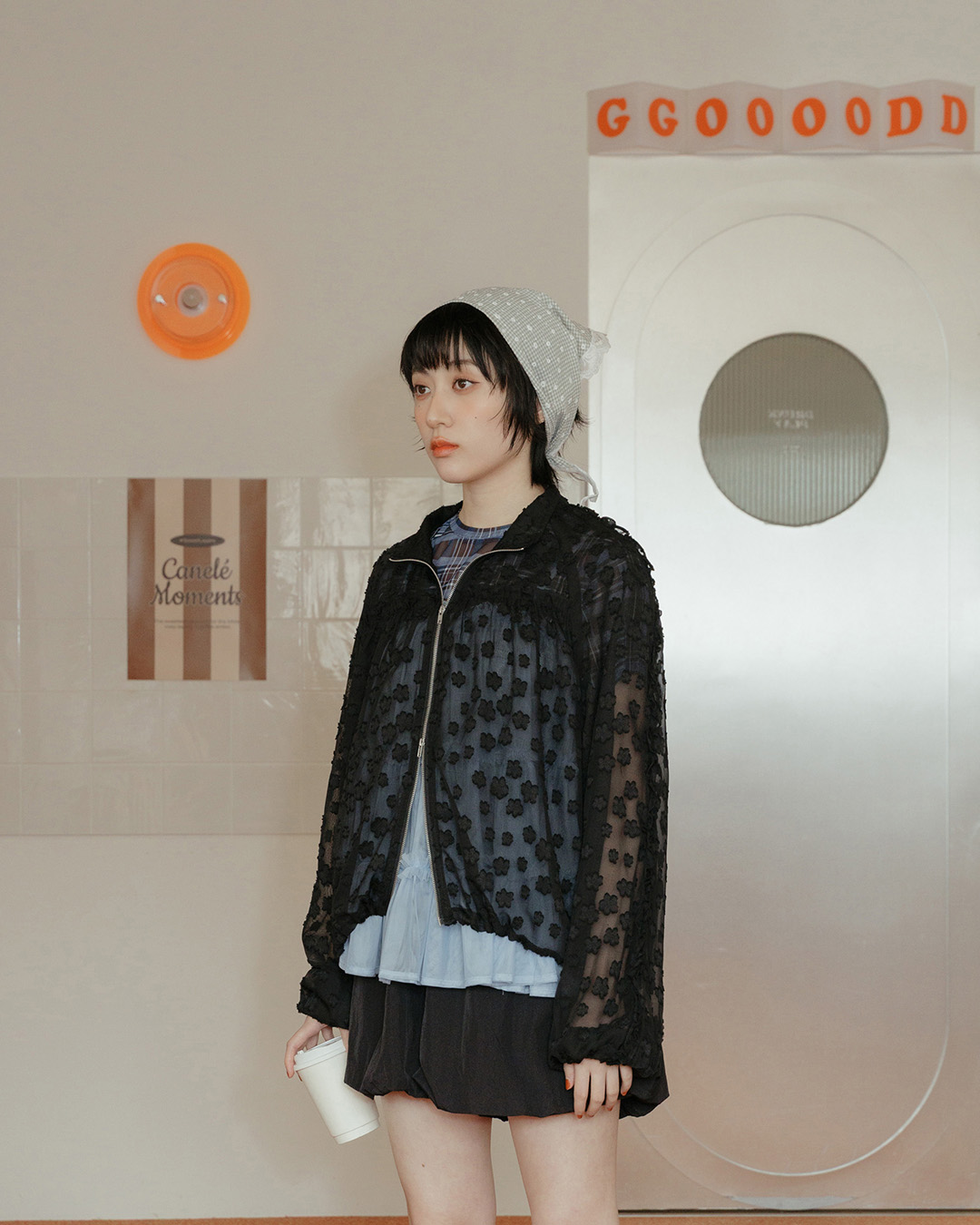 3D jacquard double-zipper sheer jacket, available in two colors.