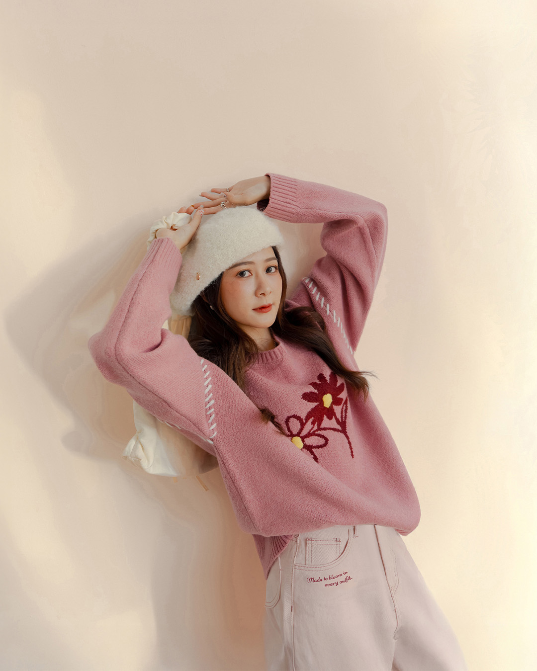 Peixuan Joint 3D Hand-painted Flower Embroidery Stitched Knitted Sweater - Pink