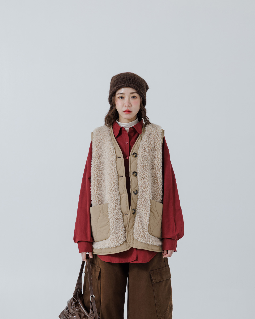Quilted and padded wide-leg vest with lamb wool trim, available in three colors.