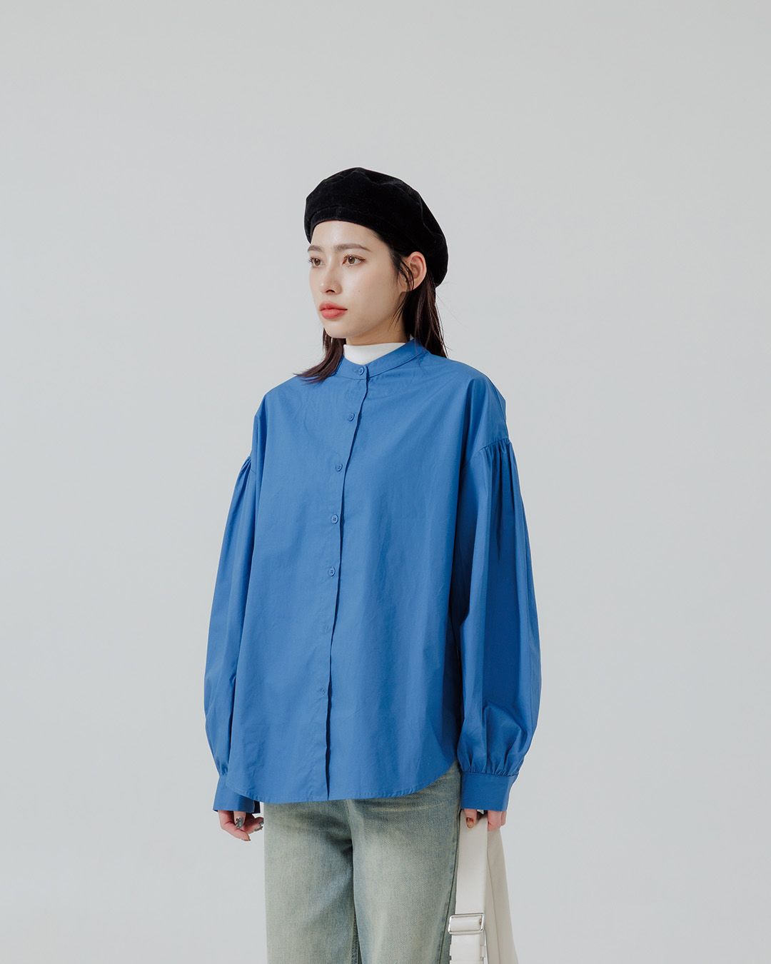 Zhongshan collar, puff sleeves, fine pleats, wide-cut shirt, available in two colors.