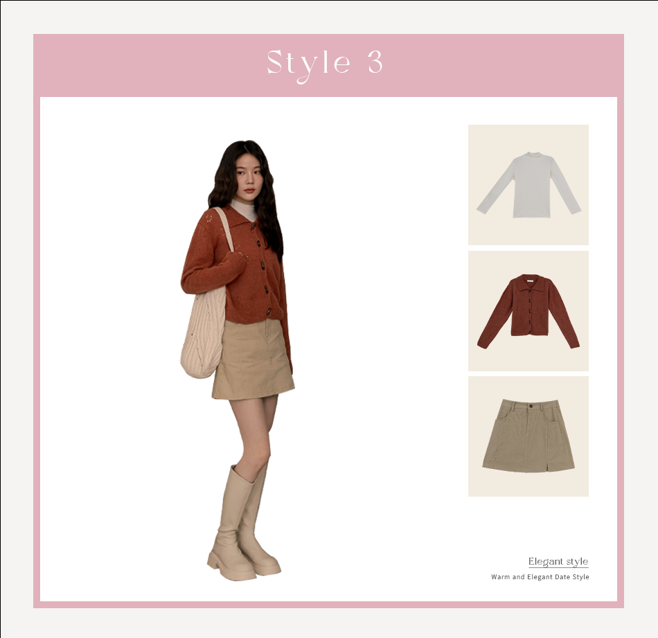 粉色的高領上衣外面搭件卡其色燈心絨外套,多了份成熟氣質感,外套釦子只扣上一顆,就可以藉由擺動偶爾露出粉色的內搭來增添整體的層次感。下面搭配卡其色燈心絨短裙,與外套互相呼應,穿出套裝感。