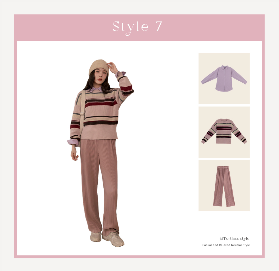 誰說粉色只能走甜美氣質路線呢?在粉色條紋毛衣裡搭配一件同色系的粉紫色襯衫,翻出領片與袖口外折,讓整體造型有層次不單調。下身搭配粉色光澤感的坑條落地褲,不僅視覺上拉長腿部效果,還可以遮臀部肉肉,穿起來舒服又好看!