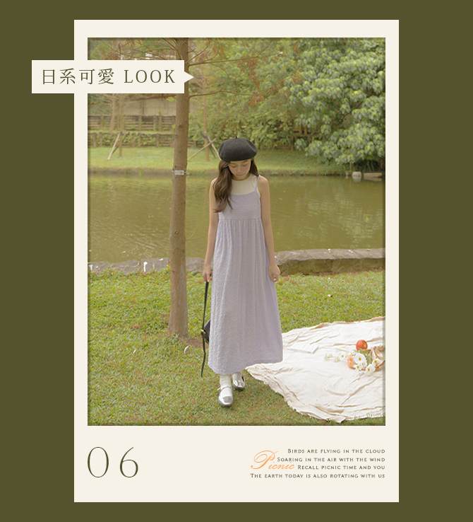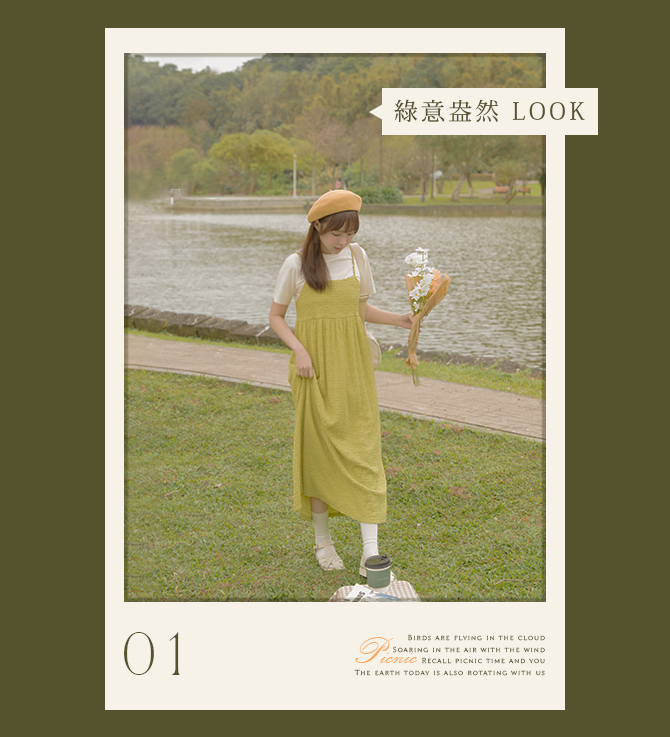 簡單的素色白T搭配皺皺洋裝,不但能凸顯洋裝面料的質感,腰際線剪裁延展下身比例,方領設計又顯臉小,讓身形看起來更纖細修長。簡單穿出質樸純淨的野餐LOOK!