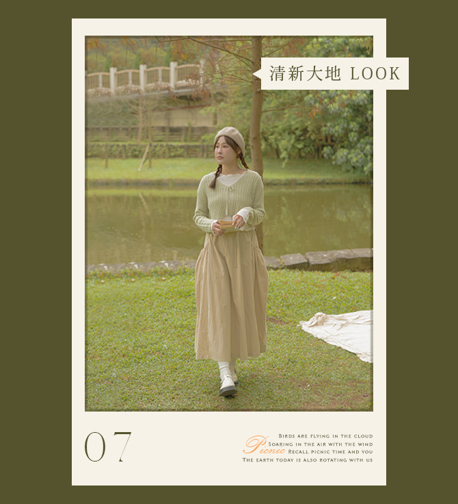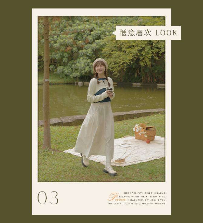 這次選擇白色針織上衣來做搭配,極短版版型非常修飾上身身形,內搭的皺皺上衣增添整體設計細節,兩種看似衝突的單品搭配起來卻意外的和諧。下半身選擇A字剪裁的傘擺裙,大口袋設計方便又實用,輕鬆穿出質感野餐LOOK!