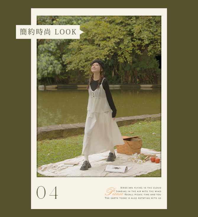 單穿單薄乏味,這次外加件立體緹花雙綁外罩來做搭配,深色內搭上衣讓緹花更顯效果,搭配A字剪裁的傘擺裙,再配雙皮鞋更增添整體氣質時尚感。相較熱鬧氛圍,偶爾來場優雅的野餐時光也不錯哦!