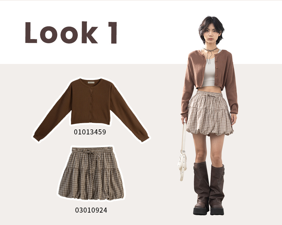 灰白背心打底,外面搭配一件咖啡色圓領針織短版上衣, 隨意解開釦子就能瞬間帶出俏皮小巧思。 下身咖啡色格紋氣球短裙,蓬鬆造型活潑又可愛,內裡安全褲讓每一步都自在。 厚底靴收束比例,讓腿型修長又有精神感。 整體咖啡色調溫暖迷人,輕鬆穿出街頭休閒感, 逛街約會都能秒變可愛小心機穿搭。