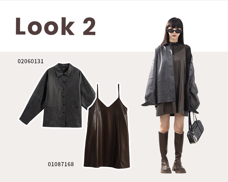 透膚黑高領內搭,咖啡色V領皮革短洋裝展現俐落線條,散發時髦感。 墨色皮革排釦外套刷舊設計增添復古魅力,寬鬆版型動作更自在。 下身咖啡色長靴拉長腿部比例,整體色調沉穩有型,呈現中性街頭風格。 皮革元素結合深咖啡調,打造成熟又帶個性的秋冬造型,時髦又帶態度,讓人一眼就注意到穿搭亮點。