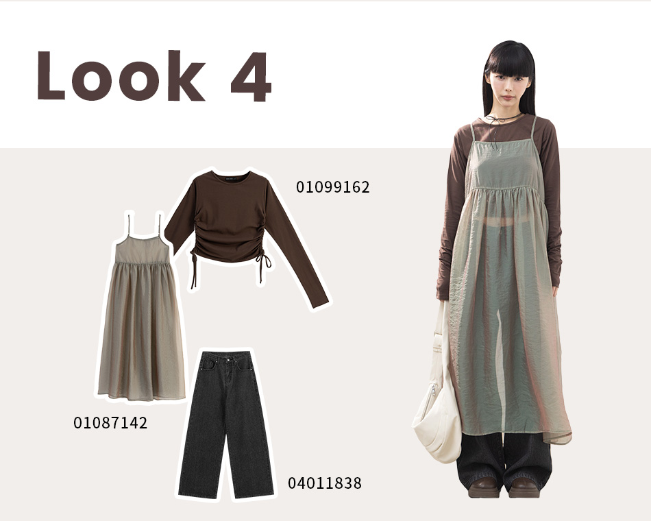 咖啡色側抽繩上衣作為基底,小巧抽繩設計可調整長度,玩出不同造型感。 外層微綠光澤透膚罩衫,傘狀飄逸下擺隨步伐搖曳,增添動態魅力。 刷色低腰牛仔褲修飾腿型比例,與罩衫形成趣味對比。 整體結合柔美與咖啡色調,輕盈又活潑,秋天日常穿搭立刻有趣又有型。