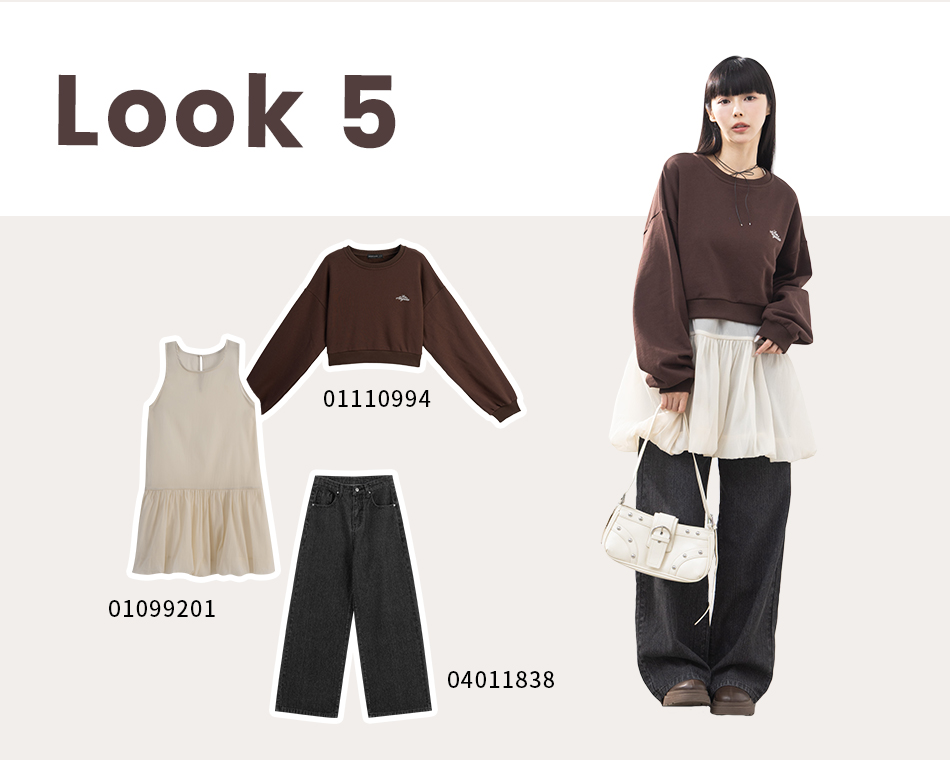 咖啡色短衛衣作為焦點,上面Los Angeles刺繡低調帶街頭感。 內搭杏色透膚氣球下擺罩衫,紗質飄逸感滿分,下擺花苞設計增添造型亮點。 刷色低腰牛仔褲貼合腿型比例,拉長線條又帶立體感。 整體咖啡色系搭配透膚元素,輕鬆打造甜美又舒適的初秋LOOK,隨便走到哪都活力十足!