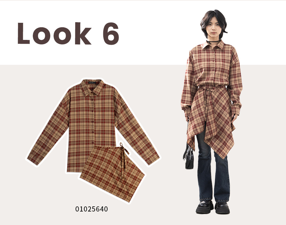 紅色格紋襯衫上層,裙簾細節圍腰增加趣味感,布料柔軟親膚又好活動。 下身黑藍牛仔喇叭褲微貼腿型,拉長比例,襯衫兩件式設計與裙簾相呼應,增加穿搭變化。 整體以紅色與咖啡色調點綴,活潑街頭感滿分,初秋造型輕鬆好看又有特色,隨手拍照就超上鏡。