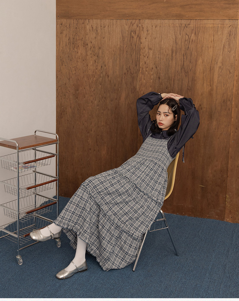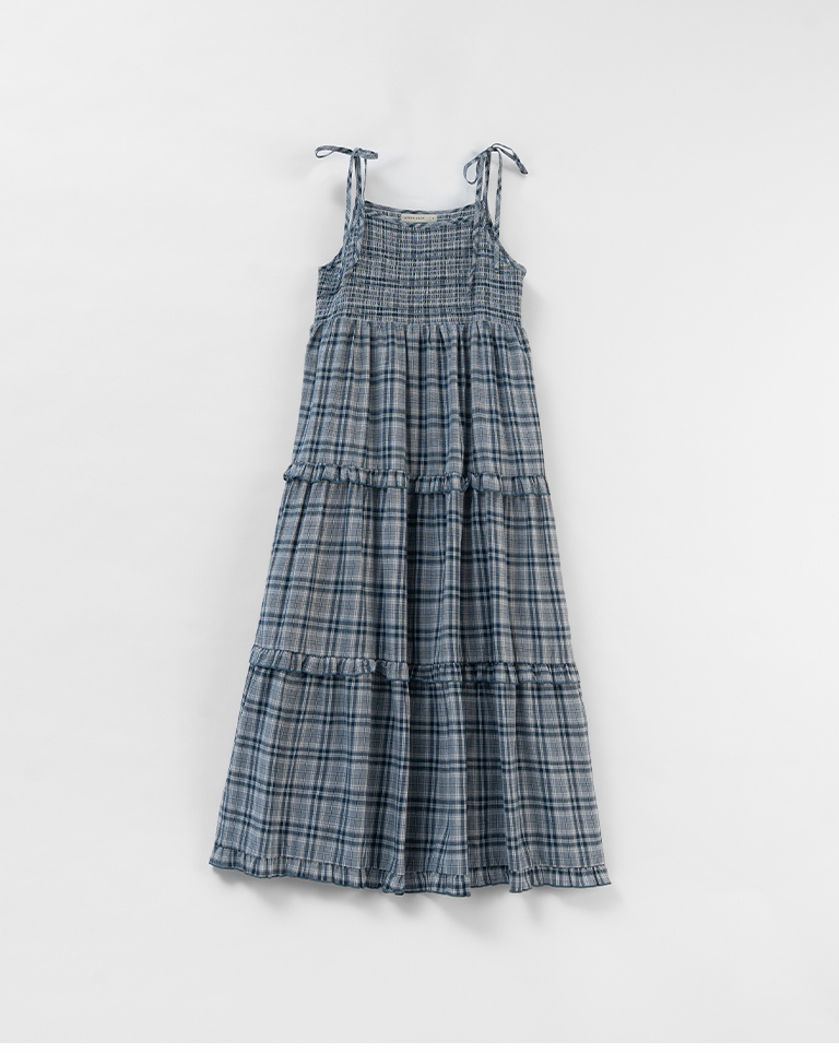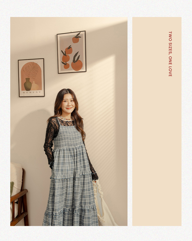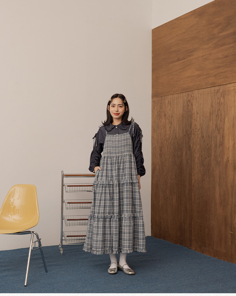 姵萱聯名 格紋荷葉細肩綁帶長洋裝-藍S/M